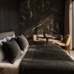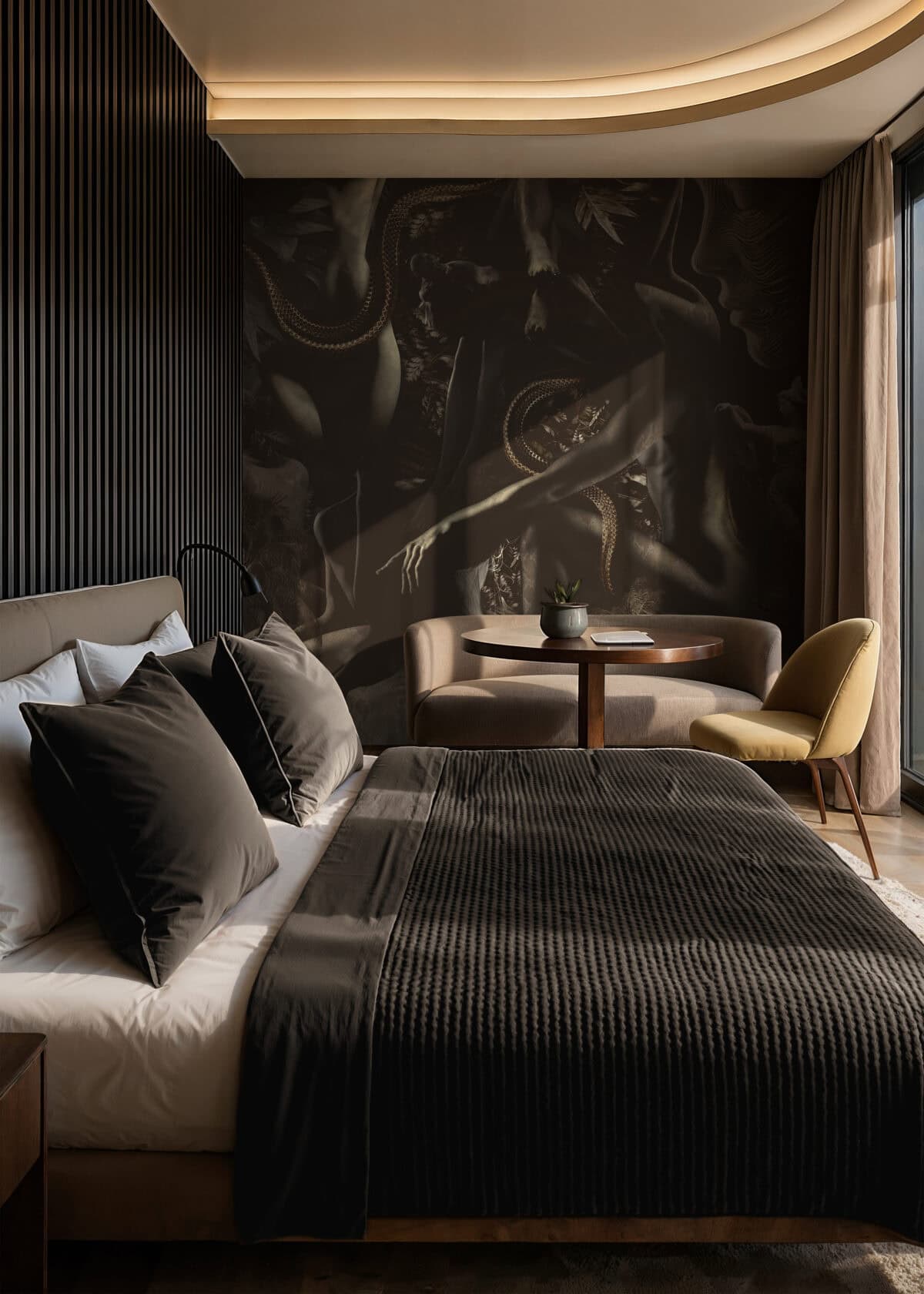 Ladies of Miami ist eine dramatische, exklusive Tapete für Penthouse-Suiten, die nahezu vollständig in gedämpftem Monochrom gehalten ist. Skulpturale weibliche Formen verflechten sich mit goldenen Schlangen, gefiederten Flügeln und fließenden Drapierungen, deren Körper mit der Chiaroscuro-Tiefe eines Renaissance-Meistergemäldes modelliert sind. Tiefe Holzkohletöne, warme Sepiatöne und Goldakzente schaffen eine intensiv atmosphärische Komposition, die zwischen dem Klassischen und dem Provokanten schwebt. Diese luxuriöse Wandbespannung für Innenarchitekten eignet sich für Schlafzimmer, private Lounges und hochwertige Hospitality-Suiten, wo Kühnheit und künstlerischer Anspruch willkommen sind. Als bespoke Wandmalerei für Wohnprojekte verleiht Ladies of Miami einer einzelnen Wand Museumsqualität im intimen Maßstab, sei es als luxuriöse Wandmalerei für Yachtinterieure oder ein privates Villa-Schlafzimmer spezifiziert.