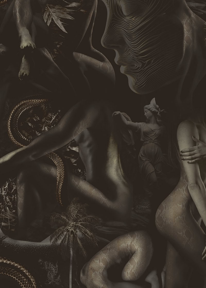 Ladies of Miami ist eine dramatische, exklusive Tapete für Penthouse-Suiten, die nahezu vollständig in gedämpftem Monochrom gehalten ist. Skulpturale weibliche Formen verflechten sich mit goldenen Schlangen,…