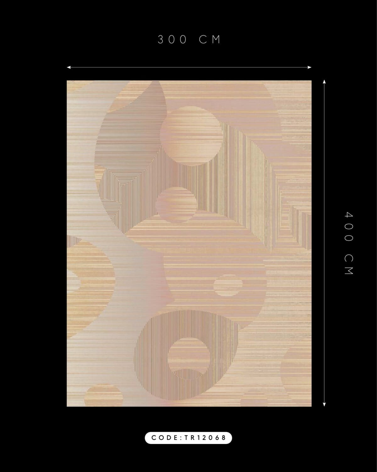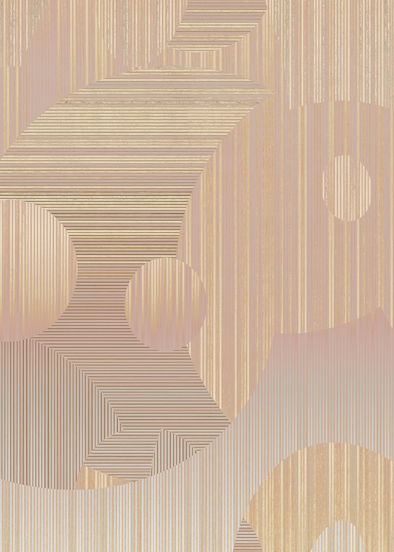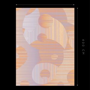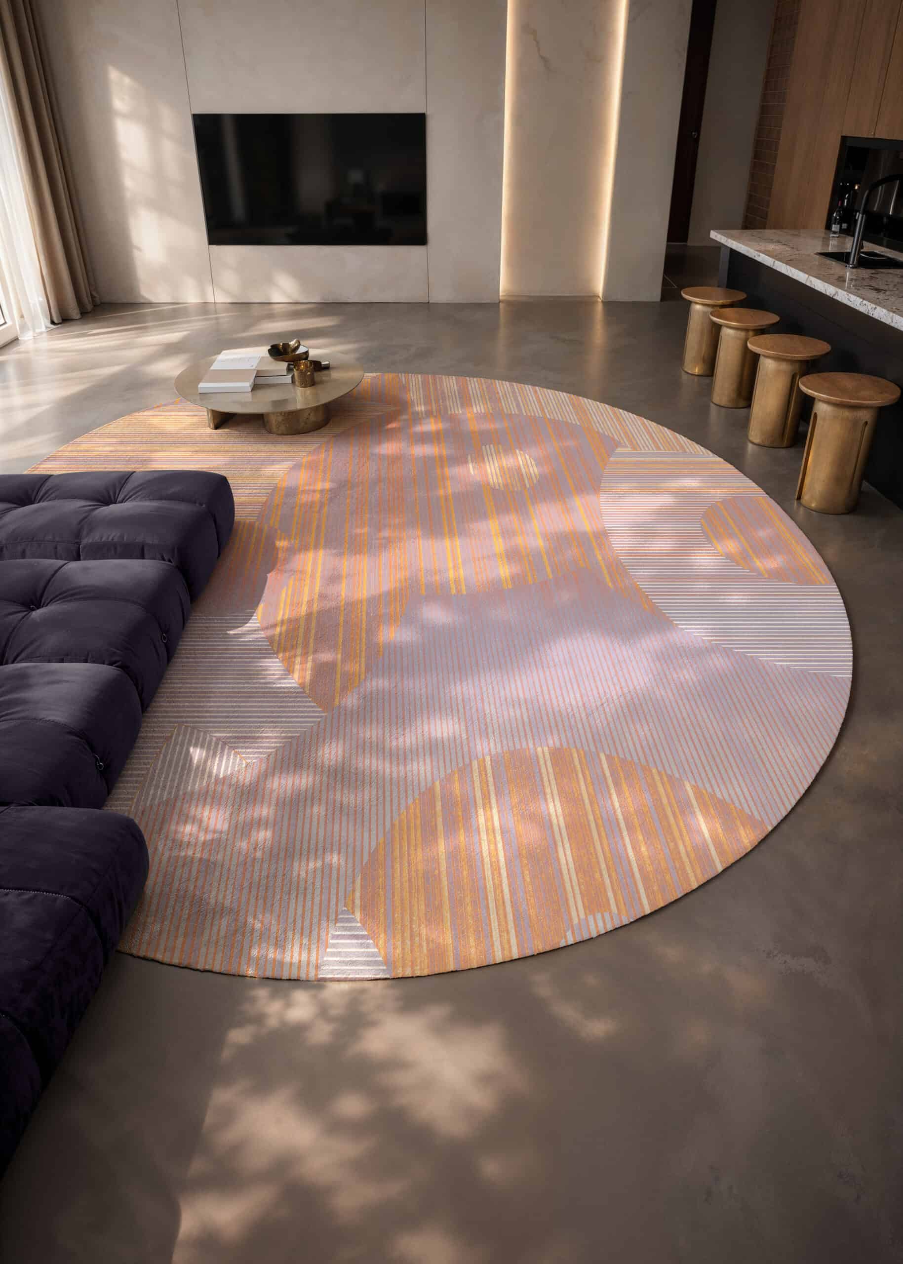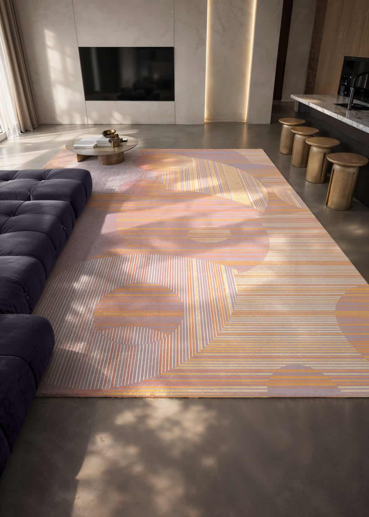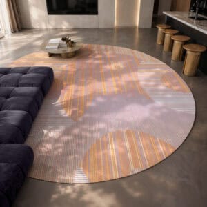 Lost in the Echo ist ein Luxusteppich für private Residenzen und Hospitality-Interieurs, der mit geometrischen Formen und Farben in einem unbeschwerten, nahezu spielerischen Register spielt. Übergroße Kreise und Bögen in sanftem Pfirsich, warmem Aprikot, blassem Lavendel und Creme überlappen sich auf einem fein gestreiften Untergrund und schaffen eine rhythmische, von der Op Art beeinflusste Komposition, die sich sowohl retro als auch völlig zeitgemäß anfühlt. Die erste Farbstellung (TR12067 / TR12069) kombiniert warme Sonnenuntergangstöne von Aprikot, Rosé und Gold mit kühlen Fliederakzenten; die zweite (TR12068 / TR12070) wird noch sanfter mit blassem Creme, warmem Elfenbein und staubigem Rosa für eine noch zartere, ätherische Stimmung. Verfügbar als 400×300 cm rechteckiger maßgeschneiderter Contract-Teppich oder in rundem Format mit 350 cm ist Lost in the Echo das leichteste und farbenfrohste Design der Cosmic Collection, ein bespoke Teppich für kommerzielle Projekte, der Optimismus und Energie in Hospitality-Räume bringt, ohne dabei auf Raffinesse zu verzichten. Innenarchitekten spezifizieren diesen Hospitality-Teppich für Hotelsuiten, kreative Büro-Lounges, Musterhauswohnzimmer und zeitgenössische Wohninterieurs, wo ein Designer-Teppich für Musterhäuser frisch, modern und sofort stimmungsaufhellend wirken muss.