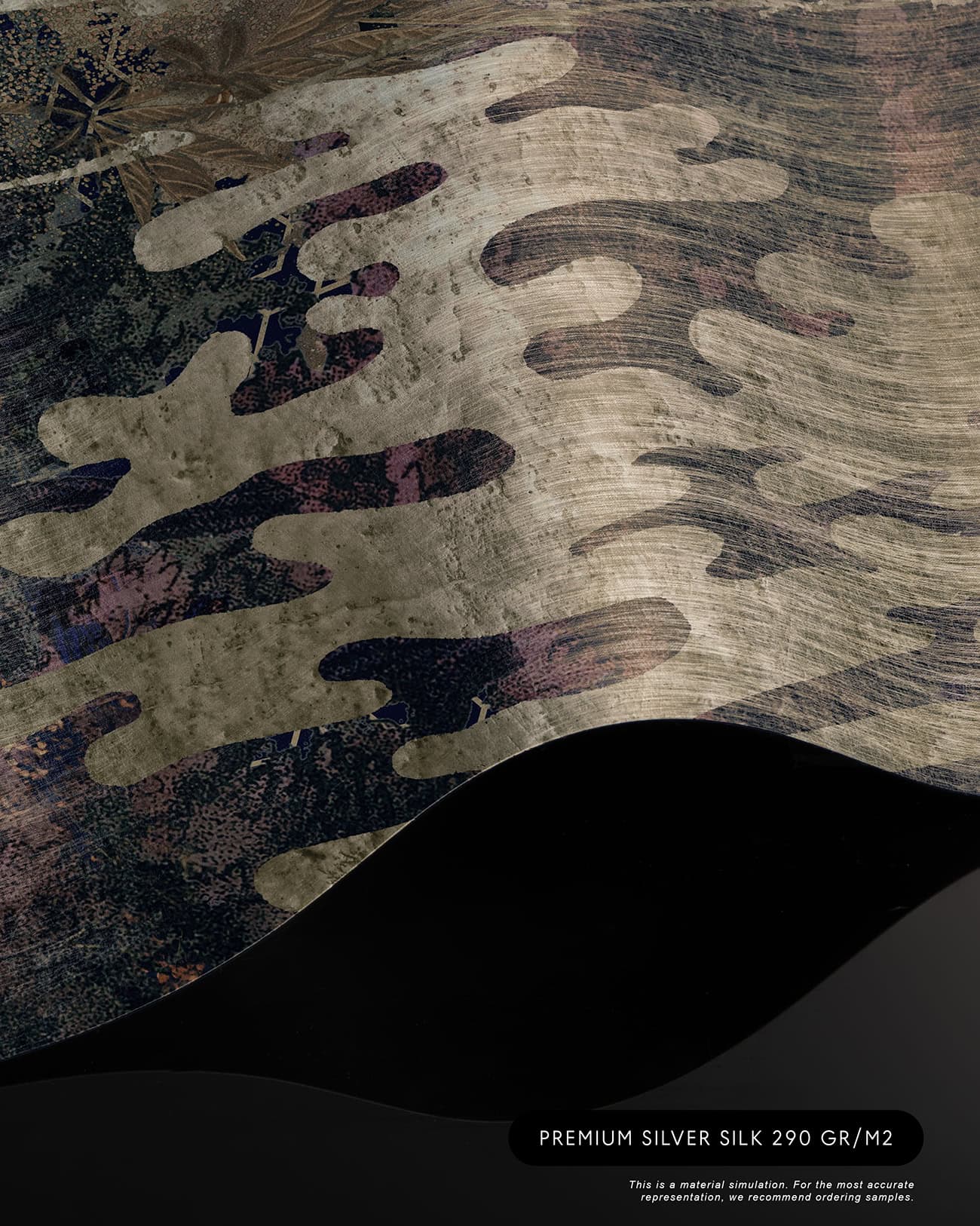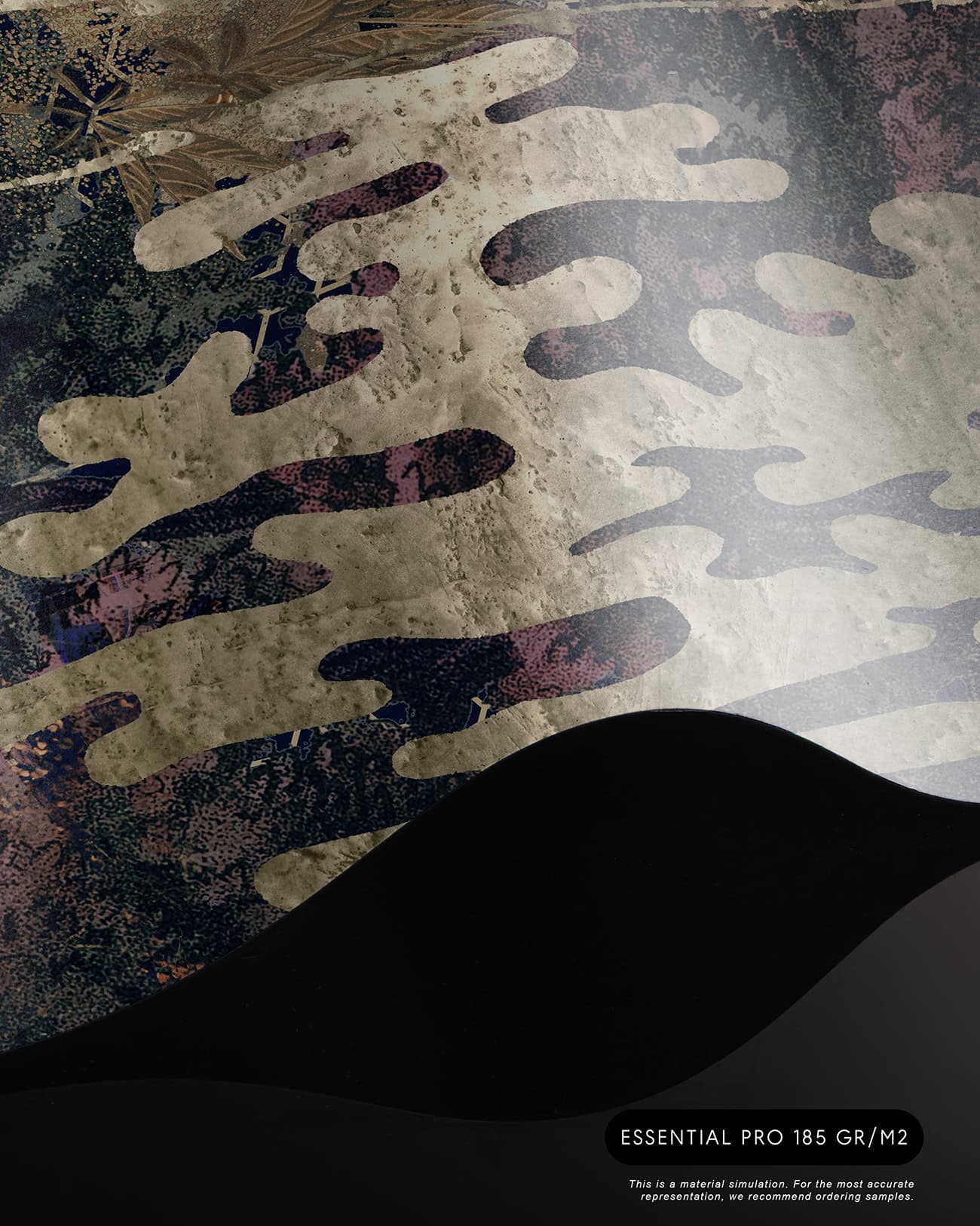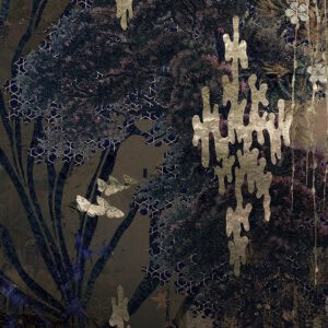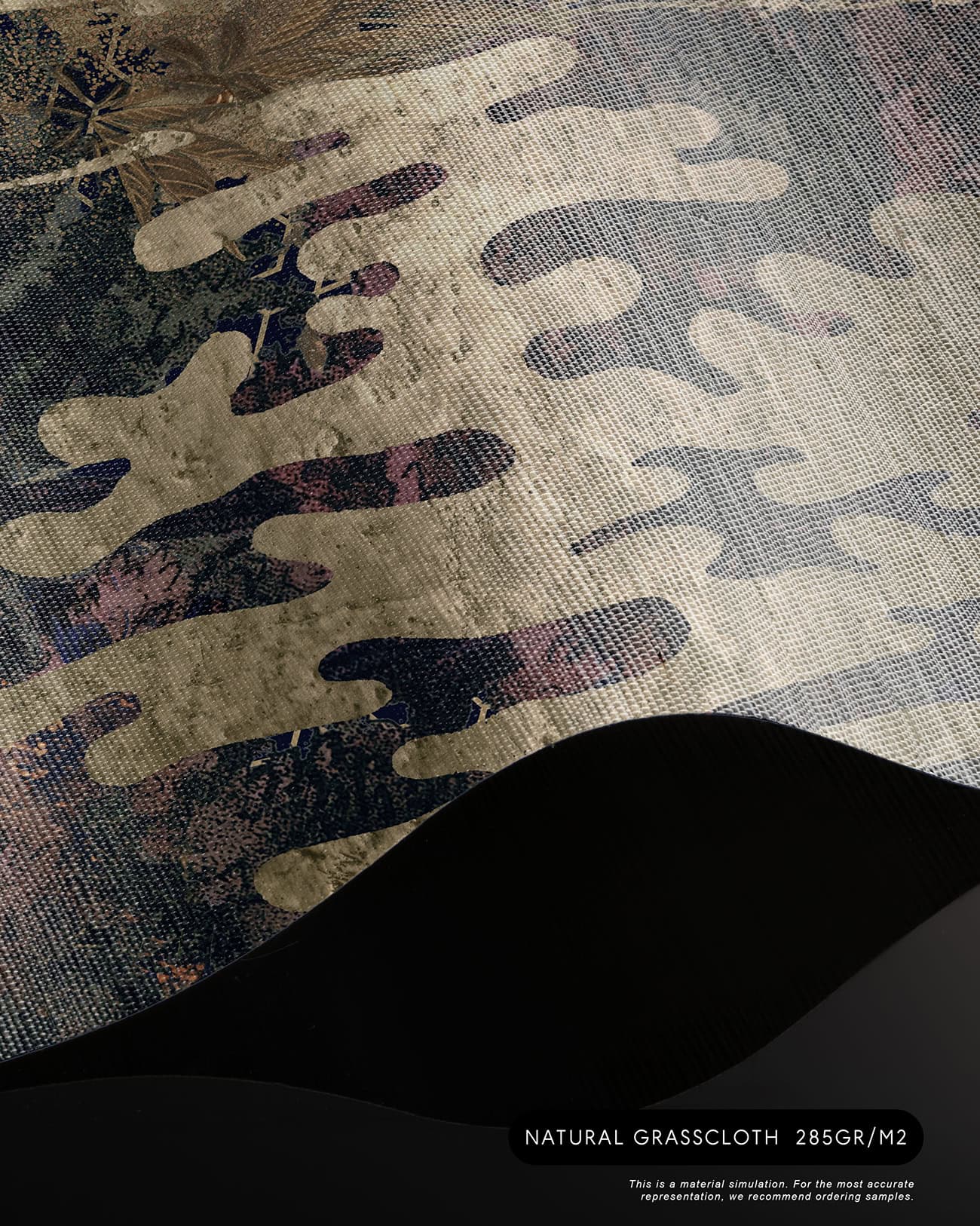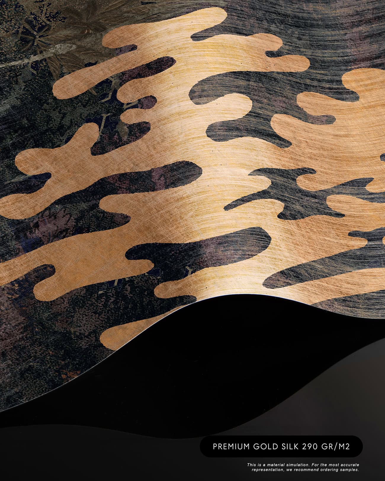 Amara is an exclusive wallpaper for penthouse interiors that plunges you into a nocturnal garden of extraordinary detail and mystery. Dense tropical foliage, ferns, palms and cascading vines, is layered beneath an overlay of molten, cloud-like metallic forms in aged gold, champagne and pewter that appear to drip and flow across the surface like liquid metal. Scattered butterflies, delicate flowers in purple, teal and dusty rose, and a hexagonal geometric lattice in deep cobalt punctuate the darkness, lending the design the richness of a jewelled tapestry lit by candlelight. This luxury wallcovering for interior designers is designed for spaces that celebrate bold artistry and narrative depth: luxury hotel bathrooms, opulent dining rooms and private villa master suites. As a bespoke mural for residential projects and custom mural for hotel lobbies, Amara transforms a wall into an immersive experience, a surface that rewards every glance with new details, meeting the most demanding hospitality wallcovering specification for architects working on high-end residential and boutique hospitality developments.
