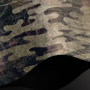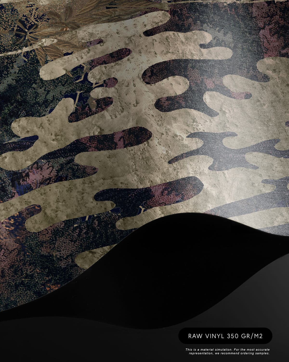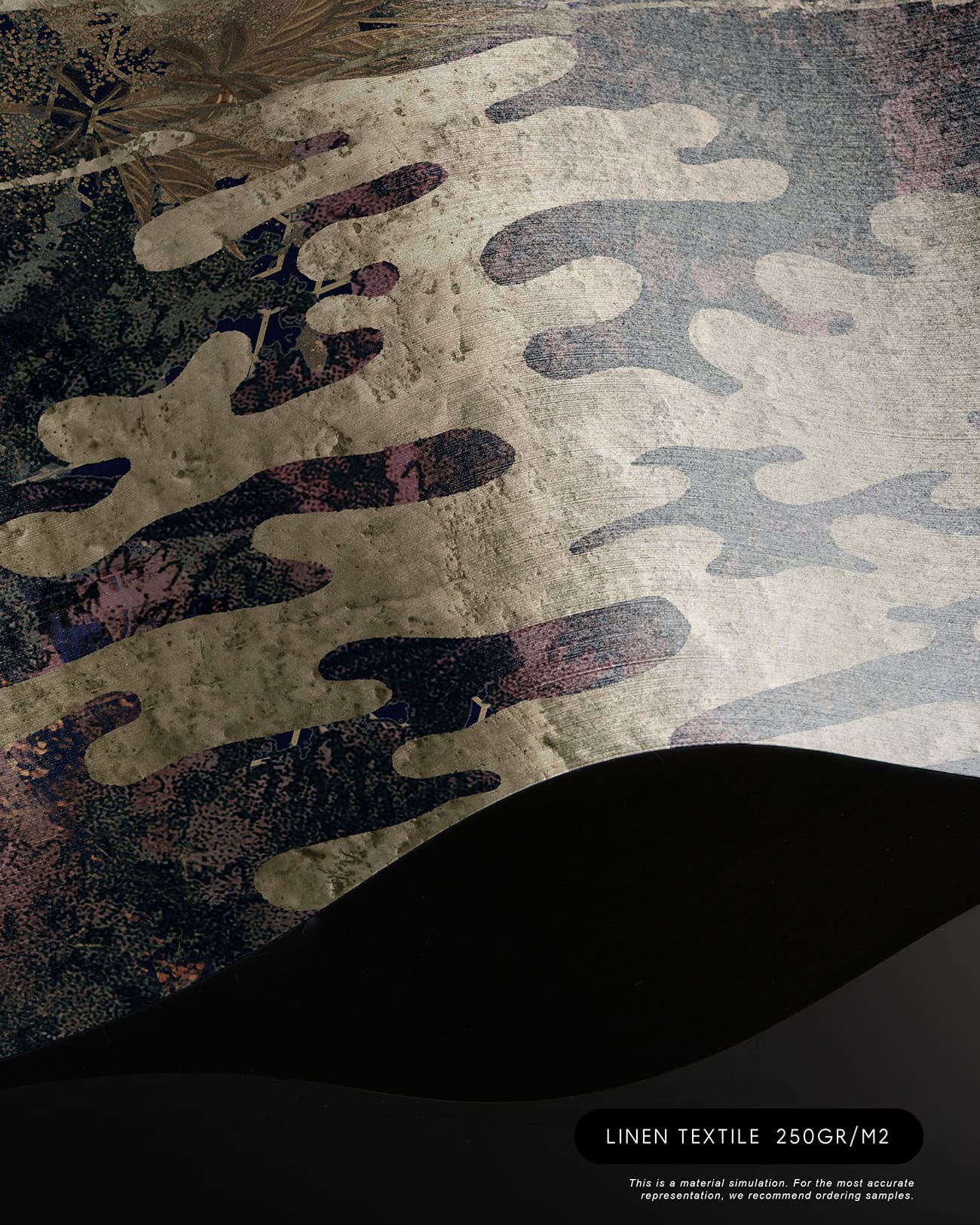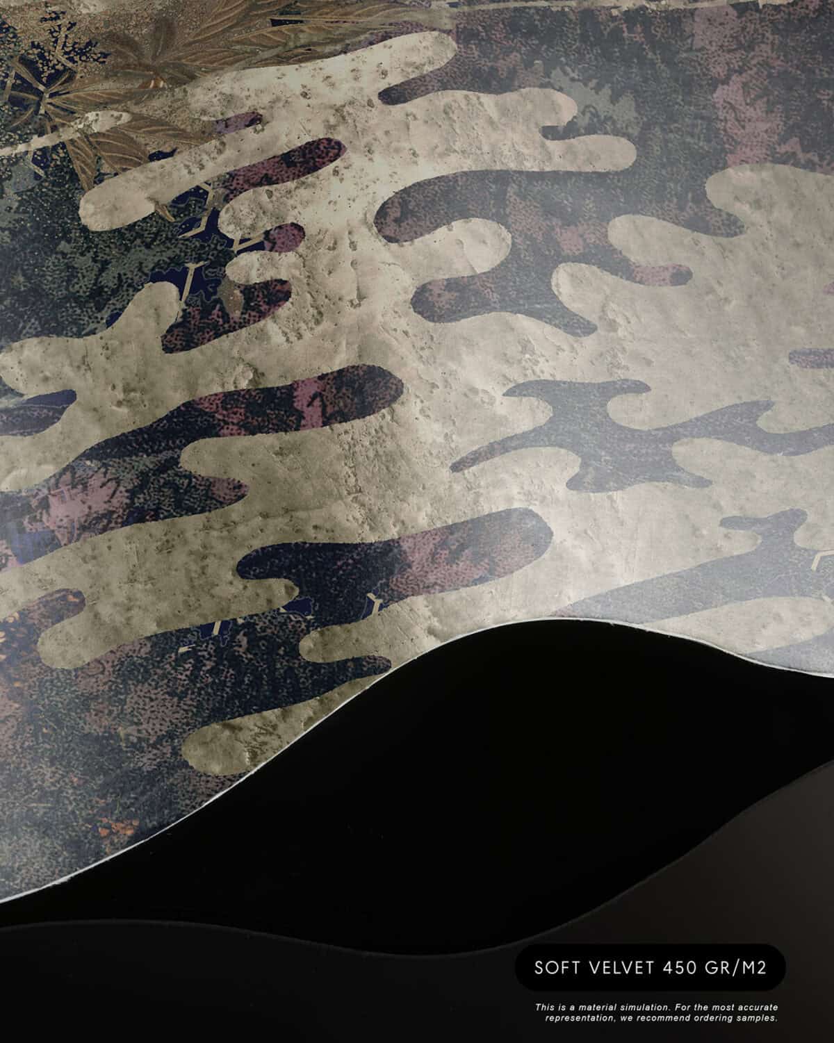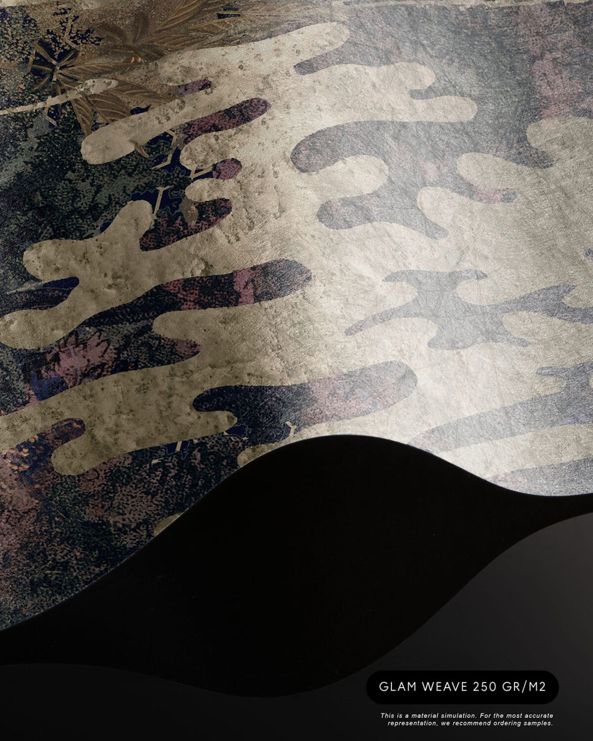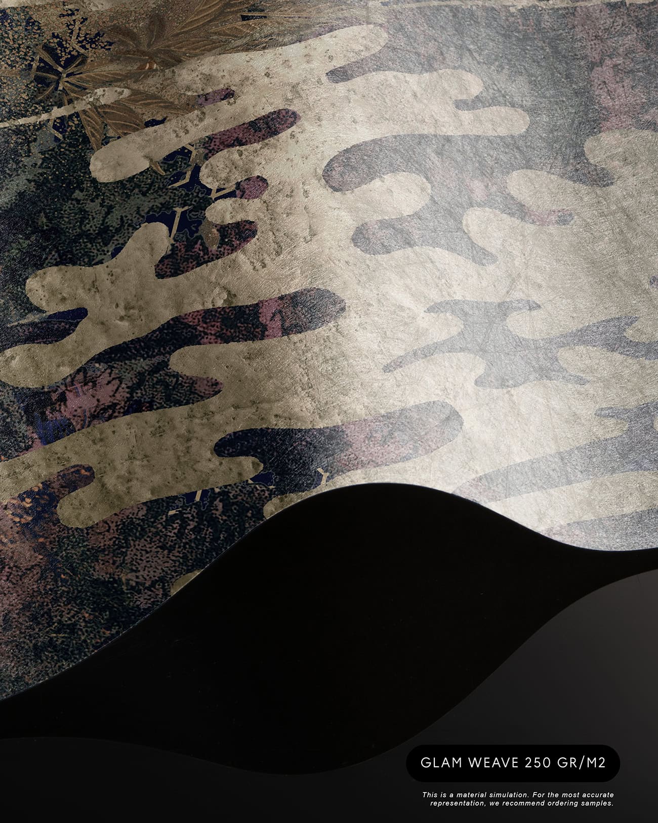 Amara is an exclusive wallpaper for penthouse interiors that plunges you into a nocturnal garden of extraordinary detail and mystery. Dense tropical foliage, ferns, palms and cascading vines, is layered beneath an overlay of molten, cloud-like metallic forms in aged gold, champagne and pewter that appear to drip and flow across the surface like liquid metal. Scattered butterflies, delicate flowers in purple, teal and dusty rose, and a hexagonal geometric lattice in deep cobalt punctuate the darkness, lending the design the richness of a jewelled tapestry lit by candlelight. This luxury wallcovering for interior designers is designed for spaces that celebrate bold artistry and narrative depth: luxury hotel bathrooms, opulent dining rooms and private villa master suites. As a bespoke mural for residential projects and custom mural for hotel lobbies, Amara transforms a wall into an immersive experience, a surface that rewards every glance with new details, meeting the most demanding hospitality wallcovering specification for architects working on high-end residential and boutique hospitality developments.