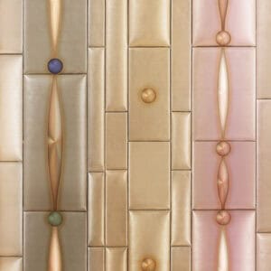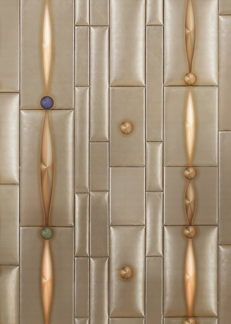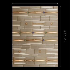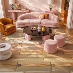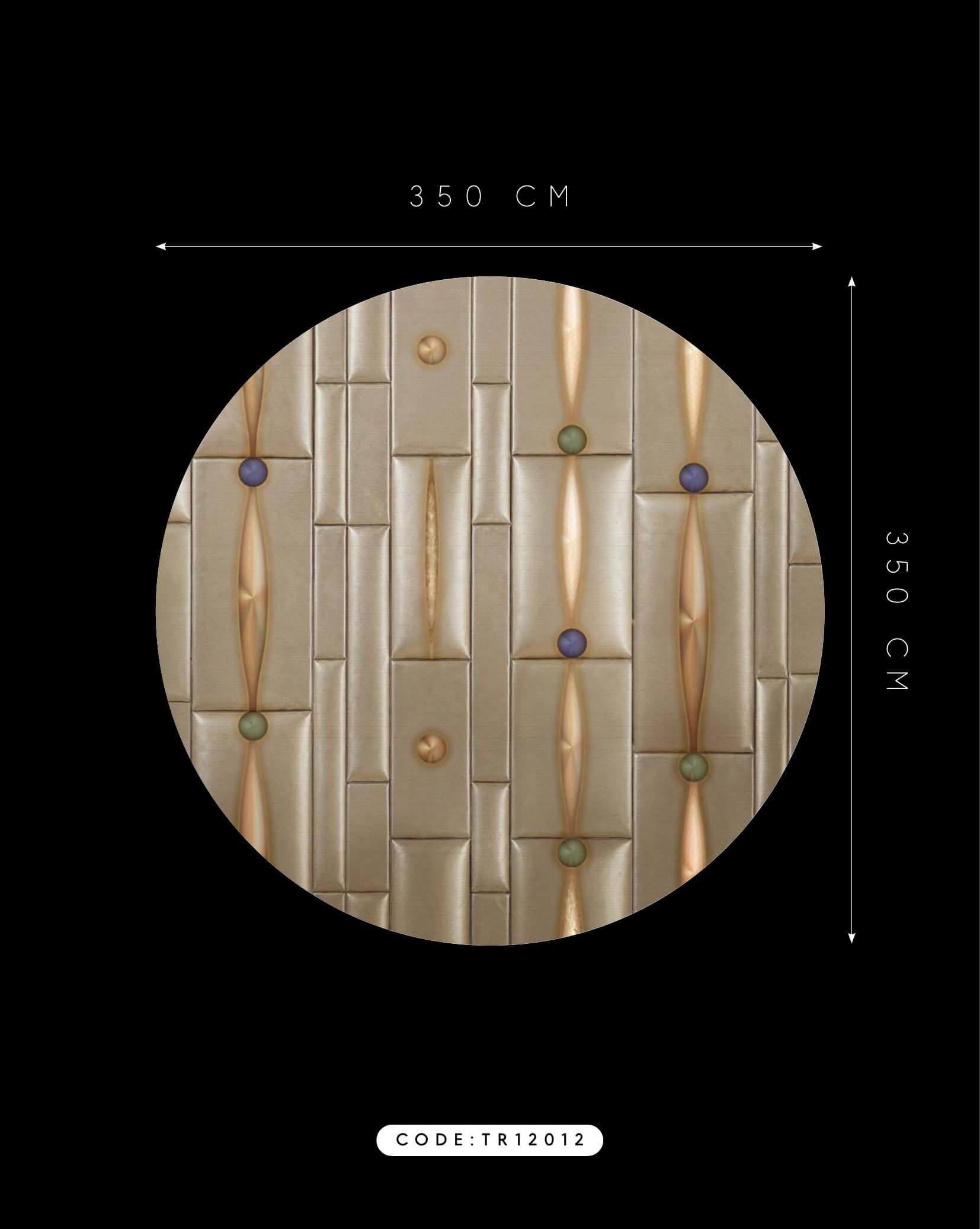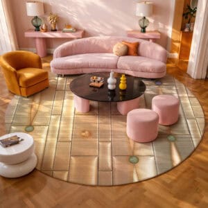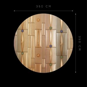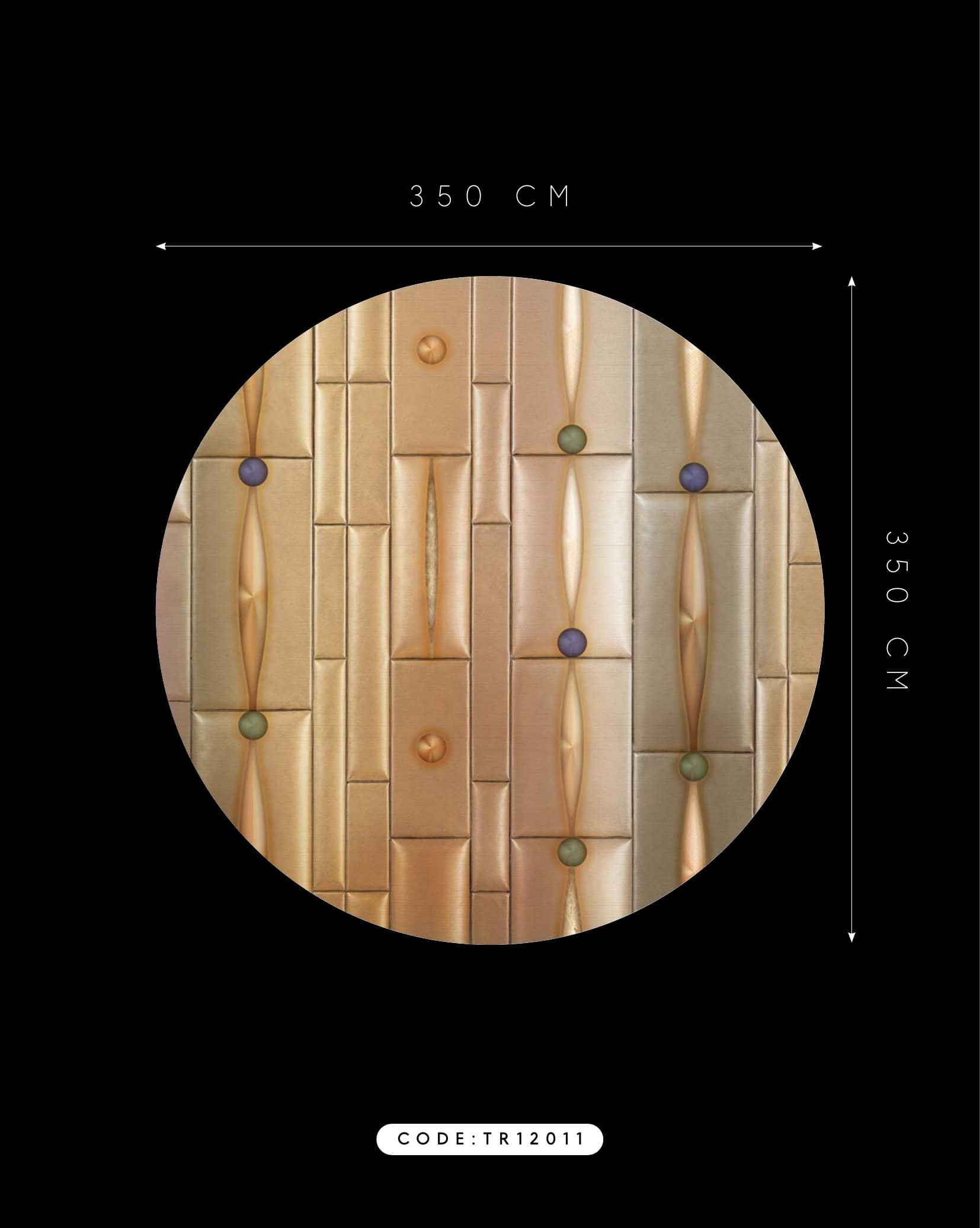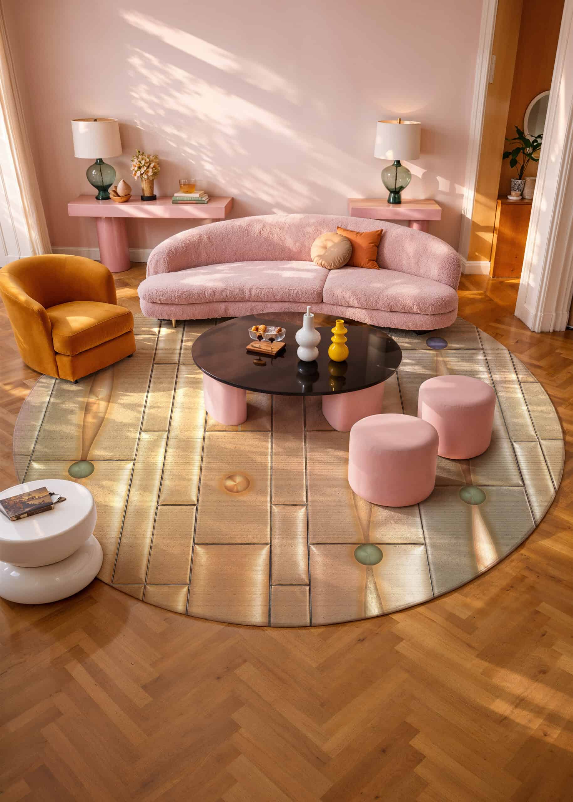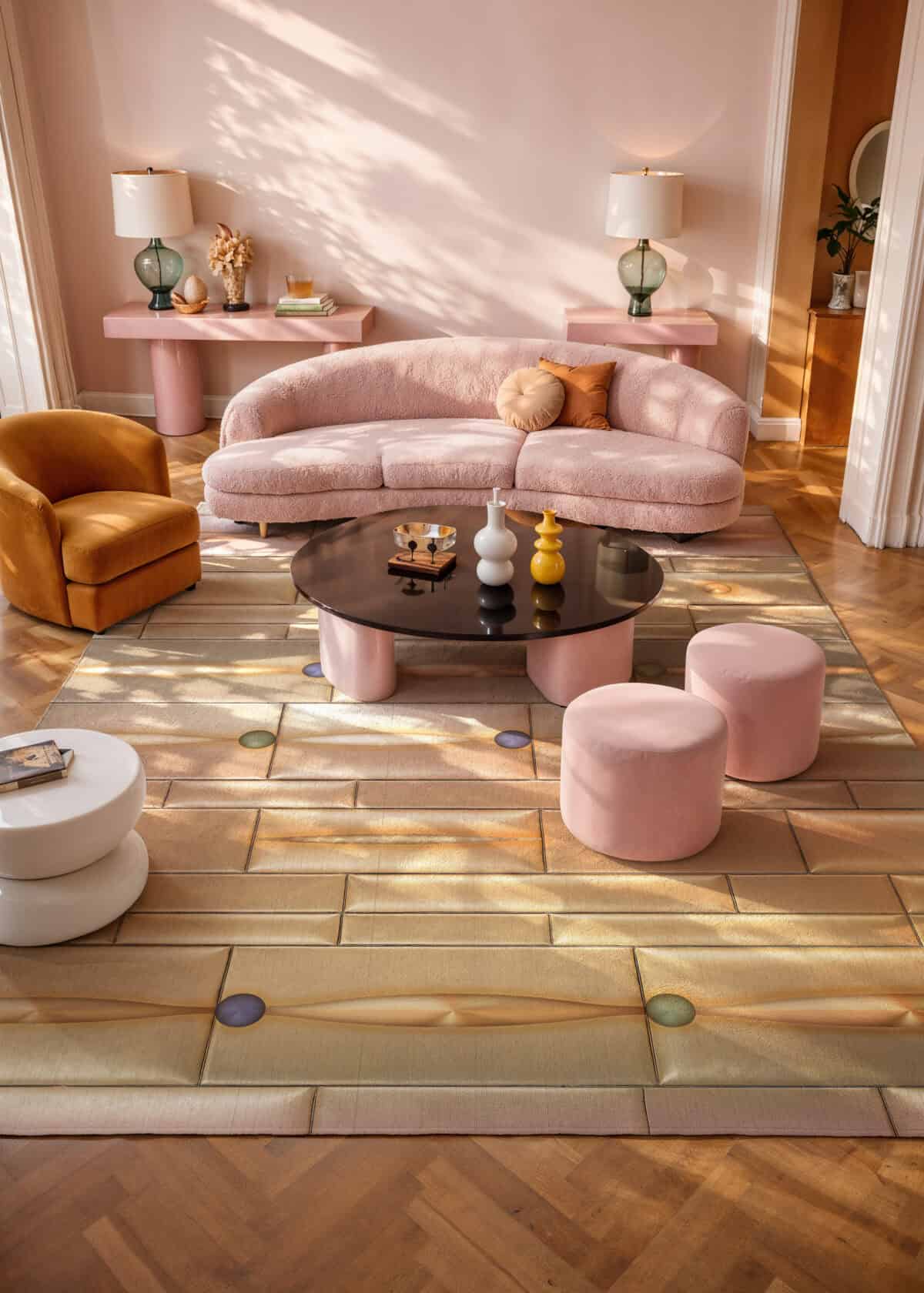 Beaded Gold is a luxury rug for private residences that transforms the floor into a softly luminous surface of sculpted metal and pastel light. Faceted vertical panels in warm champagne, rose gold and brushed platinum interlock like hand-wrought metalwork, punctuated by small jewel-like spheres in jade, cobalt and soft amber that float across the composition like scattered gemstones. The first colourway (TR12009 / TR12011) glows with a blush-gold warmth perfectly suited to feminine, sun-drenched interiors; the second (TR12010 / TR12012) pulls the palette into cooler silver and platinum tones with deeper metallic shadow. Available as a 400×300 cm rectangular custom contract rug or a 350 cm round format, Beaded Gold brings the opulence of a gilded Art Deco ceiling to floor level. This bespoke rug for commercial projects excels in boutique hotel lobbies, high-end retail showrooms and penthouse living rooms where designers require a hospitality rug that reads as both sculptural and serene. Printed on Tuskara’s premium rug bases, it pairs the visual richness of hand-crafted precious metalwork with the practicality of contract-grade flooring.