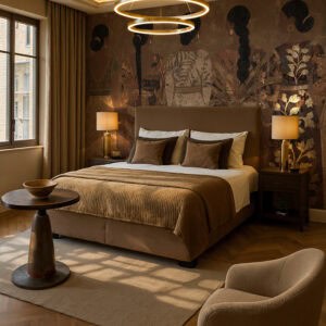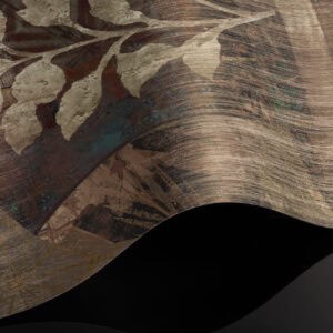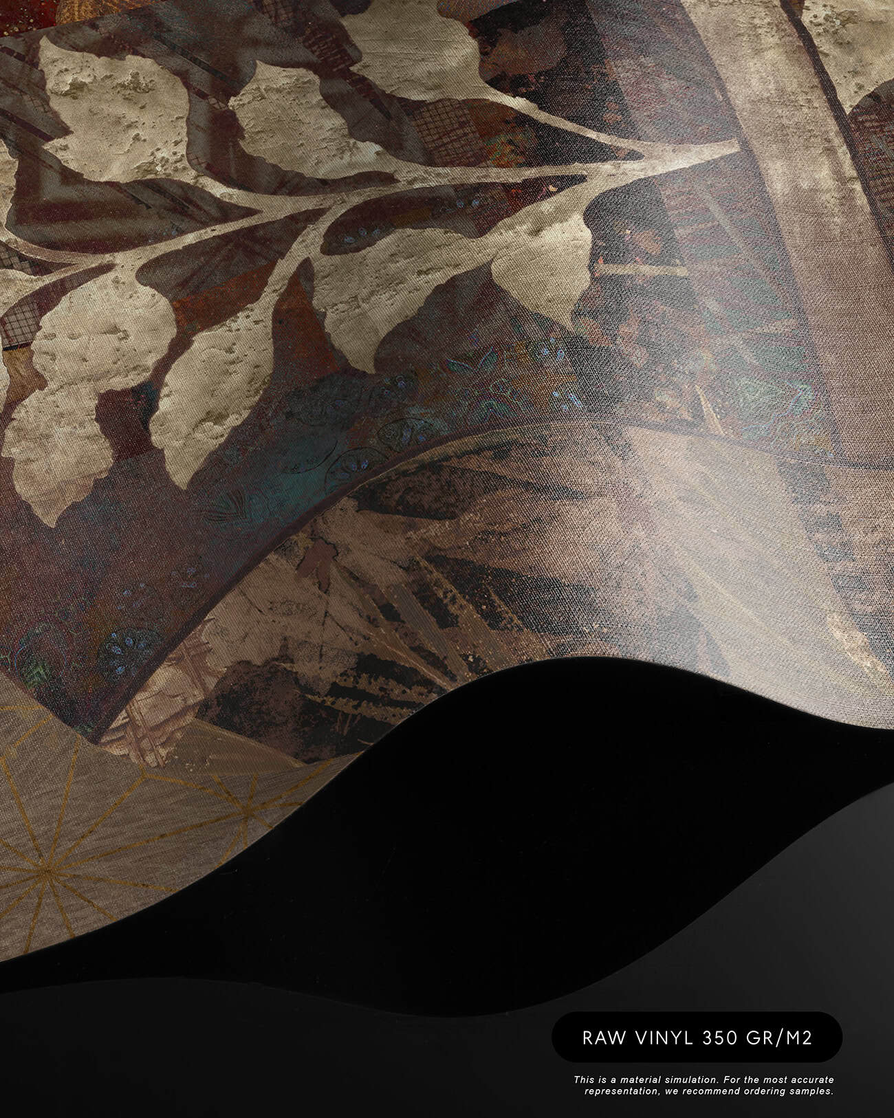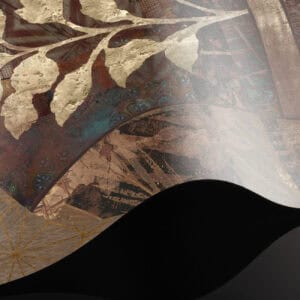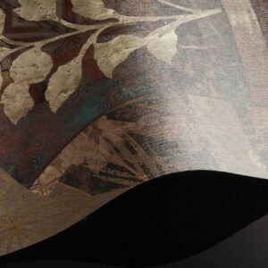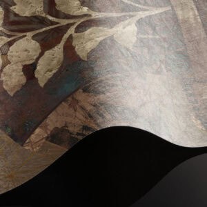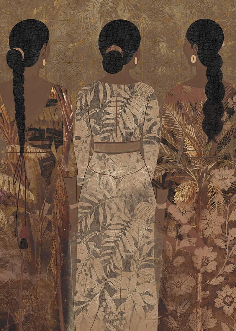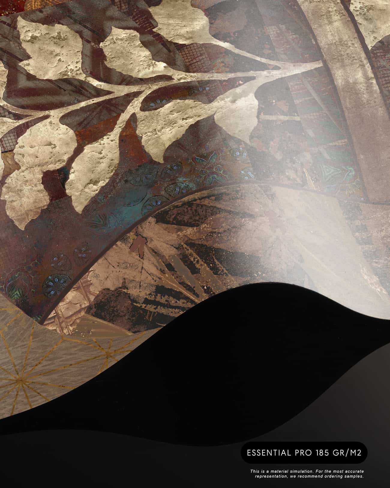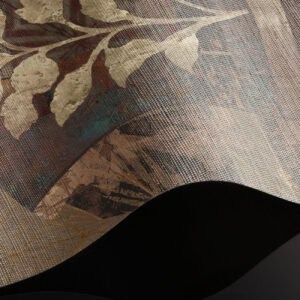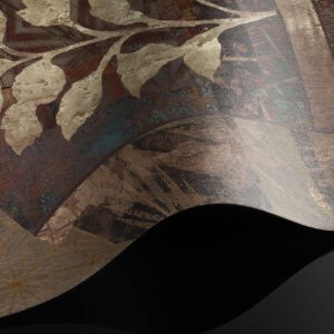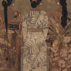 Cashmere is a bespoke mural for residential projects that celebrates feminine grace through an artful collage of figures dressed in richly patterned robes. Four women stand side by side, their silhouettes framed by intricate botanical motifs, tropical leaves, seed pods and ornamental florals woven into the fabric of their garments. The palette is warm and tonal: deep bronze, soft gold, dusty rose and espresso, layered over a textured, time-worn ground that recalls aged fresco. This architectural wallcovering bridges cultural storytelling with contemporary luxury, making it a natural choice for boutique hotel interiors and high-end interior finish wallpaper in curated hospitality environments. Produced in an extra-wide mural format, Cashmere creates an elegant focal wall with the presence and quality that architects and interior designers demand for their most distinctive projects.