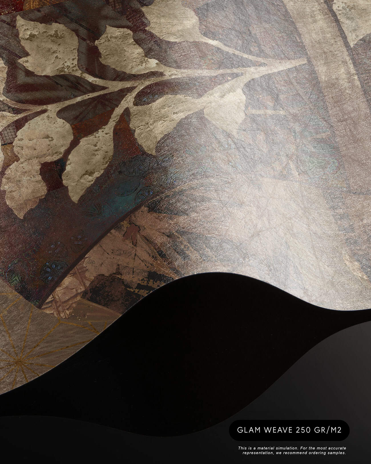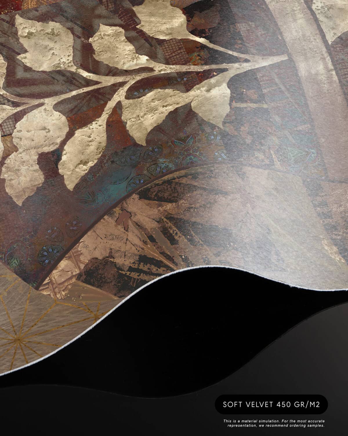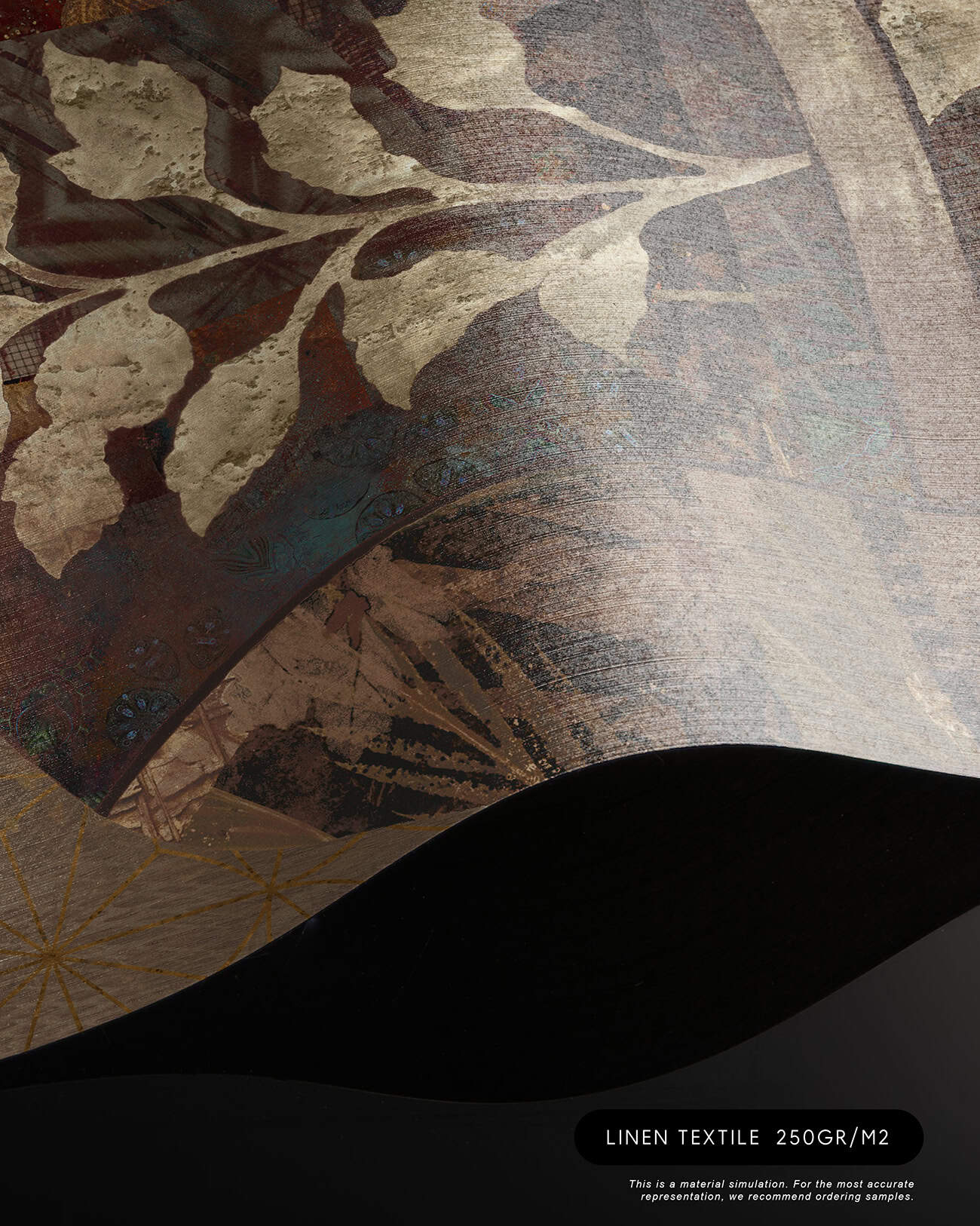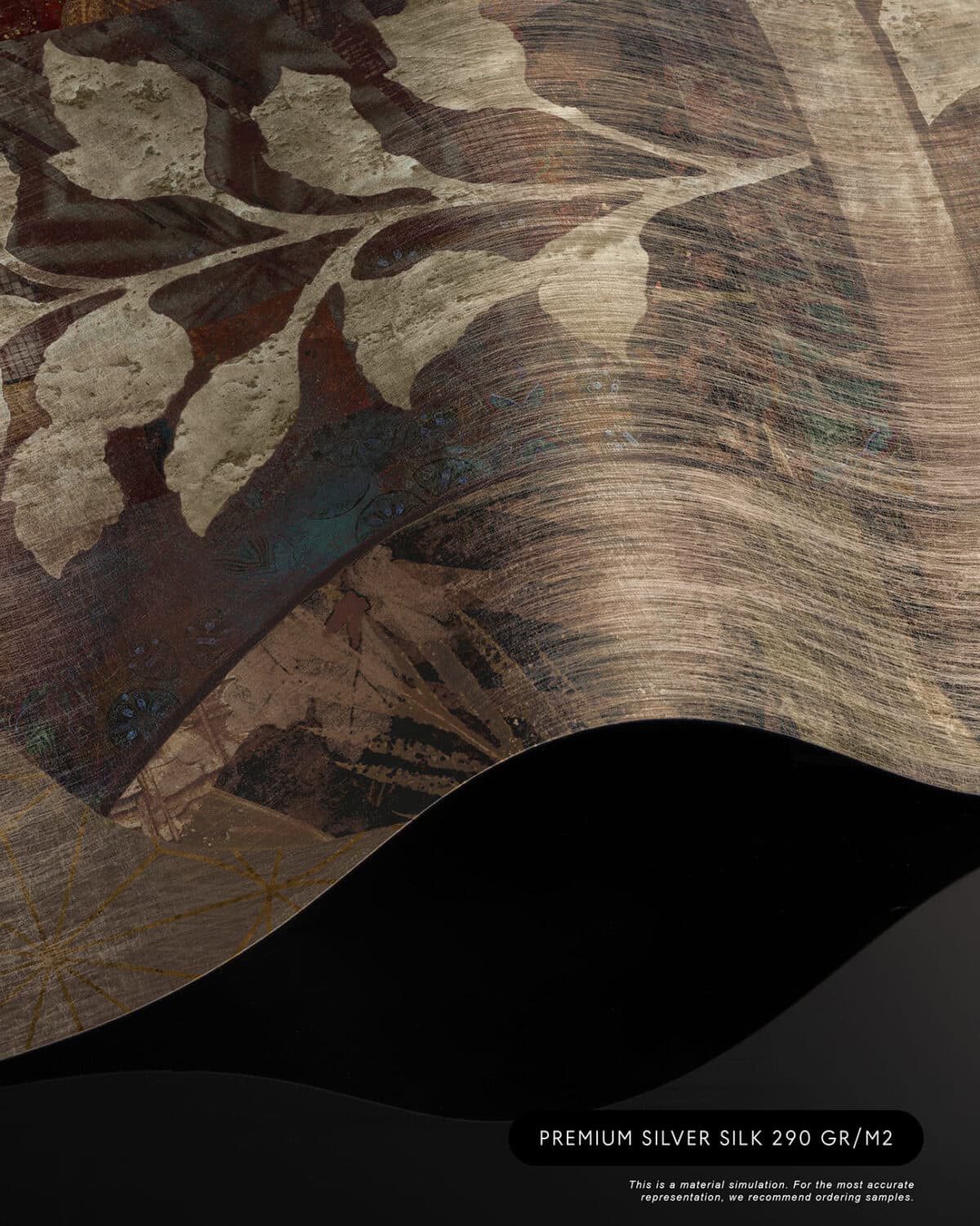 Cashmere is a bespoke mural for residential projects that celebrates feminine grace through an artful collage of figures dressed in richly patterned robes. Four women stand side by side, their silhouettes framed by intricate botanical motifs, tropical leaves, seed pods and ornamental florals woven into the fabric of their garments. The palette is warm and tonal: deep bronze, soft gold, dusty rose and espresso, layered over a textured, time-worn ground that recalls aged fresco. This architectural wallcovering bridges cultural storytelling with contemporary luxury, making it a natural choice for boutique hotel interiors and high-end interior finish wallpaper in curated hospitality environments. Produced in an extra-wide mural format, Cashmere creates an elegant focal wall with the presence and quality that architects and interior designers demand for their most distinctive projects.