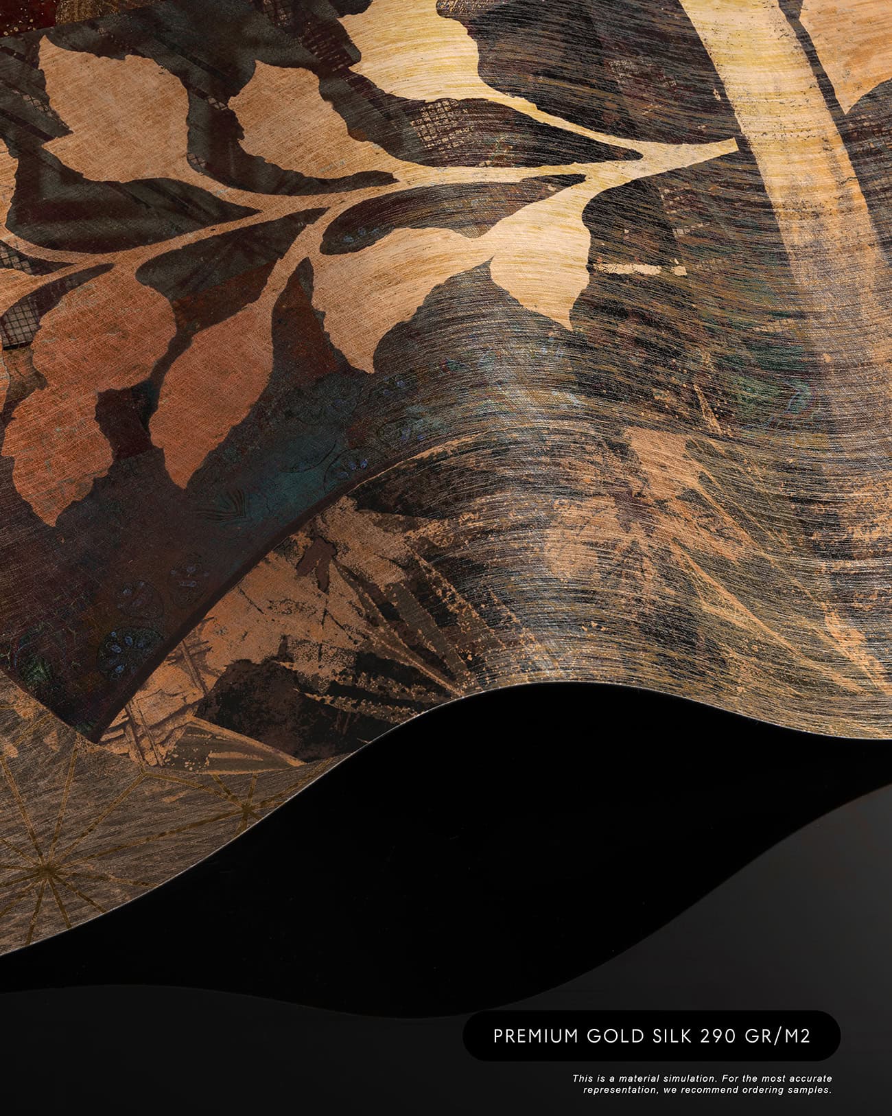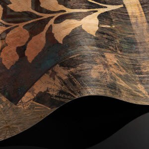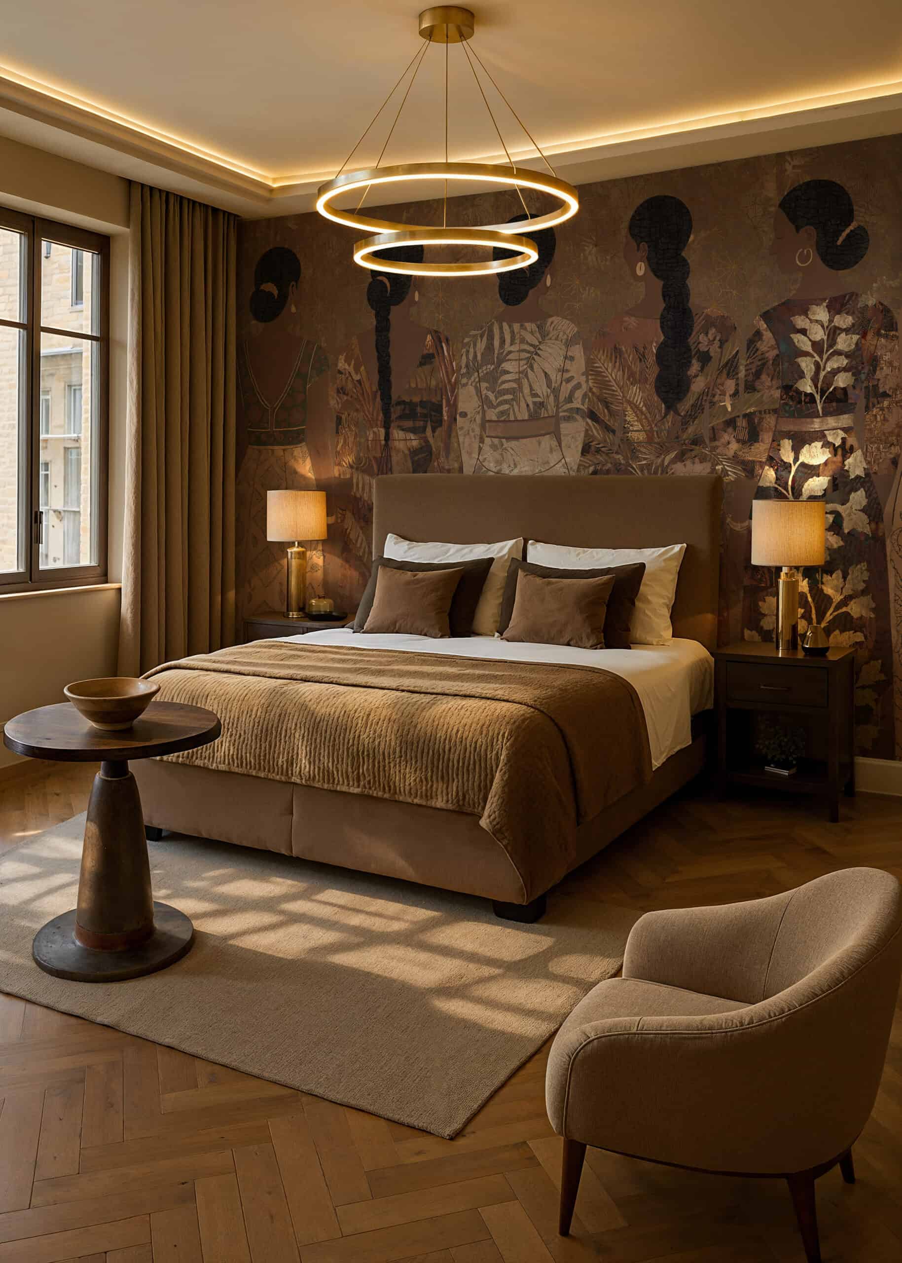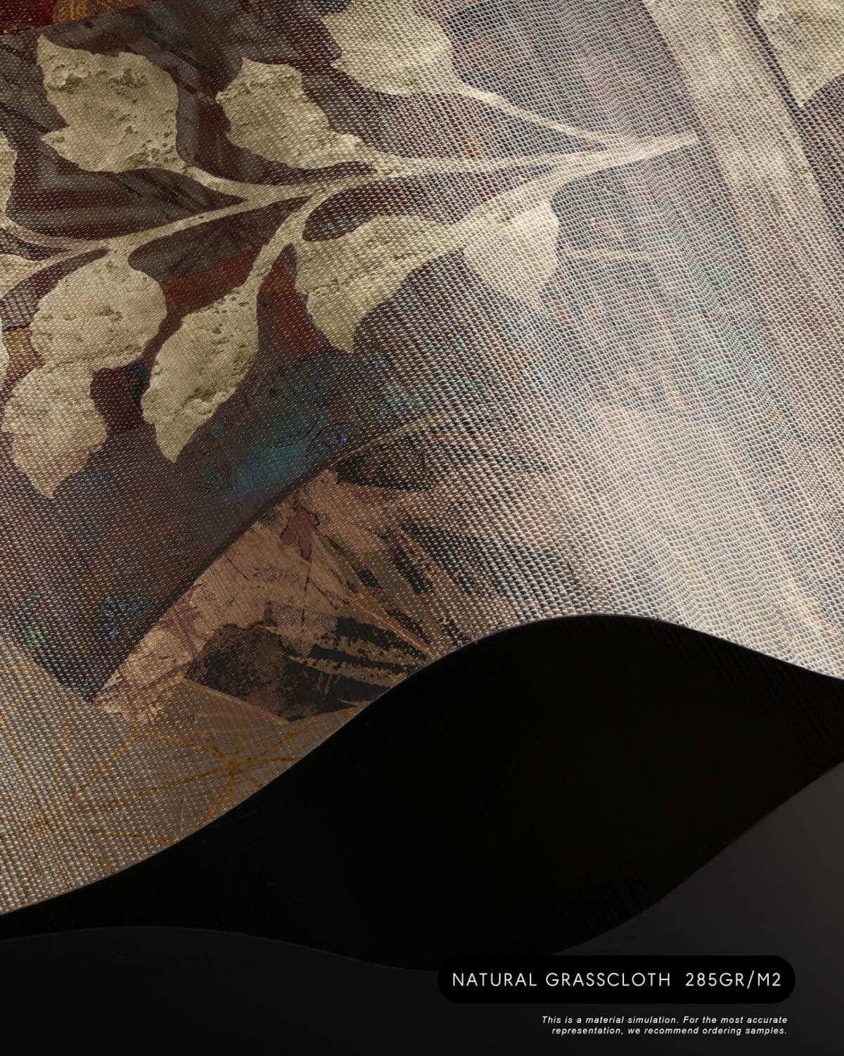 Cashmere is a bespoke mural for residential projects that celebrates feminine grace through an artful collage of figures dressed in richly patterned robes. Four women stand side by side, their silhouettes framed by intricate botanical motifs, tropical leaves, seed pods and ornamental florals woven into the fabric of their garments. The palette is warm and tonal: deep bronze, soft gold, dusty rose and espresso, layered over a textured, time-worn ground that recalls aged fresco. This architectural wallcovering bridges cultural storytelling with contemporary luxury, making it a natural choice for boutique hotel interiors and high-end interior finish wallpaper in curated hospitality environments. Produced in an extra-wide mural format, Cashmere creates an elegant focal wall with the presence and quality that architects and interior designers demand for their most distinctive projects.