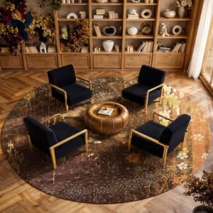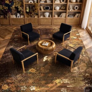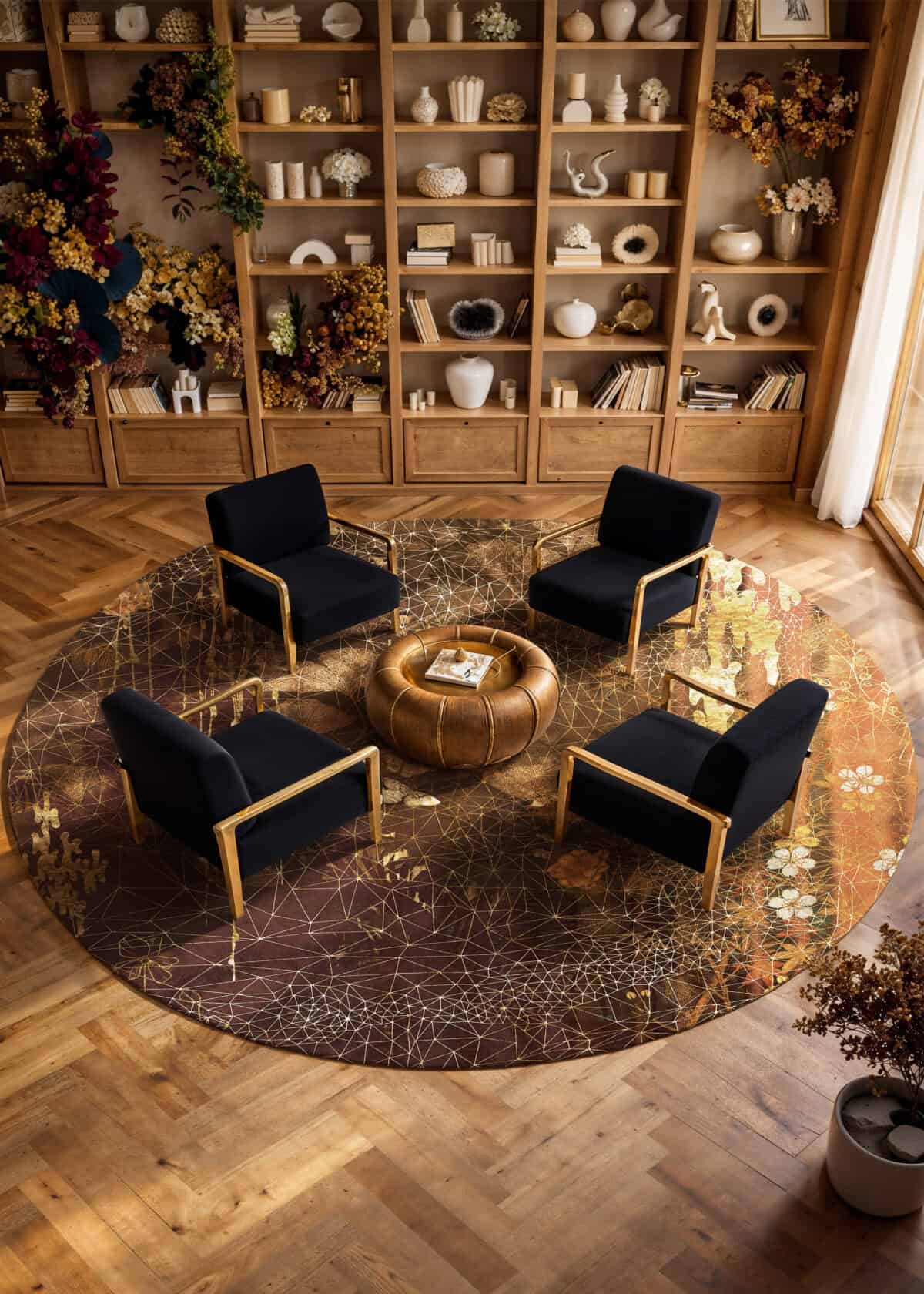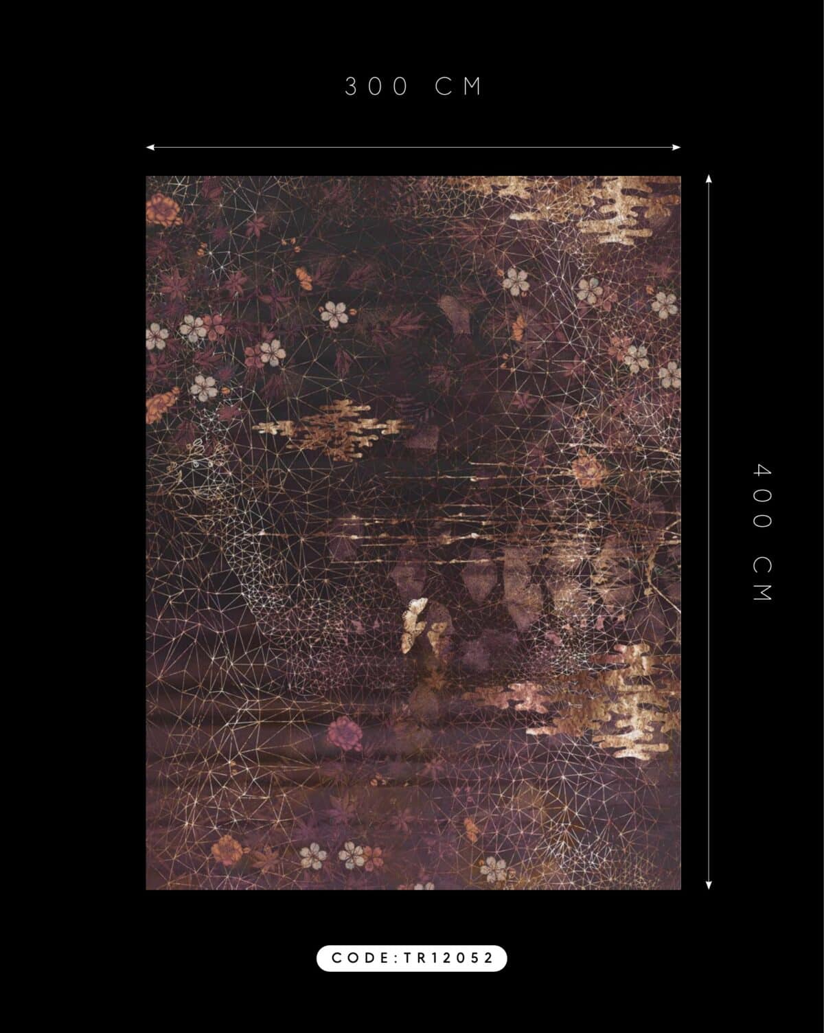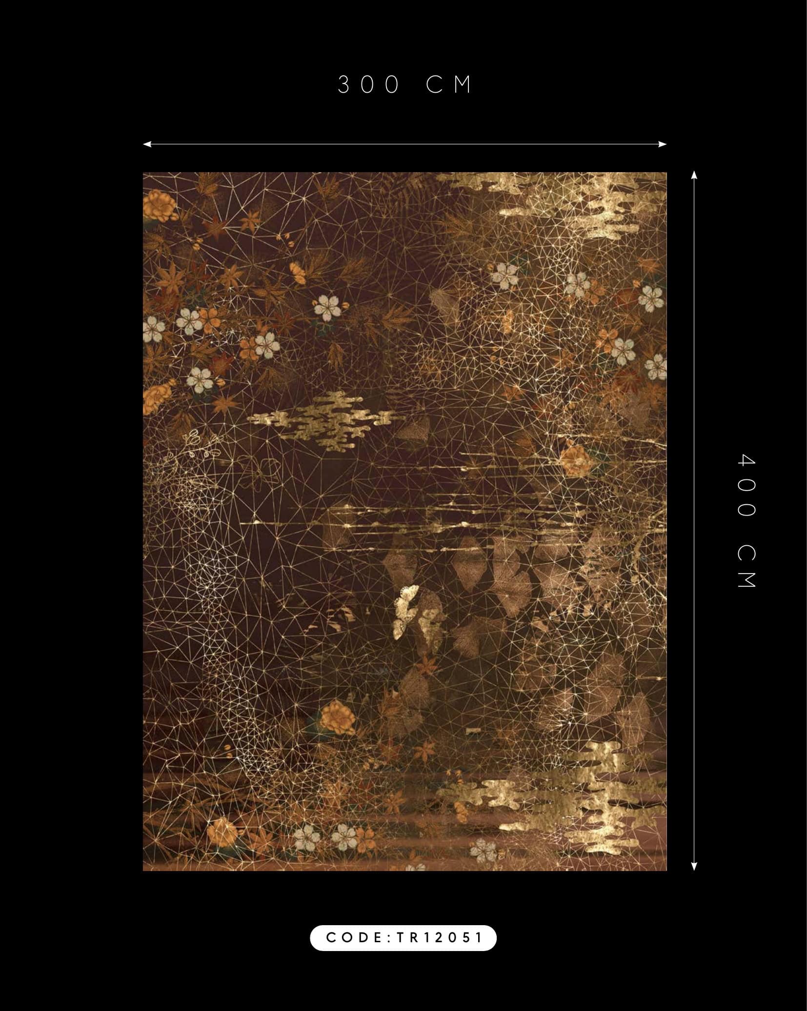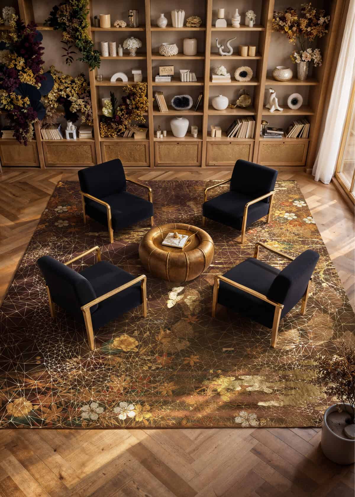 Goddess of Orion is a luxury rug for private residences that layers delicate botanical forms, cascading golden droplets and an intricate web of constellation-like geometric linework into an immersive, nocturnal composition. Dark olive, warm amber, scattered wildflowers in cream and gold, and the soft flutter of gilded butterflies emerge from a ground of deep umber and shadowed foliage. Colourway one (TR12051 / TR12053) emphasises warm gold and autumnal amber tones; the second (TR12052 / TR12054) deepens into cooler plum, midnight violet and muted copper for a more ethereal, moonlit mood. Available as a 400×300 cm rectangular custom contract rug or 350 cm round, Goddess of Orion is a bespoke rug for commercial projects that speaks to the growing demand for biophilic, nature-inspired surfaces in hospitality and residential design. This hospitality rug suits specification for boutique hotel lobbies, library lounges and heritage-influenced living rooms where designers need a contract grade area rug that feels as intimate and layered as an antique tapestry.