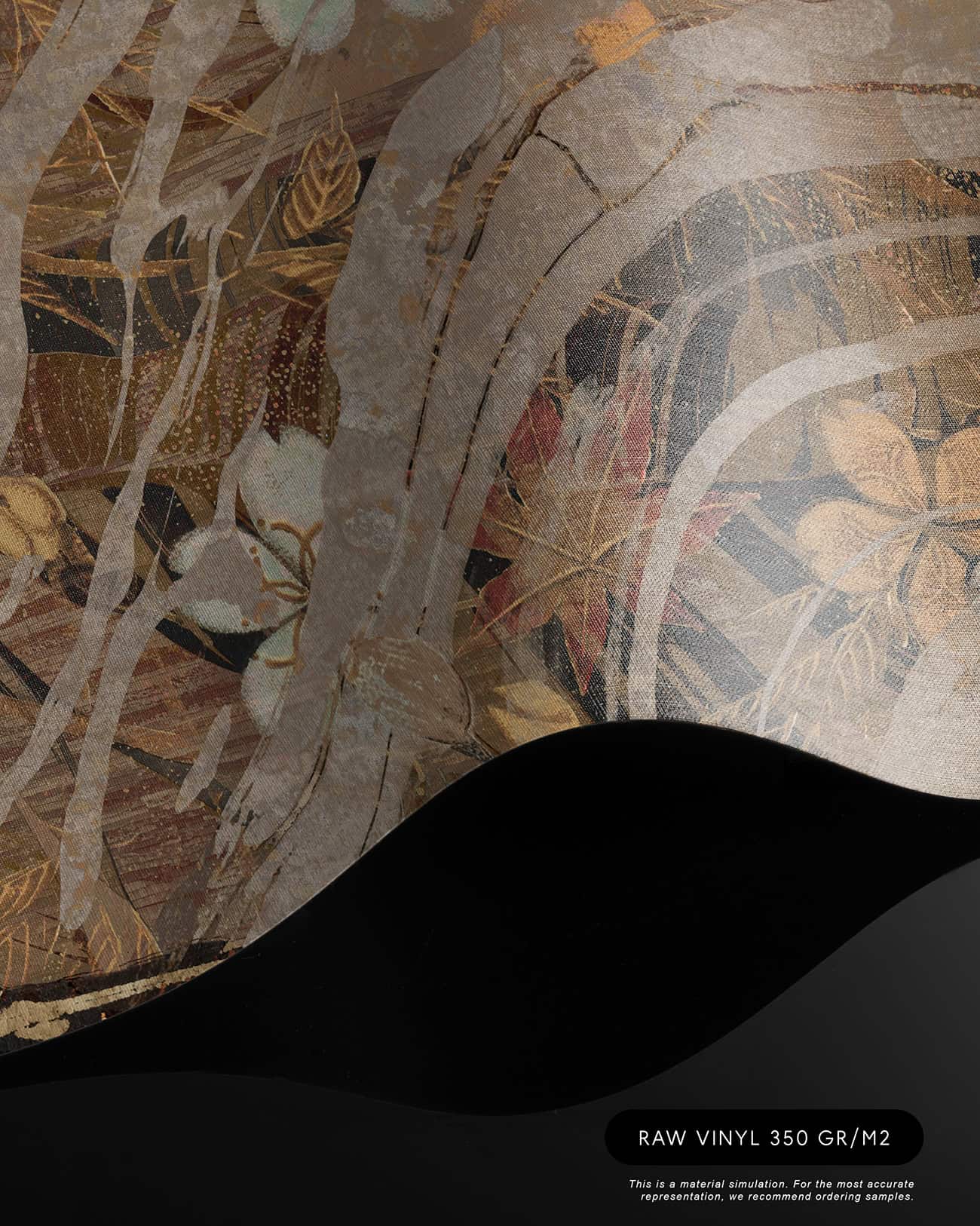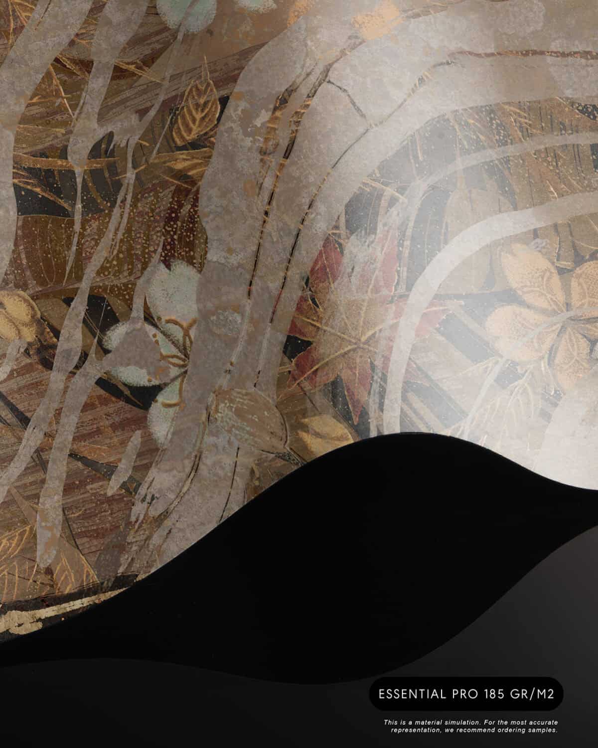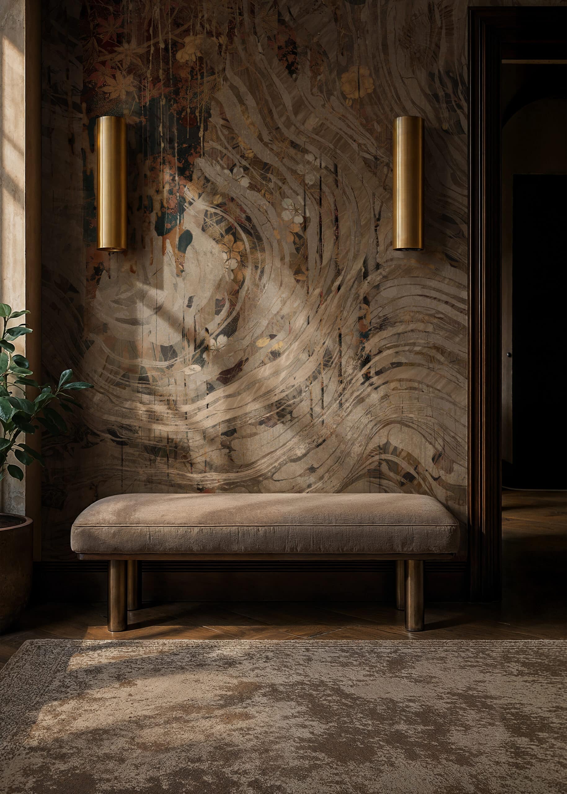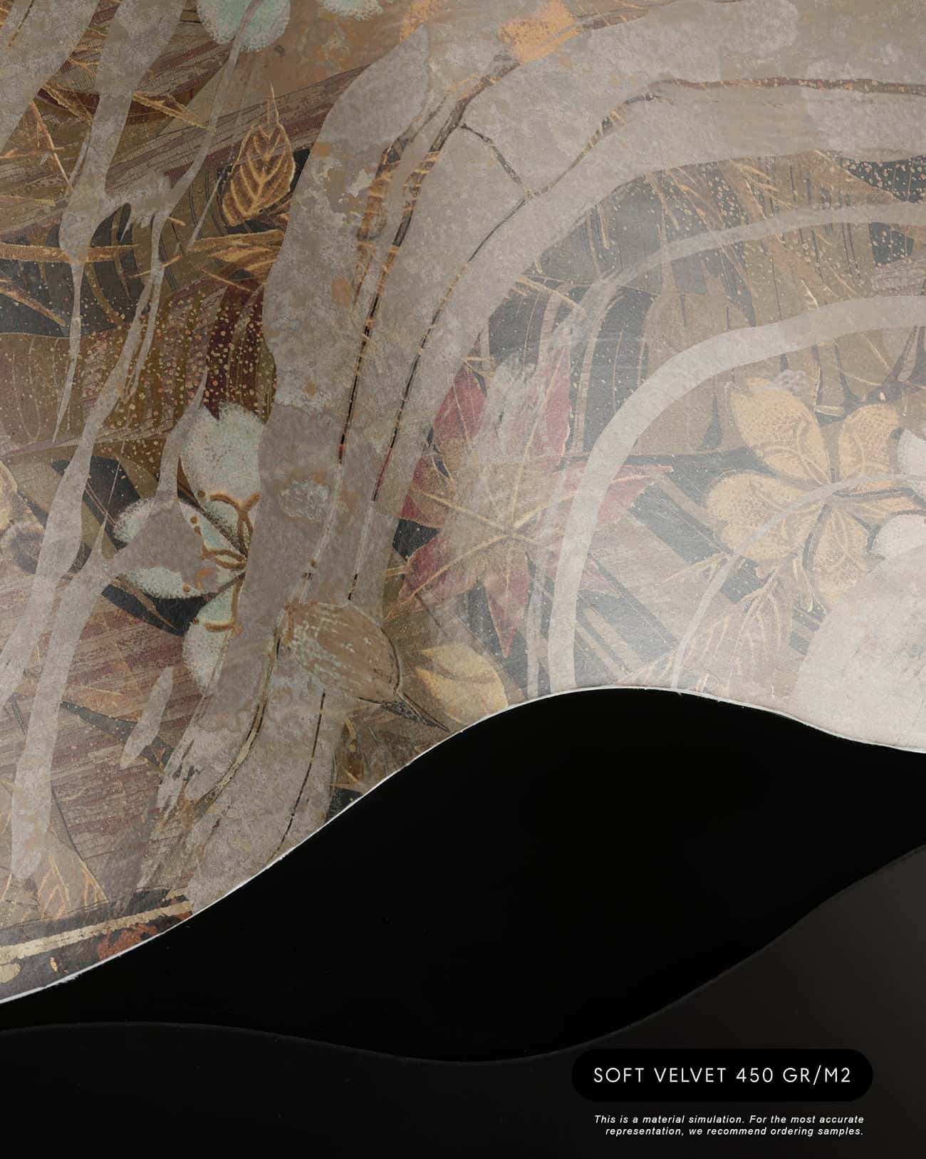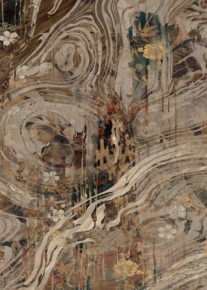 Nebula Dune is a panoramic luxury wallcovering for interior designers that reimagines the swirling energy of marbled stone through a painterly, maximalist lens. Powerful sweeping curves in warm taupe, grey, gold and rich umber move across the surface with the force of wind-sculpted dunes, while scattered floral fragments, droplets and crackled patina add moments of delicate detail. The composition has both the grandeur of geological formation and the intimacy of hand-painted mark making. This custom mural for hotel foyers and intimate sitting rooms brings visual depth to residential feature walls and hospitality environments. As a bespoke wallcovering specification for architects, Kora II offers a richly textured architectural wallcovering, a surface that feels alive with motion and history, ready for specification in luxury private villa and exclusive penthouse projects.