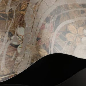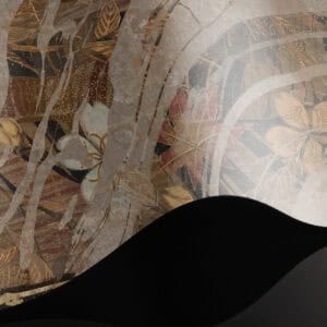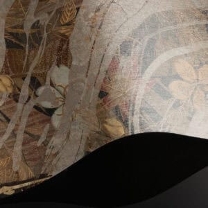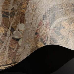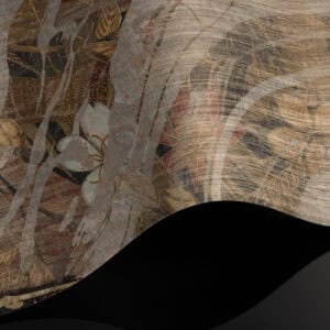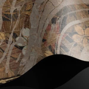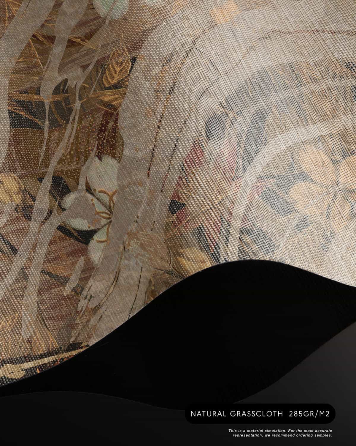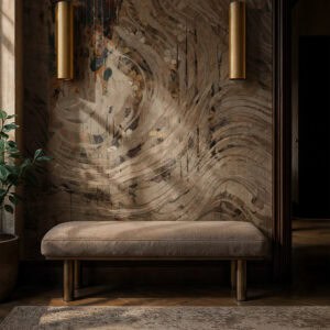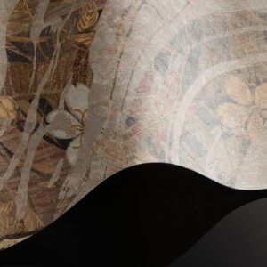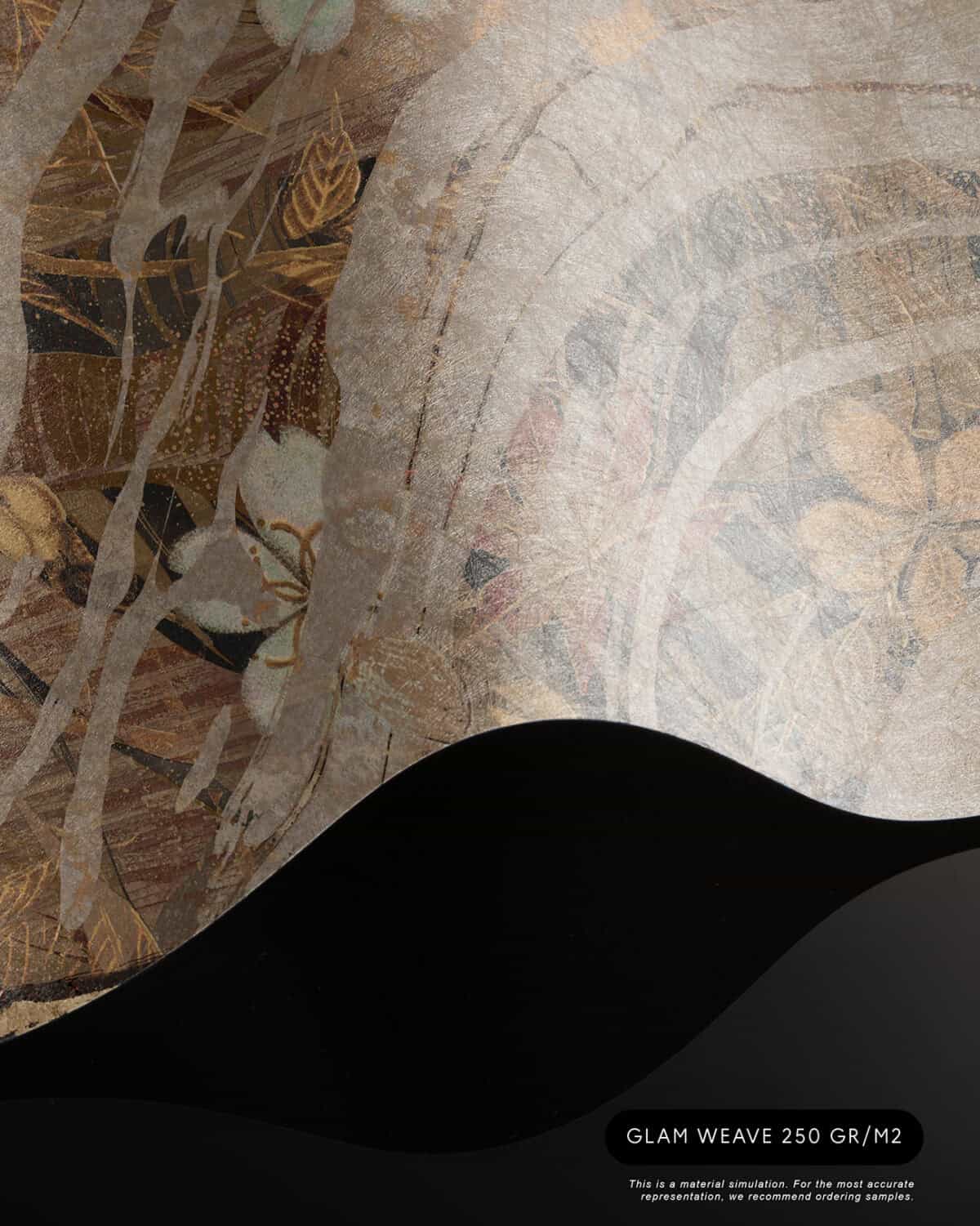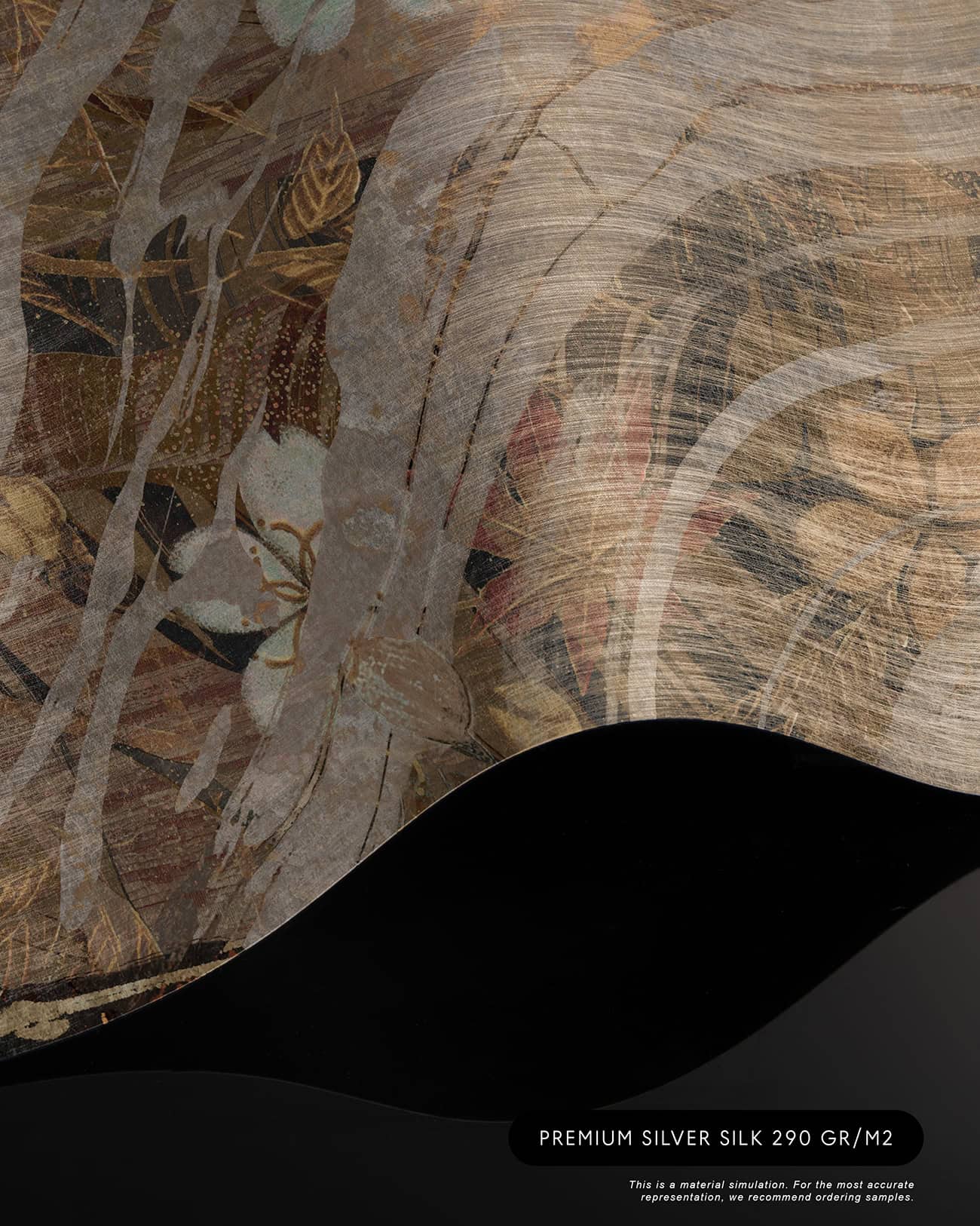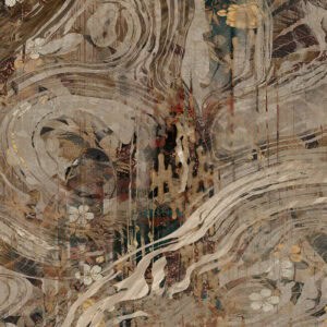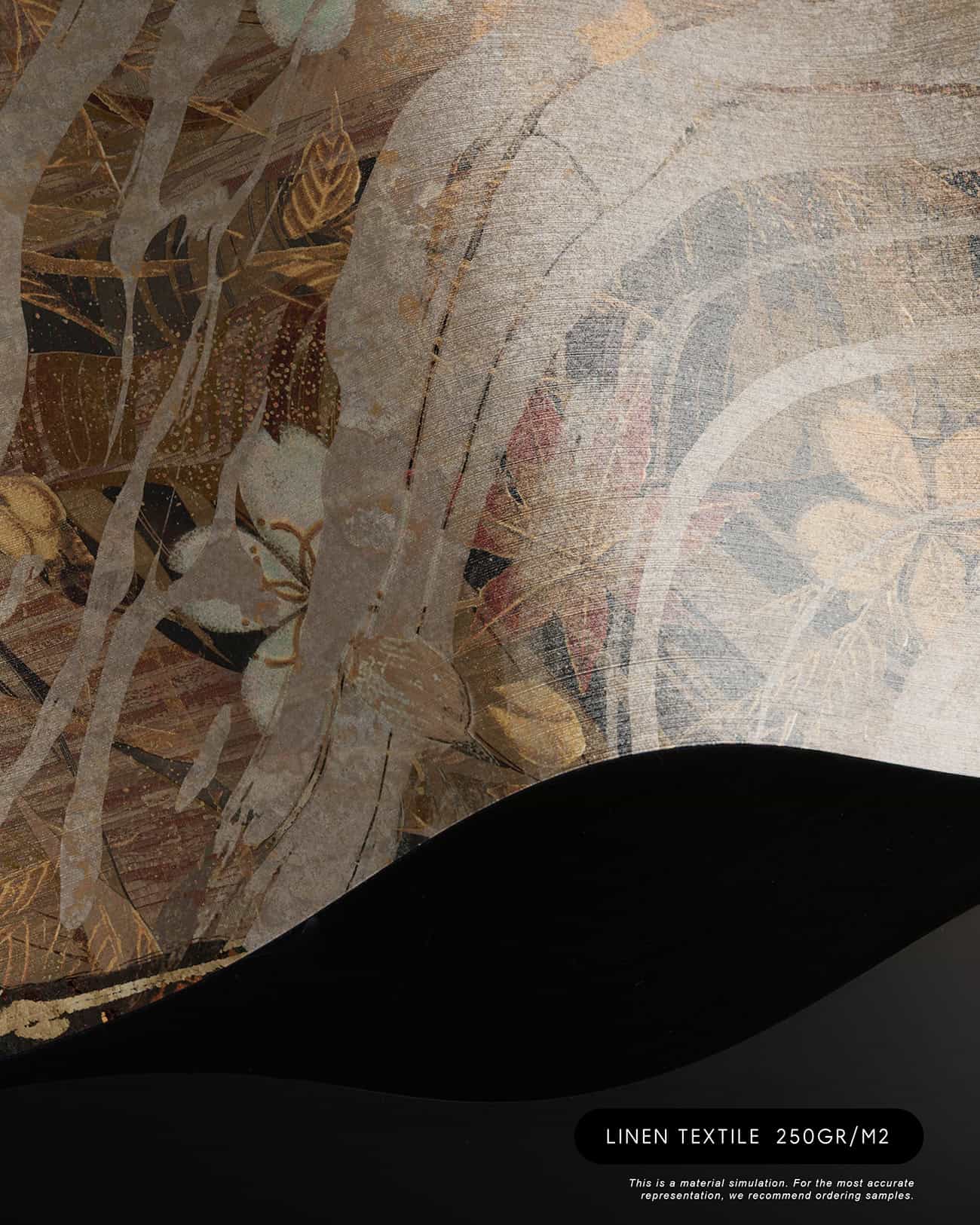 Nebula Dune is a panoramic luxury wallcovering for interior designers that reimagines the swirling energy of marbled stone through a painterly, maximalist lens. Powerful sweeping curves in warm taupe, grey, gold and rich umber move across the surface with the force of wind-sculpted dunes, while scattered floral fragments, droplets and crackled patina add moments of delicate detail. The composition has both the grandeur of geological formation and the intimacy of hand-painted mark making. This custom mural for hotel foyers and intimate sitting rooms brings visual depth to residential feature walls and hospitality environments. As a bespoke wallcovering specification for architects, Kora II offers a richly textured architectural wallcovering, a surface that feels alive with motion and history, ready for specification in luxury private villa and exclusive penthouse projects.