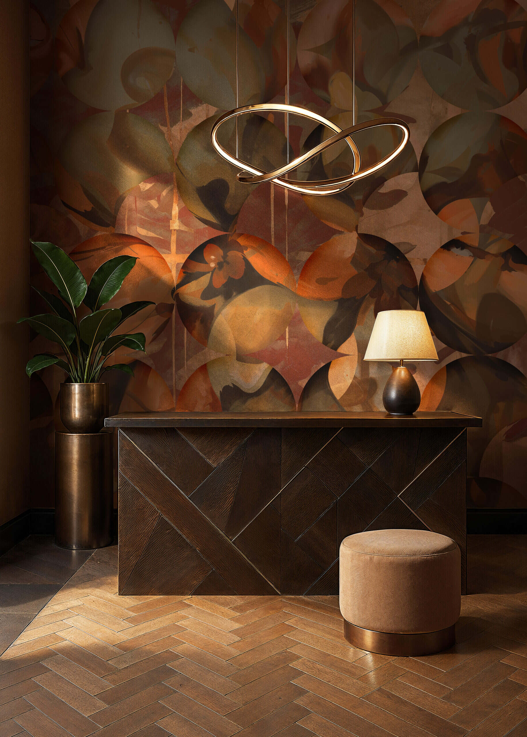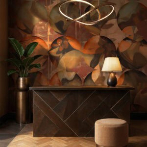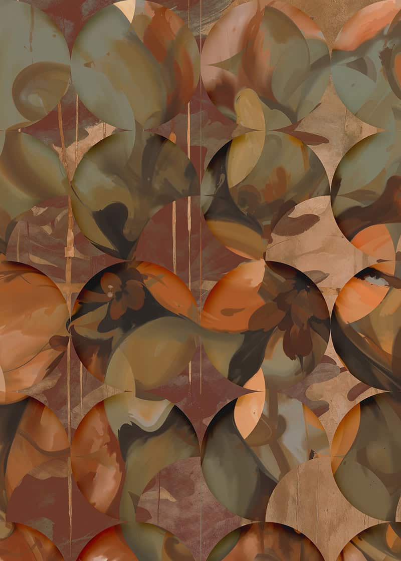 Orbital is a luxury wallpaper for hotel lobbies of painterly abstraction and rich, autumnal colour. Overlapping circular forms, like cross-sections of exotic fruit or geological specimens, repeat across the surface in a warm palette of burnt orange, olive green, terracotta, sage and dusty rose. Within each circle, fluid brushstrokes and leaf-like textures create a sense of movement and natural growth. This custom mural for hotel lobbies and boutique retail spaces brings a lively, artistic energy to residential dining rooms and hospitality environments alike. Produced in extra-wide panoramic format, Orbital is a luxury wallcovering for interior designers that combines the confidence of abstract art with the warmth of organic colour, an architectural wallcovering that feels both curated and alive.