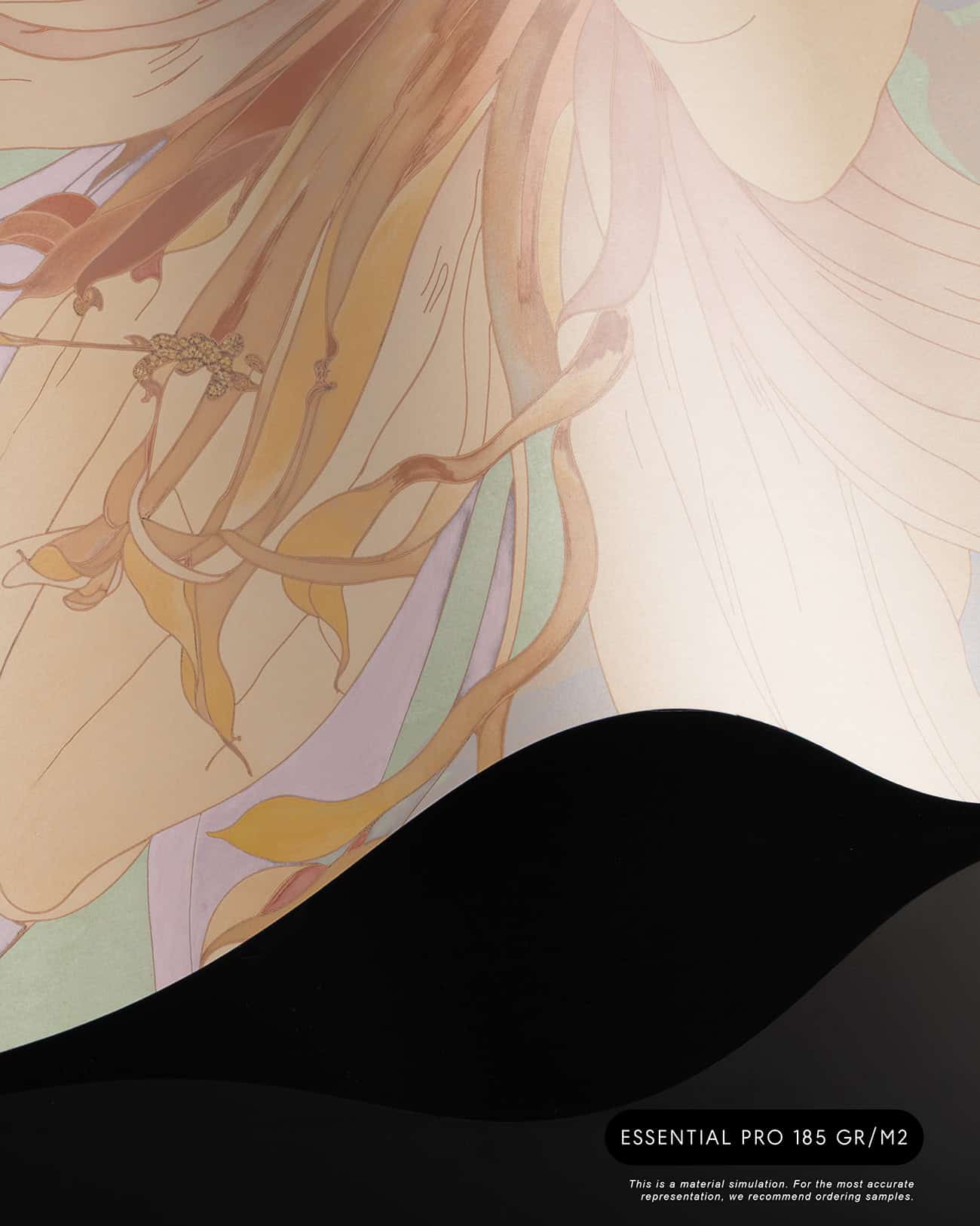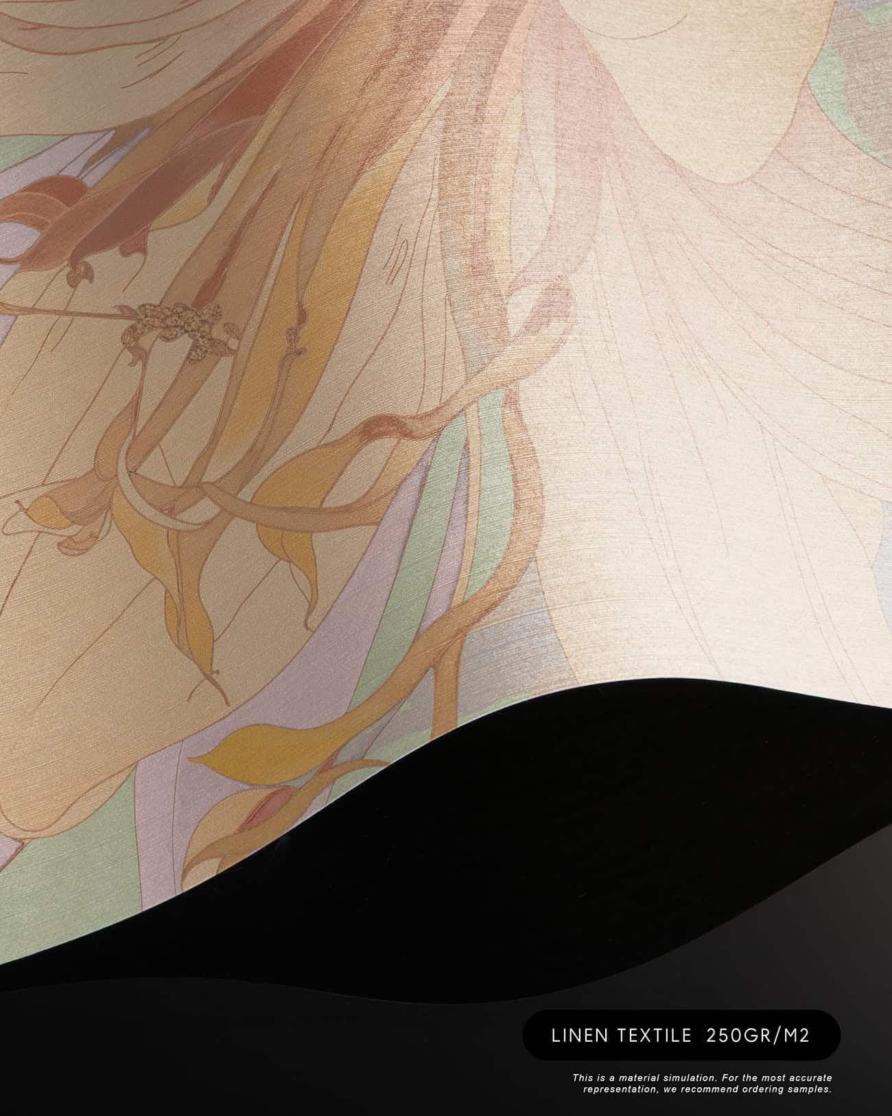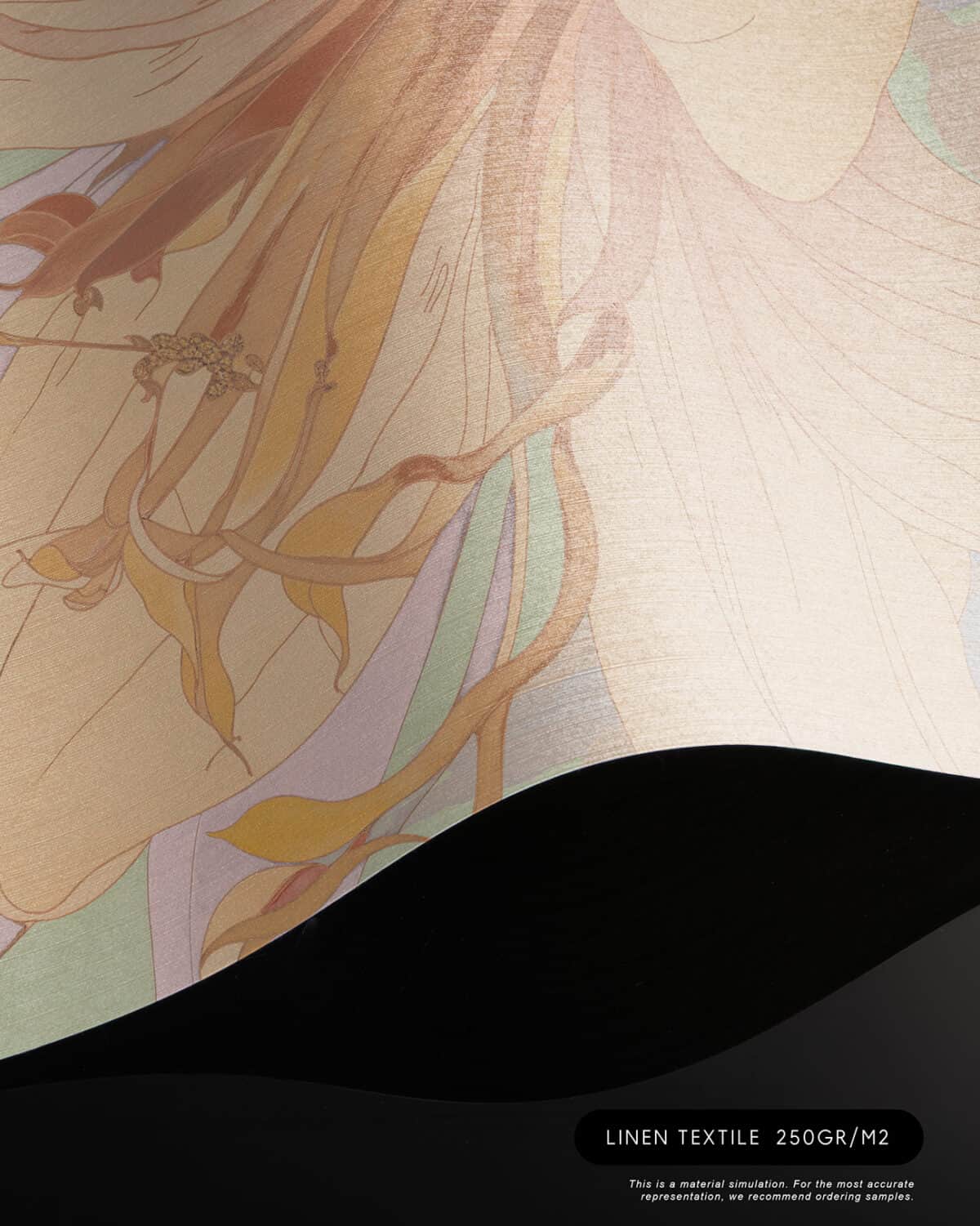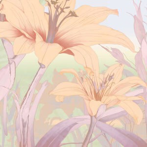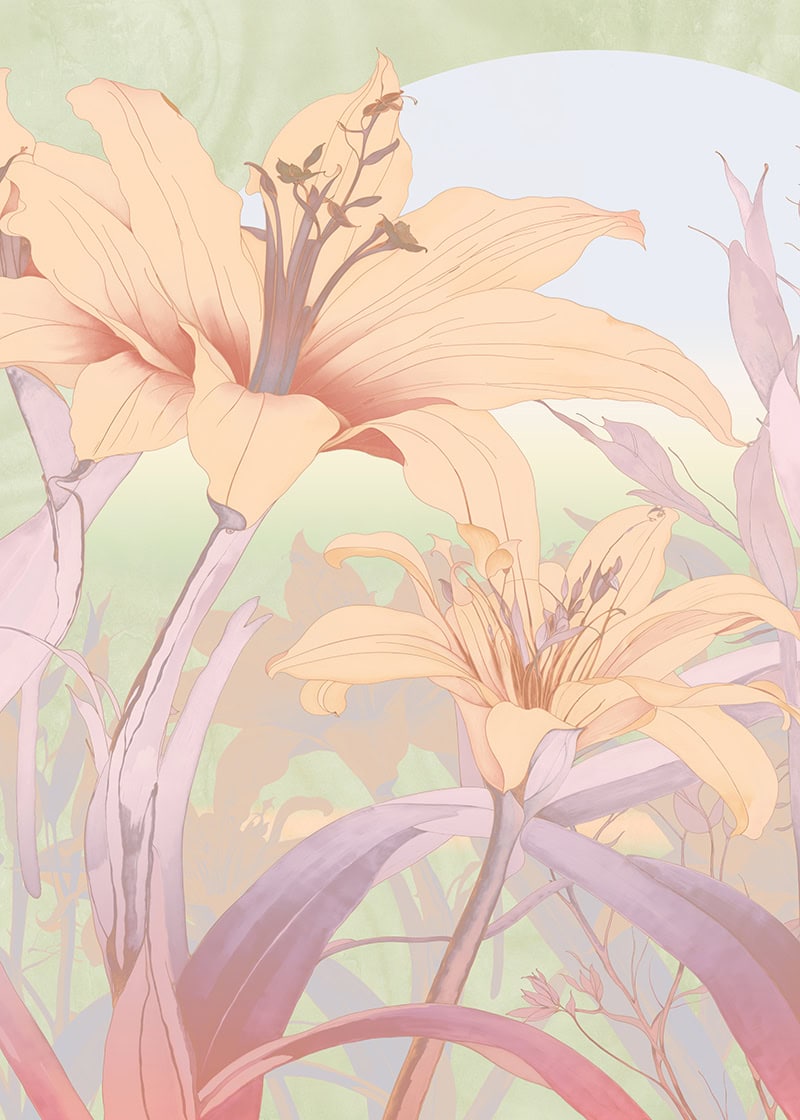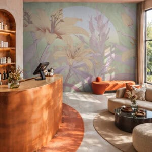 Orchid Mist is a designer wall mural of luminous, almost translucent beauty. Oversized lily blossoms and tropical flower buds unfurl in soft peach, warm apricot and gentle cream, layered with lavender-toned stems and broad, sweeping leaves rendered in sage green, pale mint and soft lilac. A hazy circular light form, like a sun breaking through morning mist, anchors the composition and gives the design its ethereal, almost dreamlike quality. Fine illustrative linework defines each petal and leaf vein with the precision of botanical illustration, while the colour palette stays deliberately pale and airy, as if the entire scene has been bathed in early morning light. Version 1 (T11109) carries a cooler green-lavender atmosphere; version 2 (T11110) warms the palette further into golden peach and amber tones. This luxury wallcovering for interior designers brings a sense of optimism and natural grace to reception areas, day spas and boutique hotel lobbies. As a bespoke mural for residential projects, Orchid Mist works beautifully in open-plan living spaces, master bedrooms and wellness rooms where panoramic wallpaper creates an immersive, gallery-scale experience. Its refined palette and scale make it equally suited for specification in luxury show homes and private villa entertaining spaces where scenic landscape mural wallpaper sets a serene, uplifting tone.