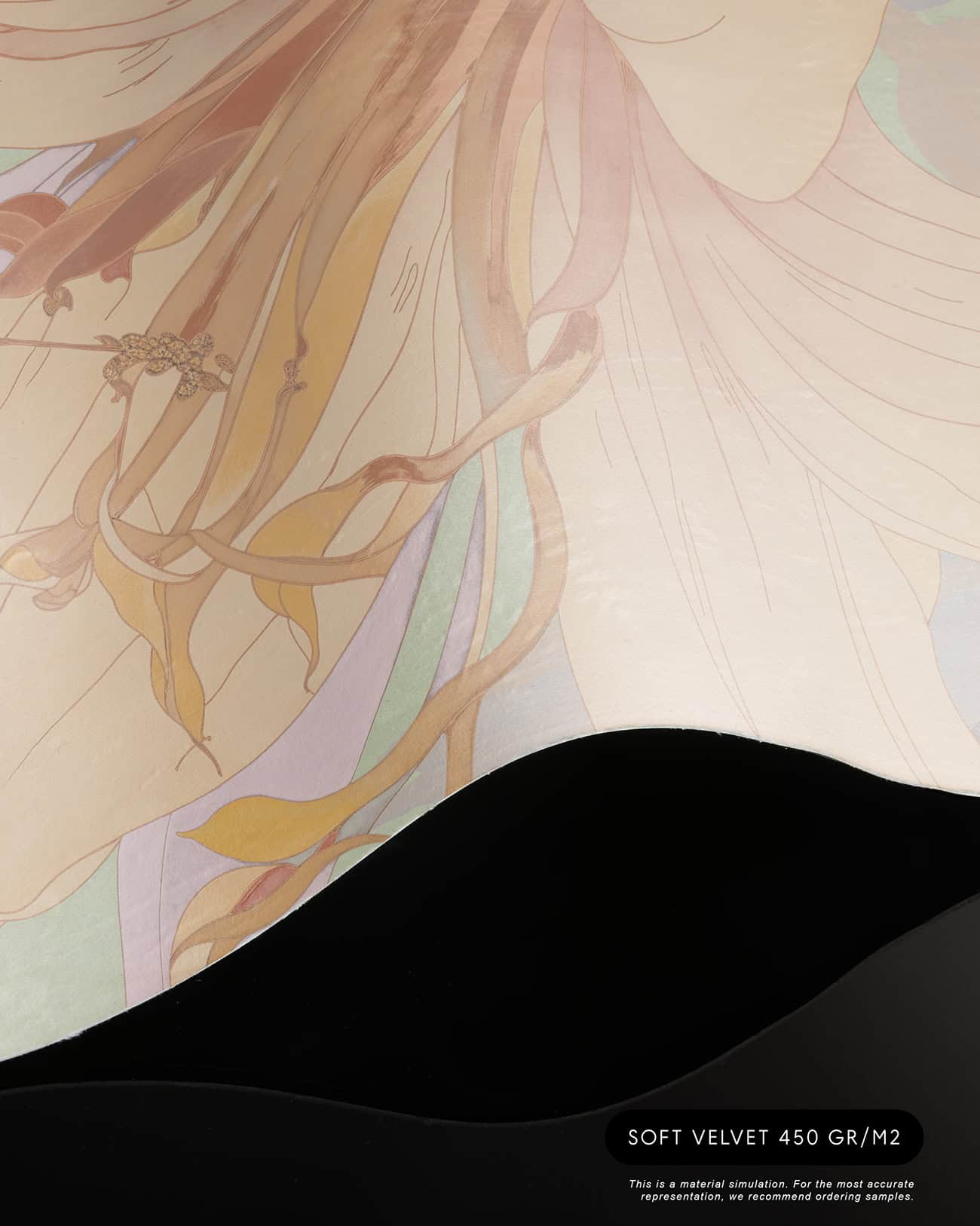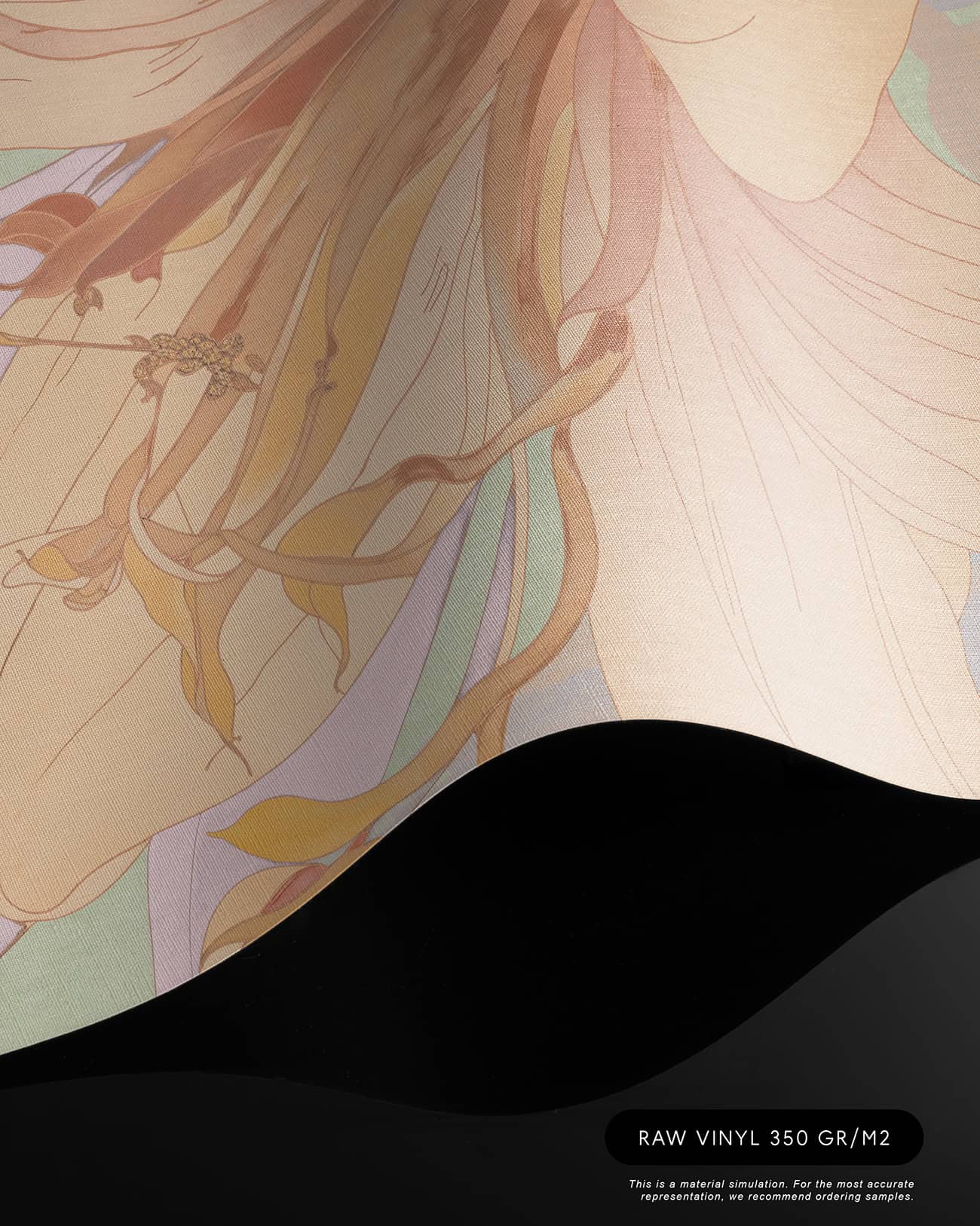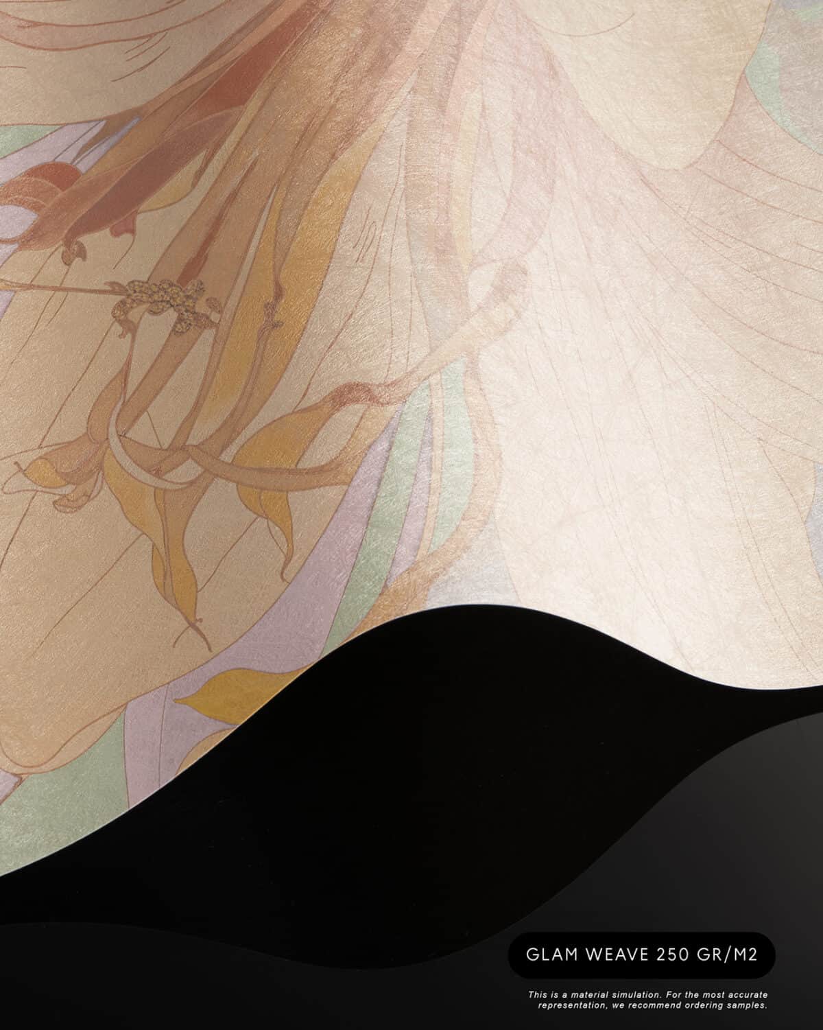 Orchid Mist is a designer wall mural of luminous, almost translucent beauty. Oversized lily blossoms and tropical flower buds unfurl in soft peach, warm apricot and gentle cream, layered with lavender-toned stems and broad, sweeping leaves rendered in sage green, pale mint and soft lilac. A hazy circular light form, like a sun breaking through morning mist, anchors the composition and gives the design its ethereal, almost dreamlike quality. Fine illustrative linework defines each petal and leaf vein with the precision of botanical illustration, while the colour palette stays deliberately pale and airy, as if the entire scene has been bathed in early morning light. Version 1 (T11109) carries a cooler green-lavender atmosphere; version 2 (T11110) warms the palette further into golden peach and amber tones. This luxury wallcovering for interior designers brings a sense of optimism and natural grace to reception areas, day spas and boutique hotel lobbies. As a bespoke mural for residential projects, Orchid Mist works beautifully in open-plan living spaces, master bedrooms and wellness rooms where panoramic wallpaper creates an immersive, gallery-scale experience. Its refined palette and scale make it equally suited for specification in luxury show homes and private villa entertaining spaces where scenic landscape mural wallpaper sets a serene, uplifting tone.