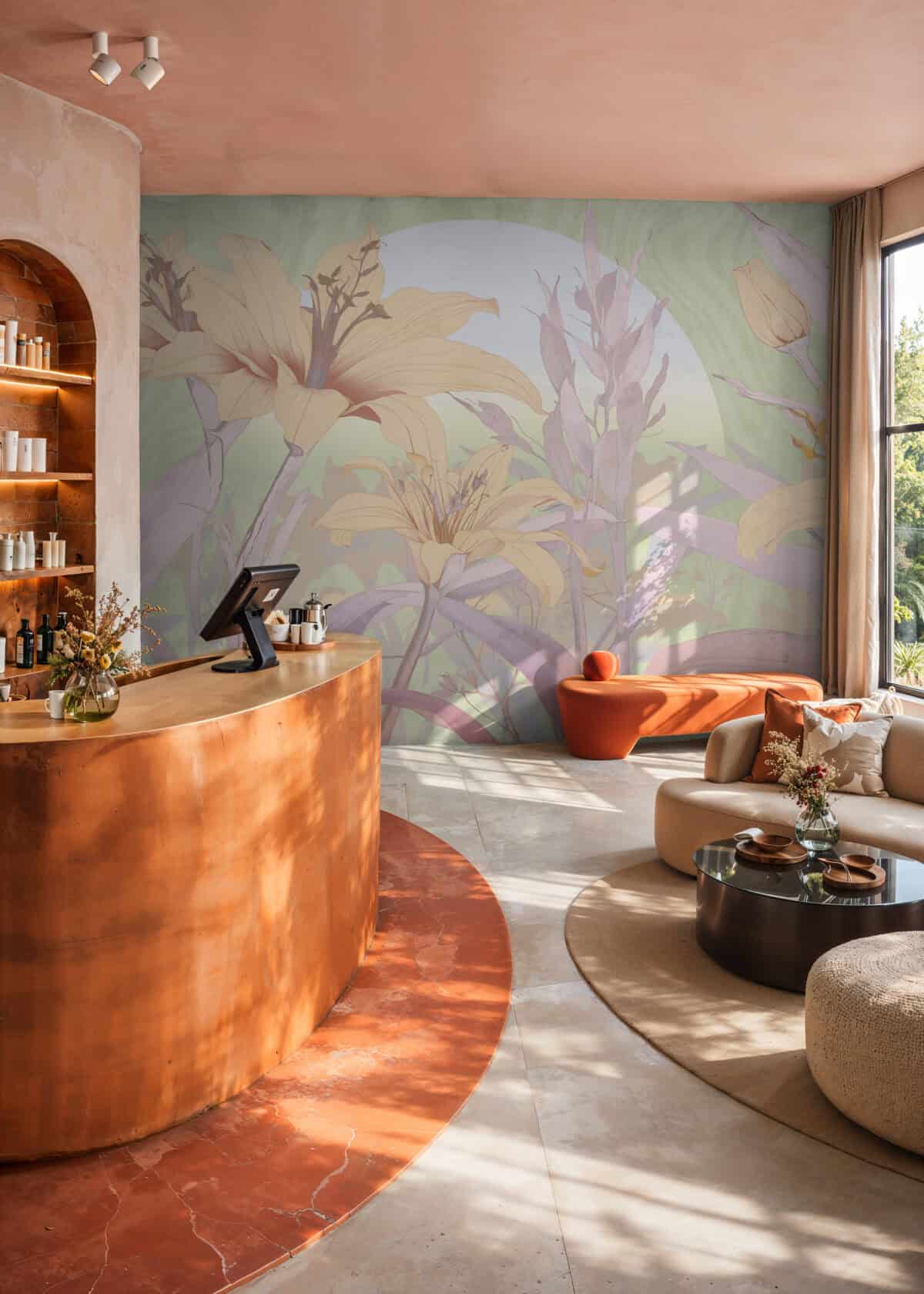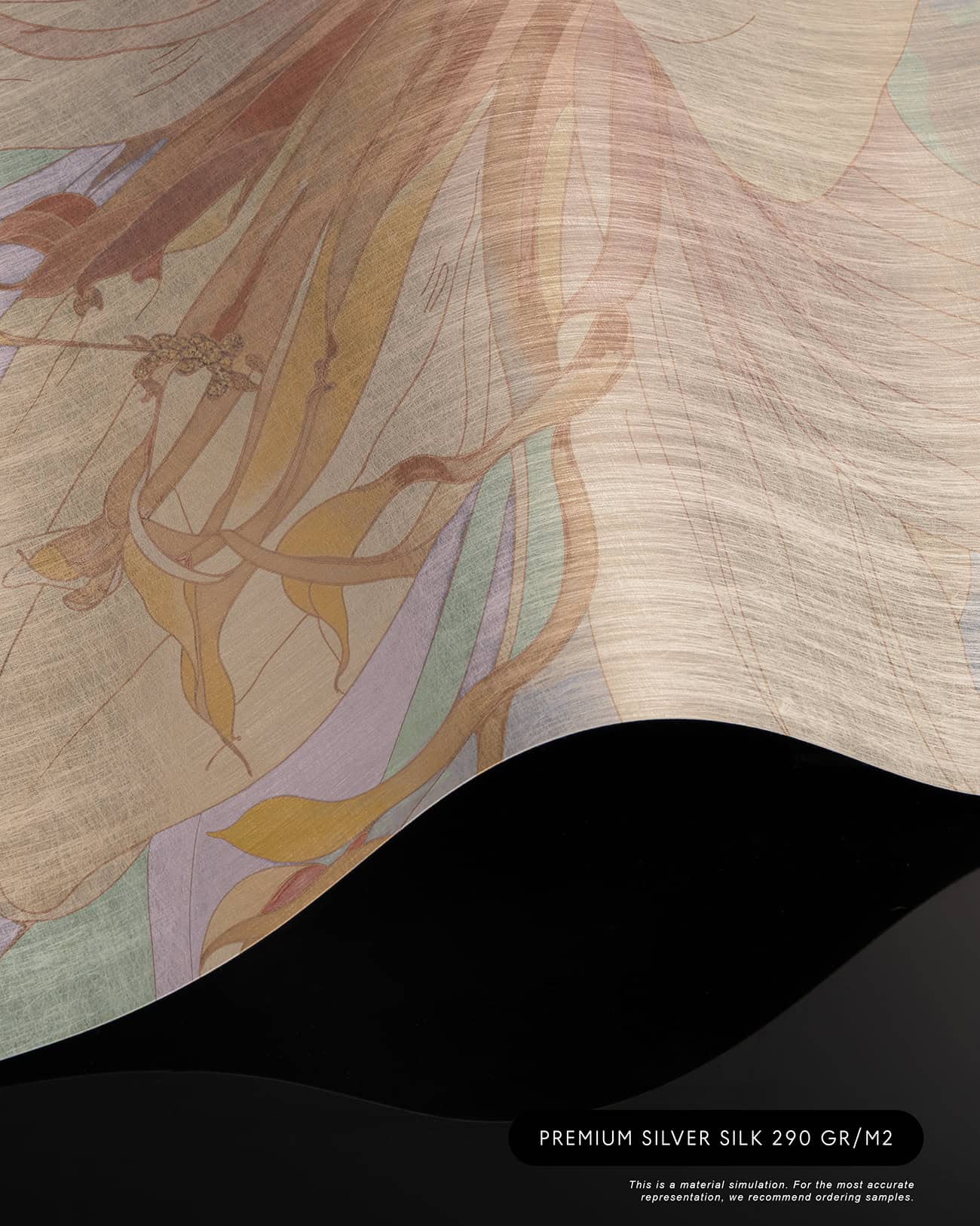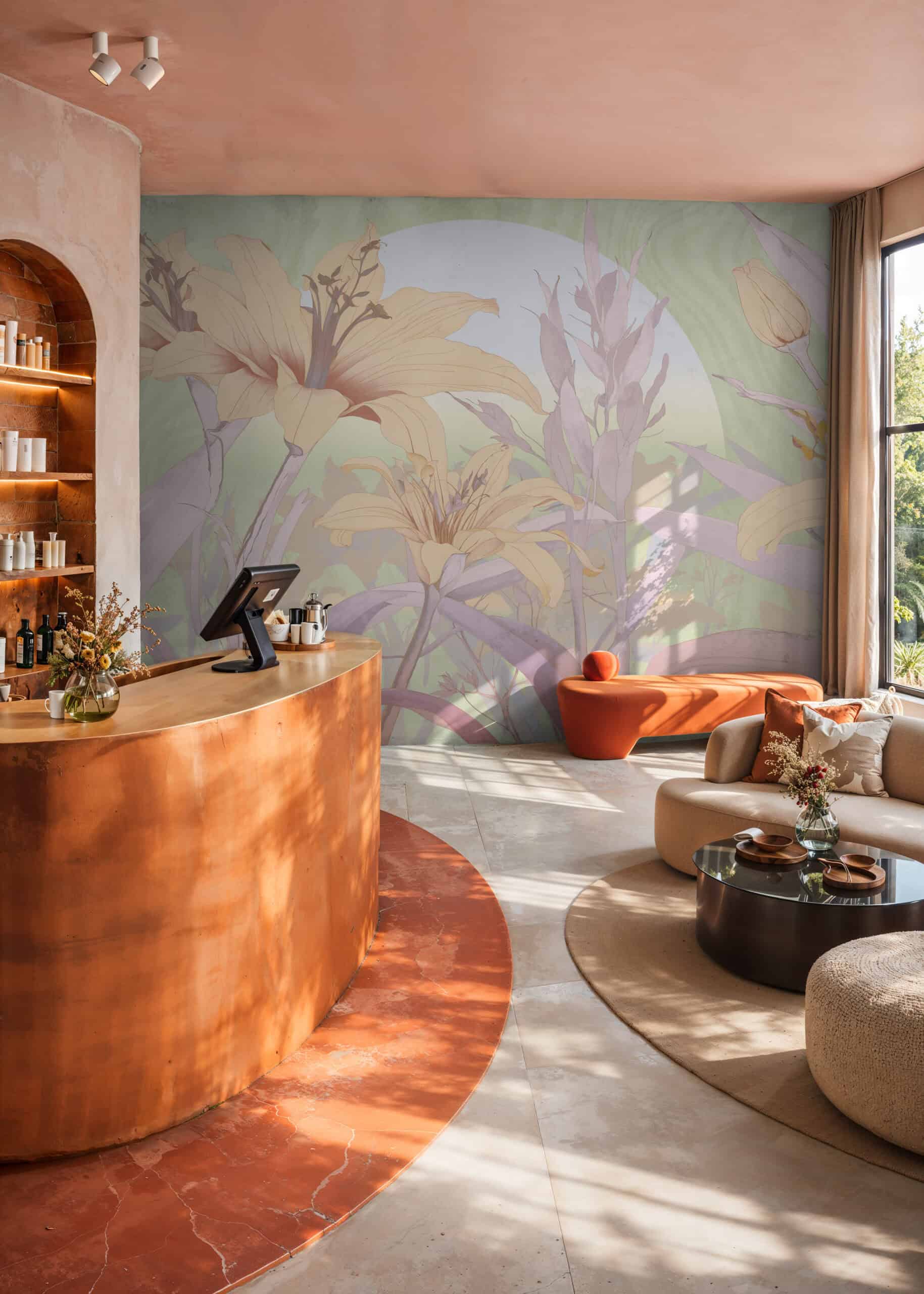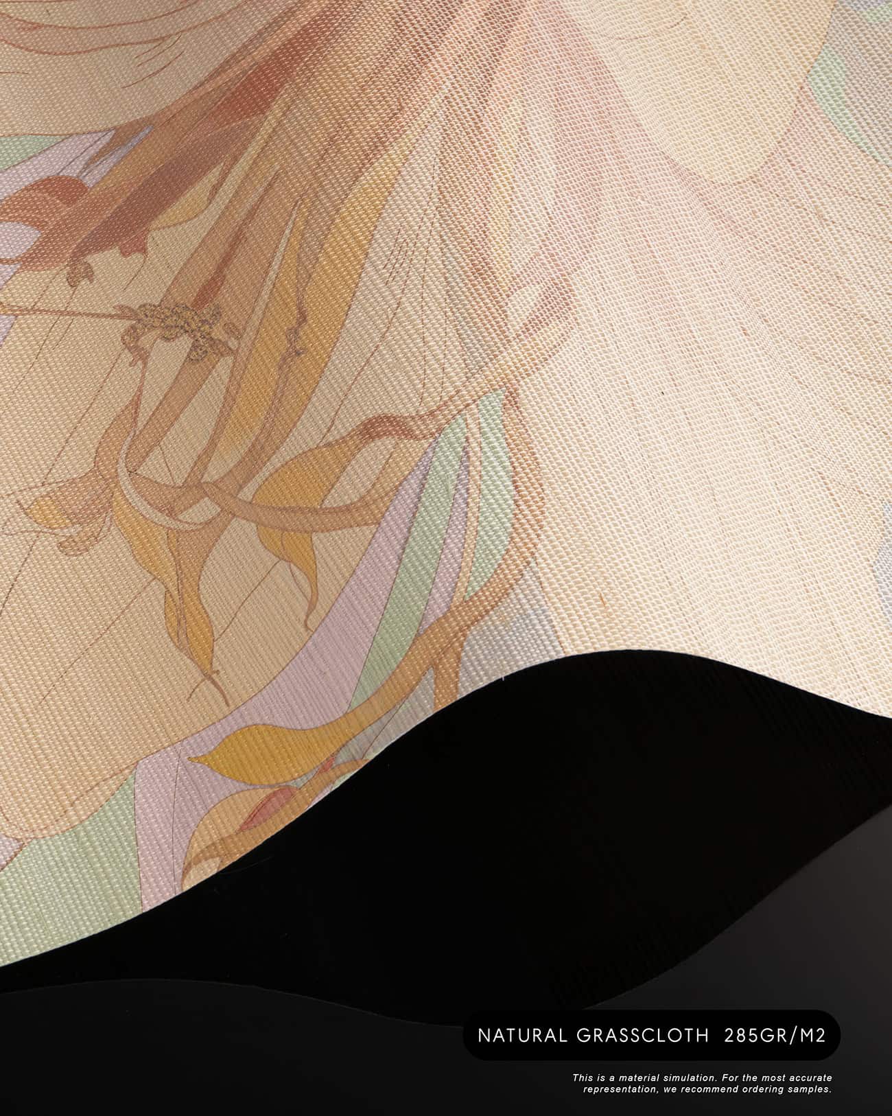 Orchid Mist is a designer wall mural of luminous, almost translucent beauty. Oversized lily blossoms and tropical flower buds unfurl in soft peach, warm apricot and gentle cream, layered with lavender-toned stems and broad, sweeping leaves rendered in sage green, pale mint and soft lilac. A hazy circular light form, like a sun breaking through morning mist, anchors the composition and gives the design its ethereal, almost dreamlike quality. Fine illustrative linework defines each petal and leaf vein with the precision of botanical illustration, while the colour palette stays deliberately pale and airy, as if the entire scene has been bathed in early morning light. Version 1 (T11109) carries a cooler green-lavender atmosphere; version 2 (T11110) warms the palette further into golden peach and amber tones. This luxury wallcovering for interior designers brings a sense of optimism and natural grace to reception areas, day spas and boutique hotel lobbies. As a bespoke mural for residential projects, Orchid Mist works beautifully in open-plan living spaces, master bedrooms and wellness rooms where panoramic wallpaper creates an immersive, gallery-scale experience. Its refined palette and scale make it equally suited for specification in luxury show homes and private villa entertaining spaces where scenic landscape mural wallpaper sets a serene, uplifting tone.