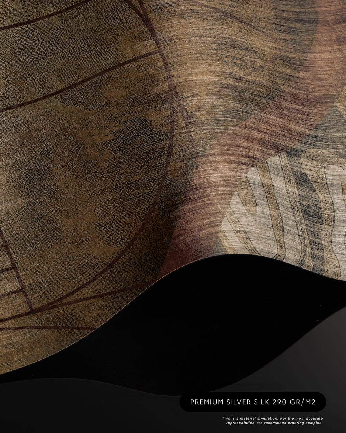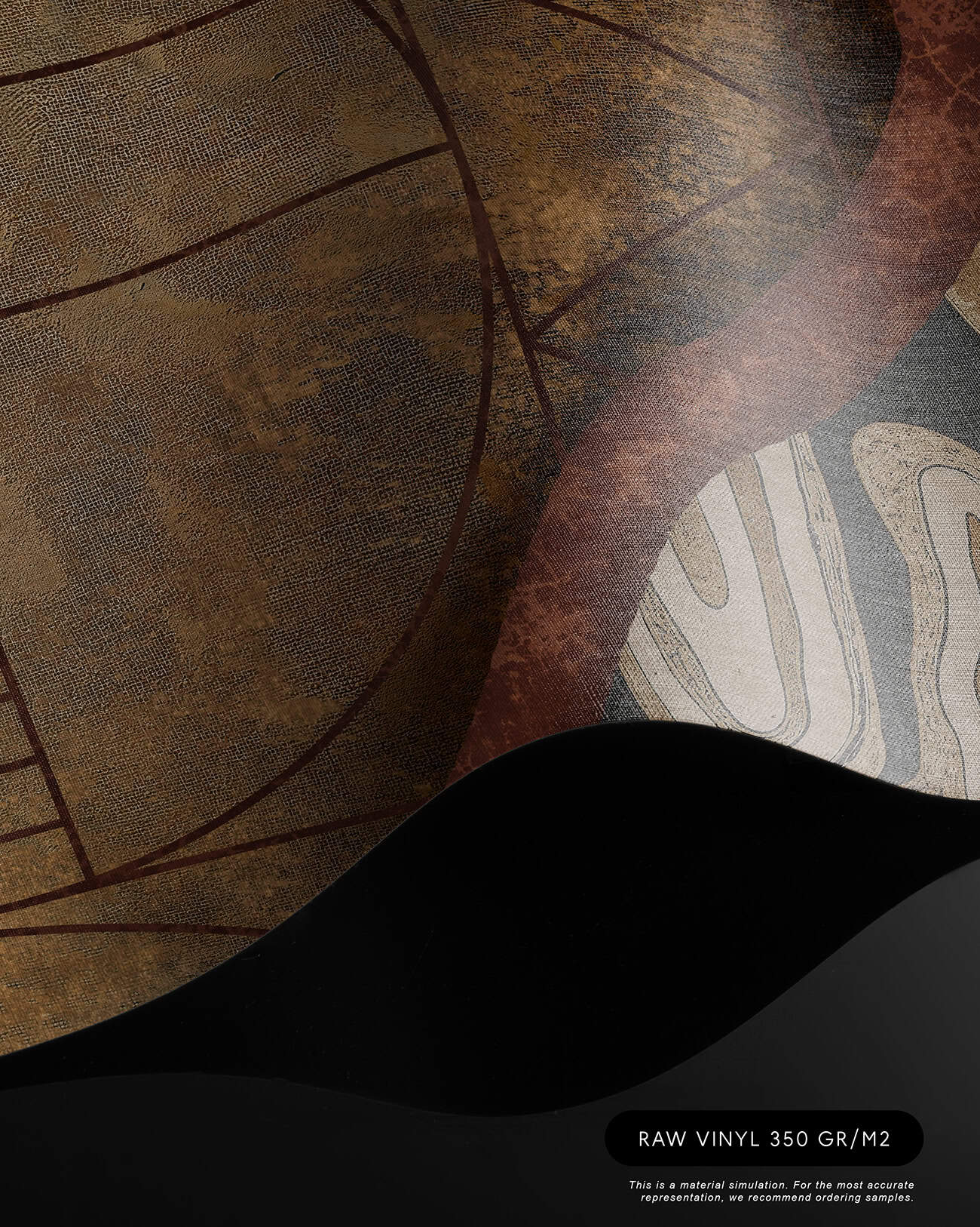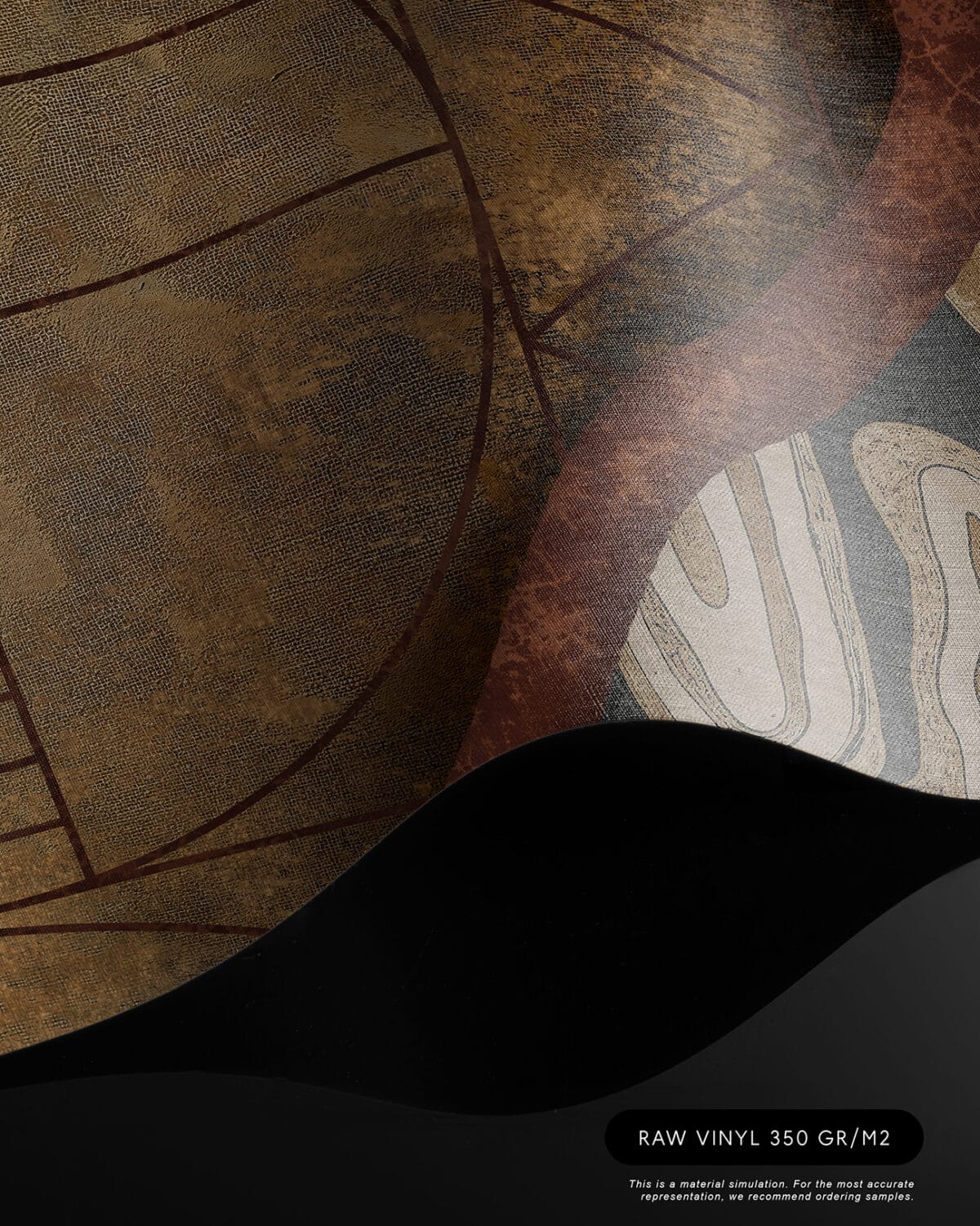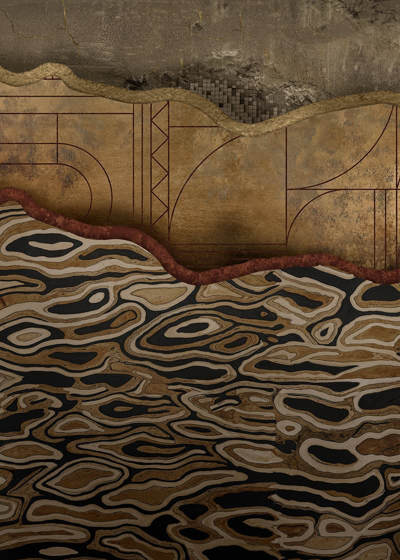 The Last Line is a bespoke wallcovering specification for architects that captures the geological drama of earth meeting stone. The upper half presents a weathered, golden terrain etched with fine architectural linework, geometric grids, circles and ladders, while the lower half erupts into flowing, agate-like patterns of black, cream, gold and deep umber. A thin seam of crimson marks the boundary between the two worlds, like a vein of molten mineral running through the earth’s crust. This luxury wallcovering for interior designers is made for statement bedrooms, hotel feature walls and architectural interiors that value narrative and material depth. As a high-end interior finish wallpaper, The Last Line reads like a cross-section of the planet itself, suited to exclusive penthouse, private villa and luxury hospitality projects.