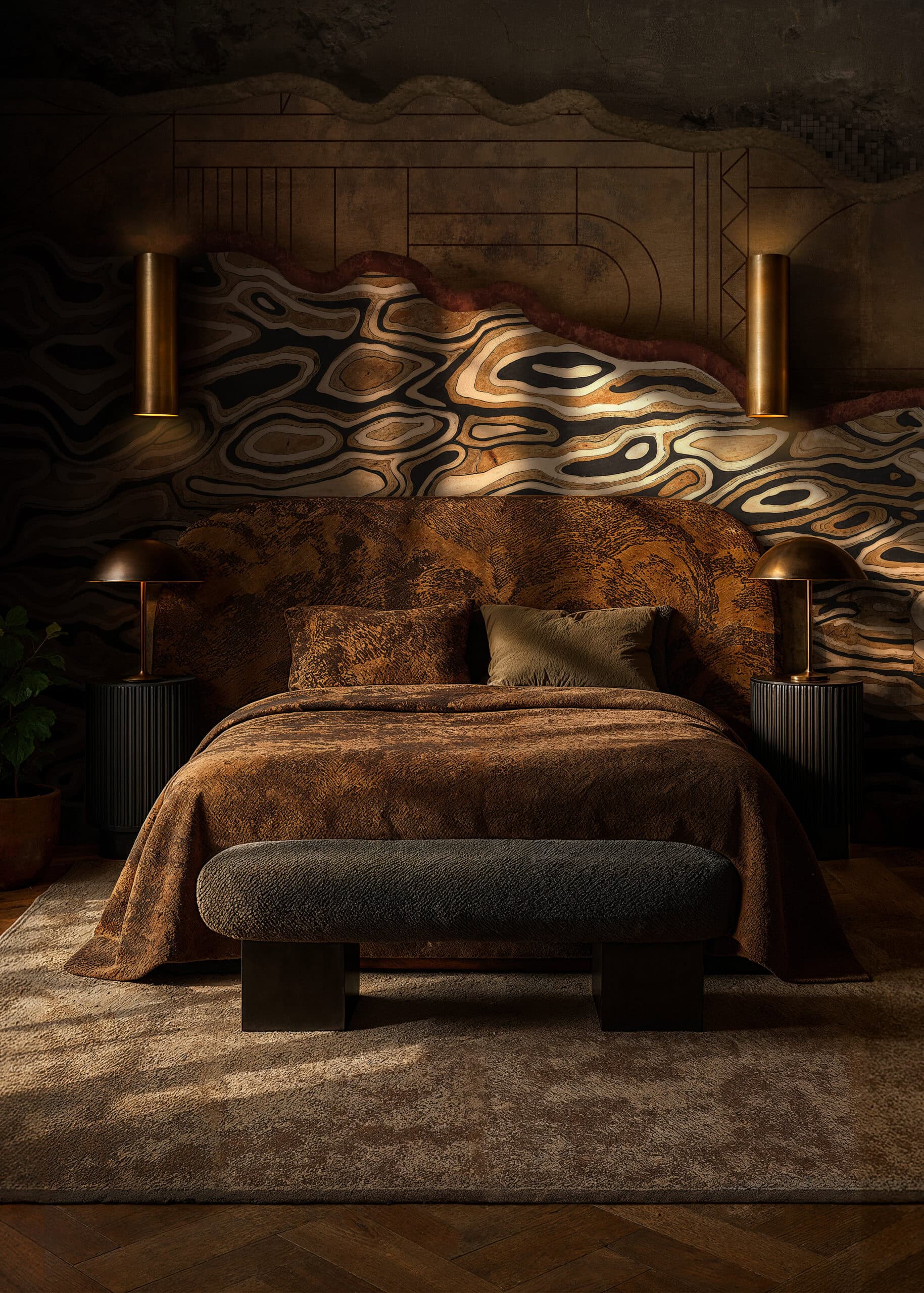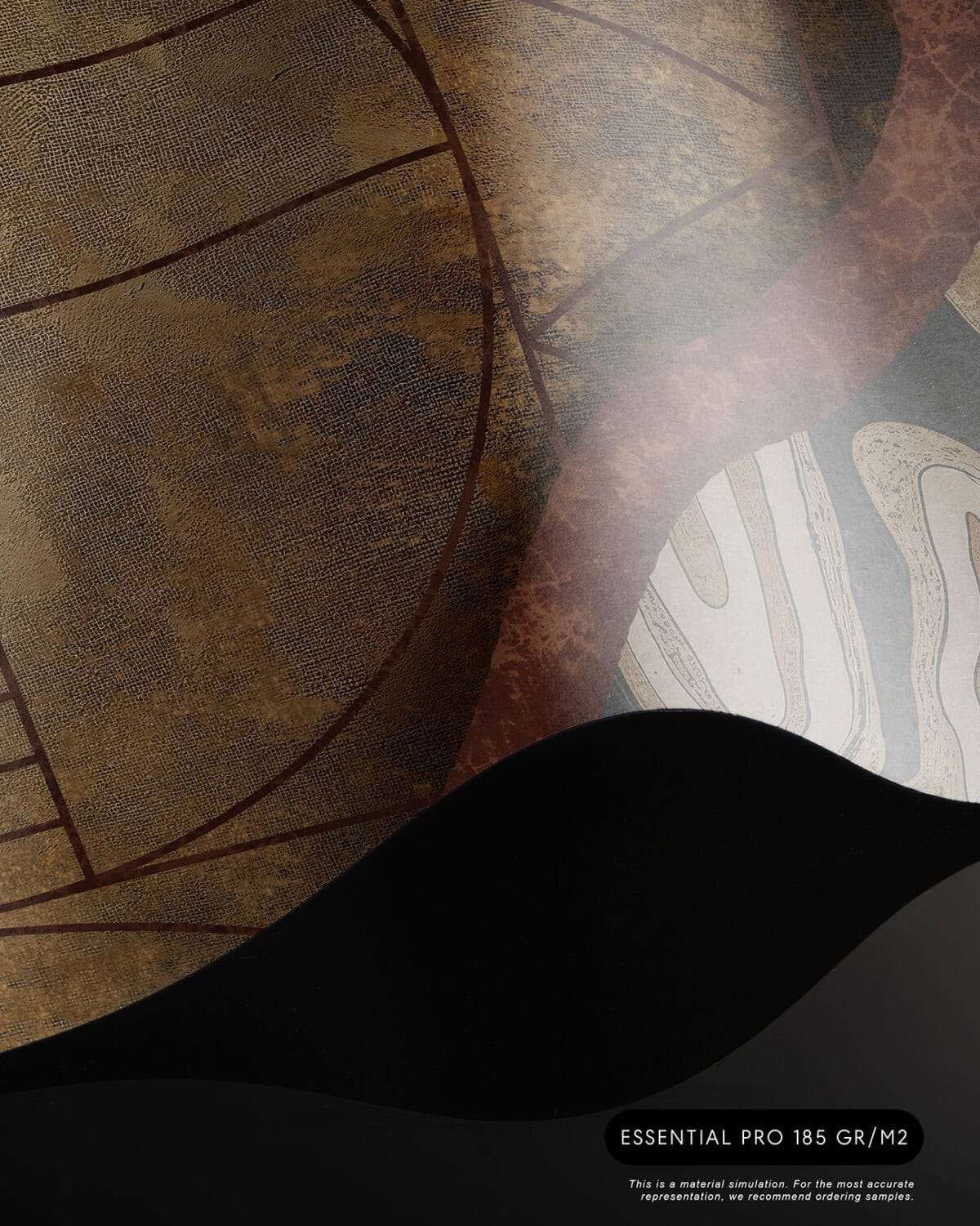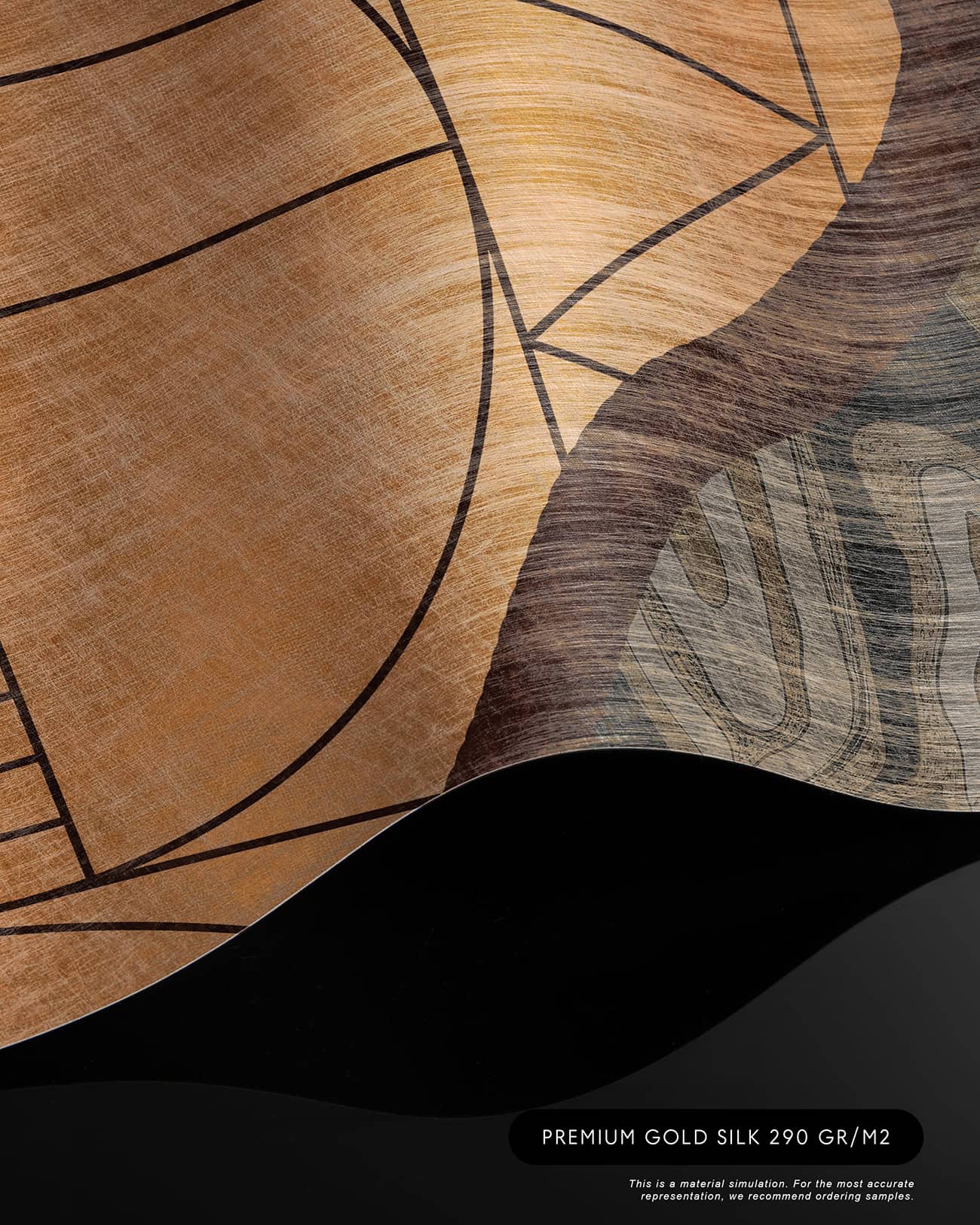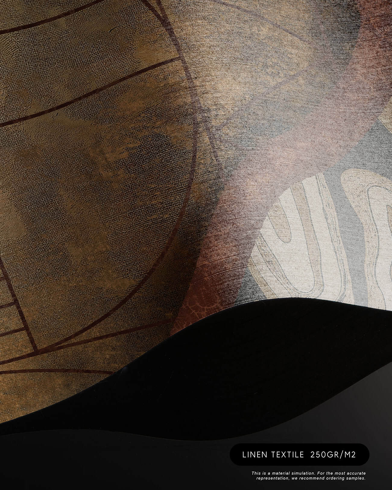 The Last Line is a bespoke wallcovering specification for architects that captures the geological drama of earth meeting stone. The upper half presents a weathered, golden terrain etched with fine architectural linework, geometric grids, circles and ladders, while the lower half erupts into flowing, agate-like patterns of black, cream, gold and deep umber. A thin seam of crimson marks the boundary between the two worlds, like a vein of molten mineral running through the earth’s crust. This luxury wallcovering for interior designers is made for statement bedrooms, hotel feature walls and architectural interiors that value narrative and material depth. As a high-end interior finish wallpaper, The Last Line reads like a cross-section of the planet itself, suited to exclusive penthouse, private villa and luxury hospitality projects.