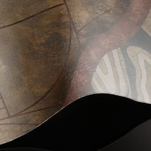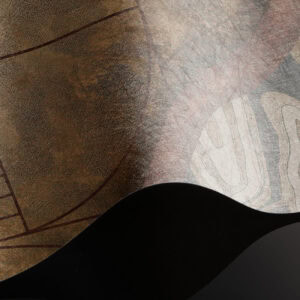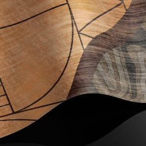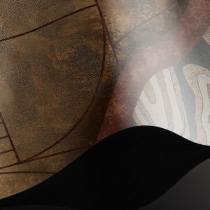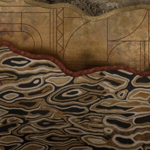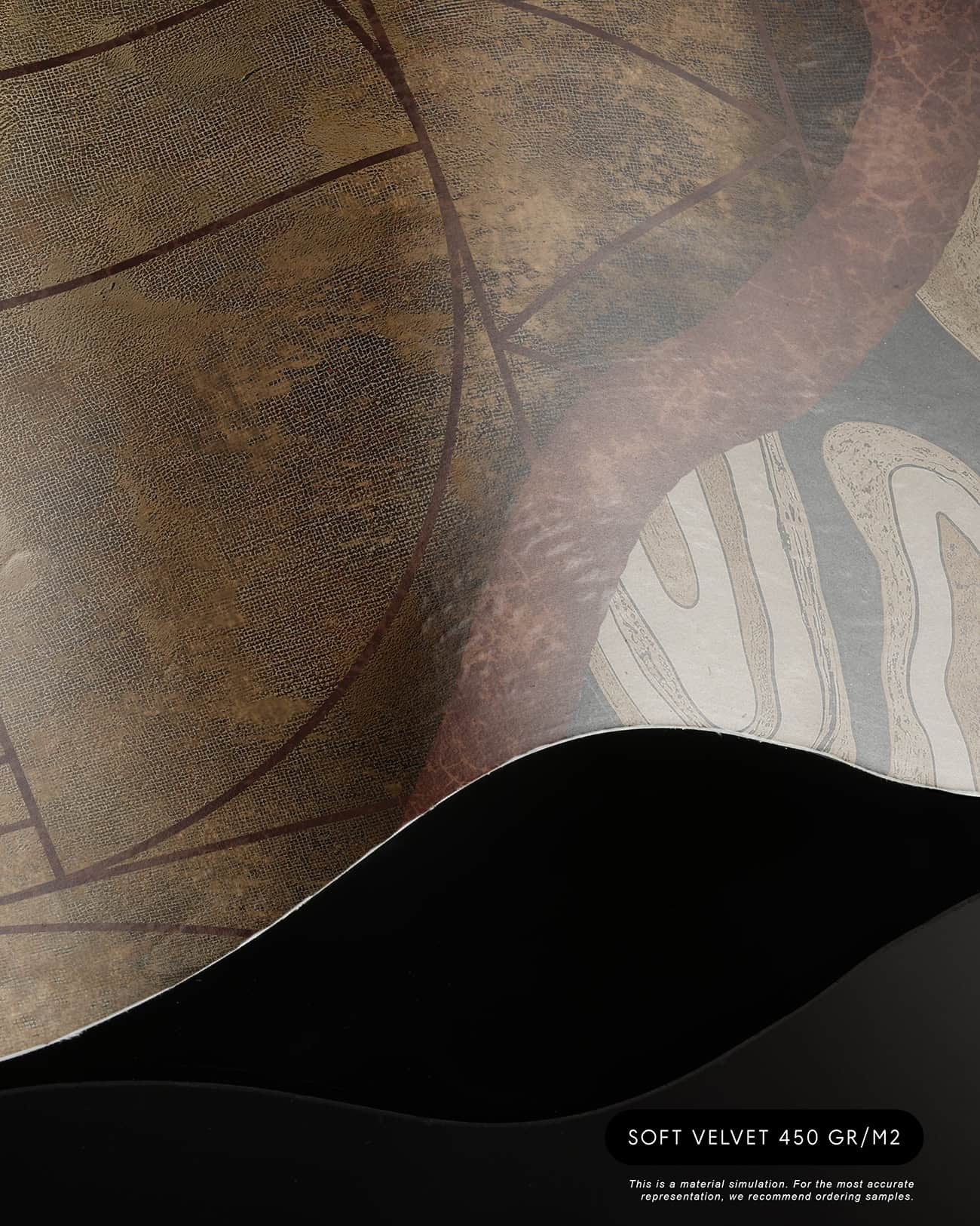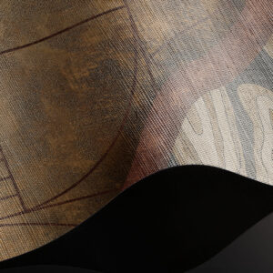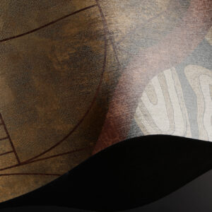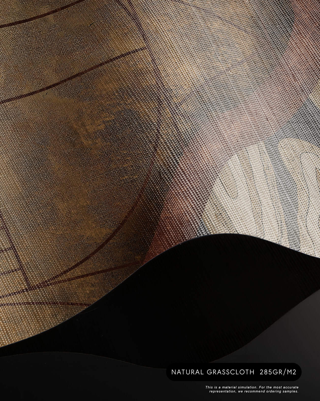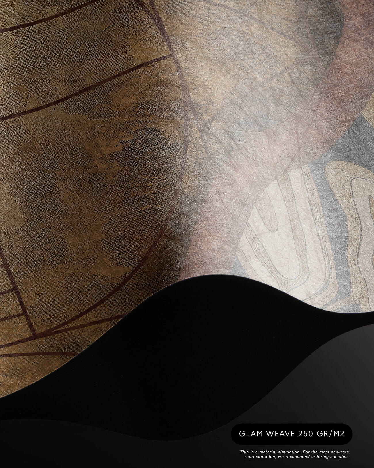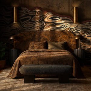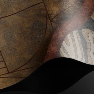The Last Line is a bespoke wallcovering specification for architects that captures the geological drama of earth meeting stone. The upper half presents a weathered, golden terrain etched with fine architectural linework, geometric grids, circles and ladders, while the lower half erupts into flowing, agate-like patterns of black, cream, gold and deep umber. A thin seam of crimson marks the boundary between the two worlds, like a vein of molten mineral running through the earth’s crust. This luxury wallcovering for interior designers is made for statement bedrooms, hotel feature walls and architectural interiors that value narrative and material depth. As a high-end interior finish wallpaper, The Last Line reads like a cross-section of the planet itself, suited to exclusive penthouse, private villa and luxury hospitality projects.