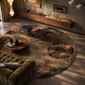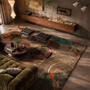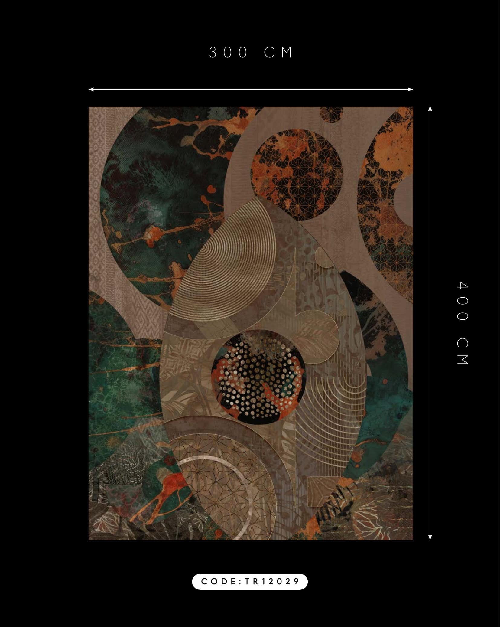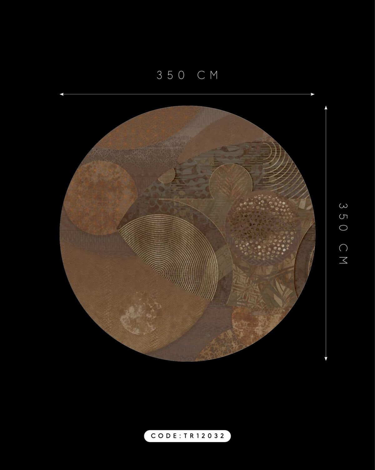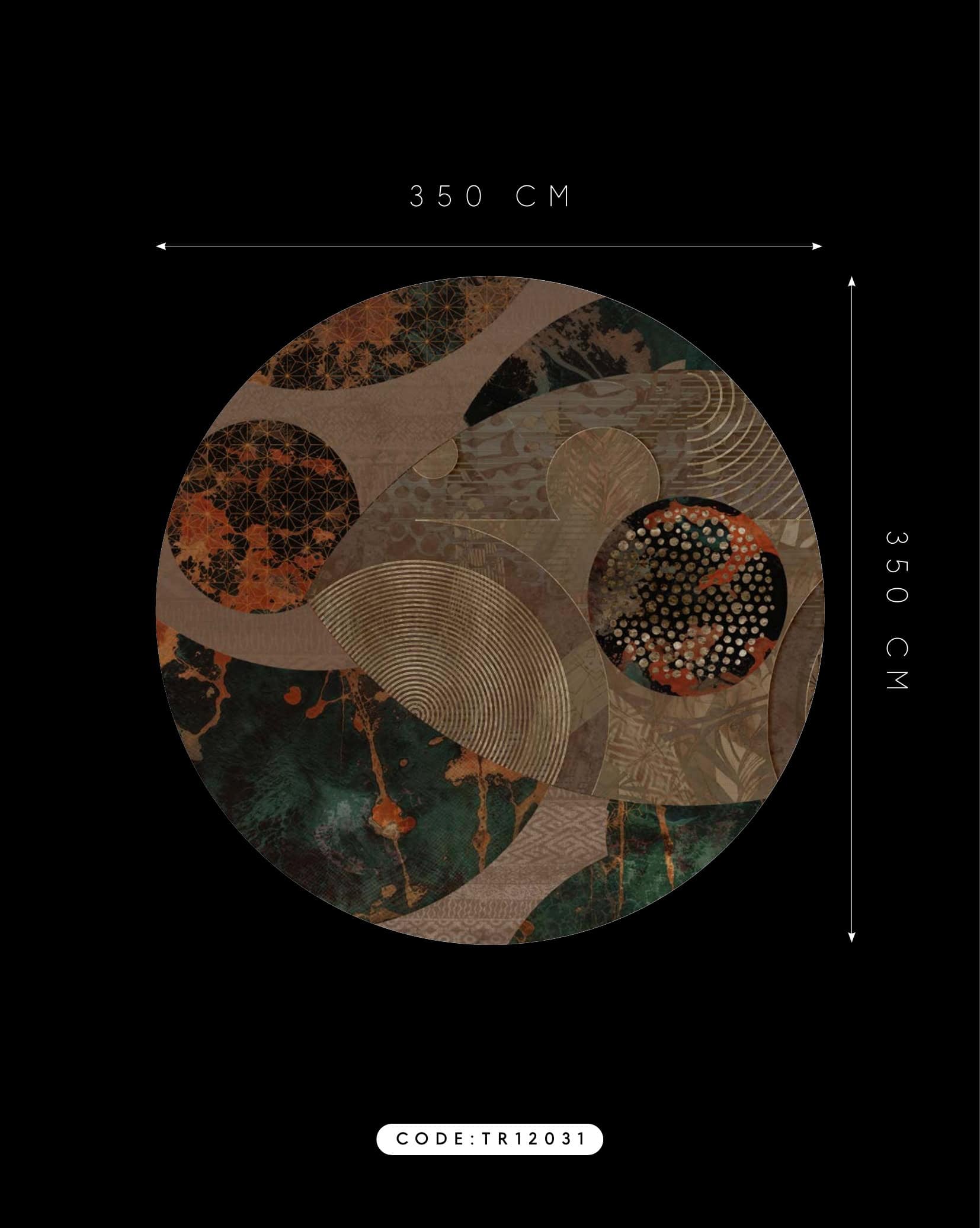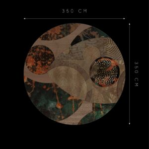 The Requiem is a bespoke rug for commercial projects that orchestrates oxidised copper, verdigris teal, warm sandstone and intricate geometric linework into a composition of quiet grandeur. Overlapping circular forms are filled with fine radiating lines, mosaic textures and organic splatter patterns that evoke patinated metalwork discovered in an ancient observatory. The first colourway (TR12029 / TR12031) balances warm golds and rich teal against earthy browns; the second (TR12030 / TR12032) shifts the emphasis to deeper bronze and muted metallics with cooler green accents. Available as a 400×300 cm rectangular or 350 cm round custom contract rug, The Requiem is a luxury rug for private residences and hospitality interiors that carries the gravitas of a museum-quality art piece. Architects and interior designers specify this contract grade area rug for hotel public spaces, executive lounges and heritage-influenced residential projects where a hospitality rug must balance richness of detail with the grounding warmth of earthen tones.