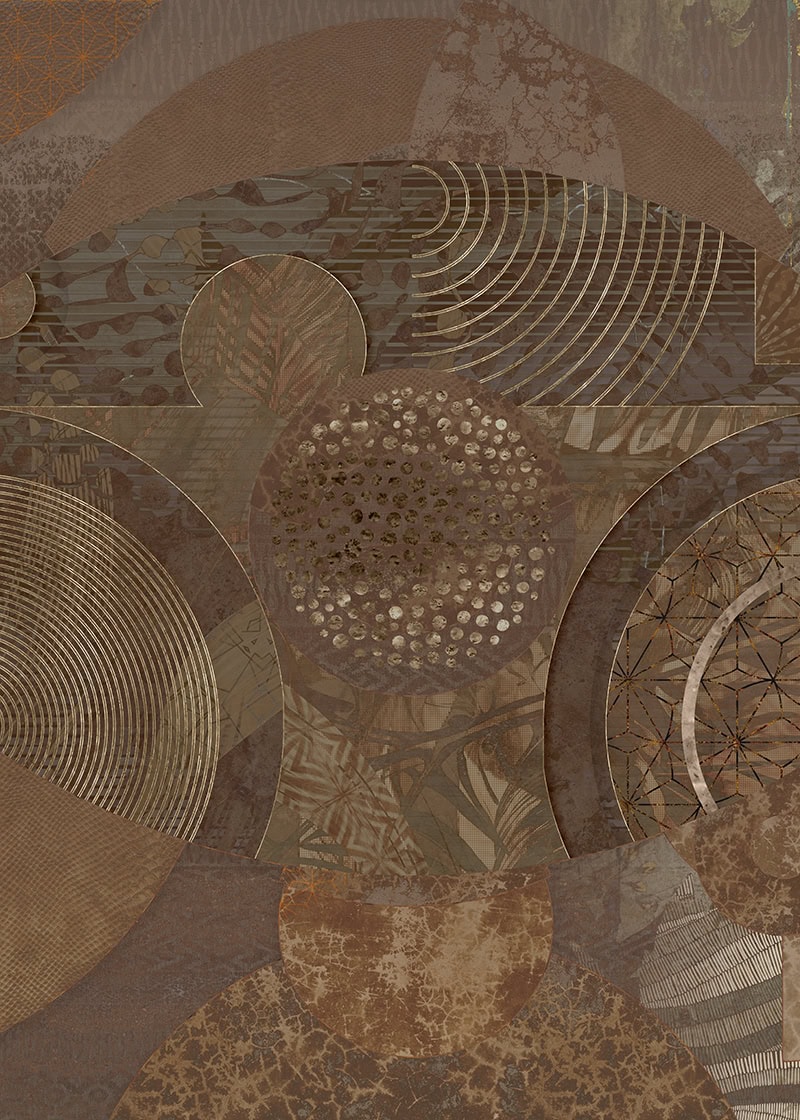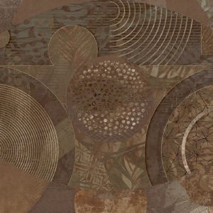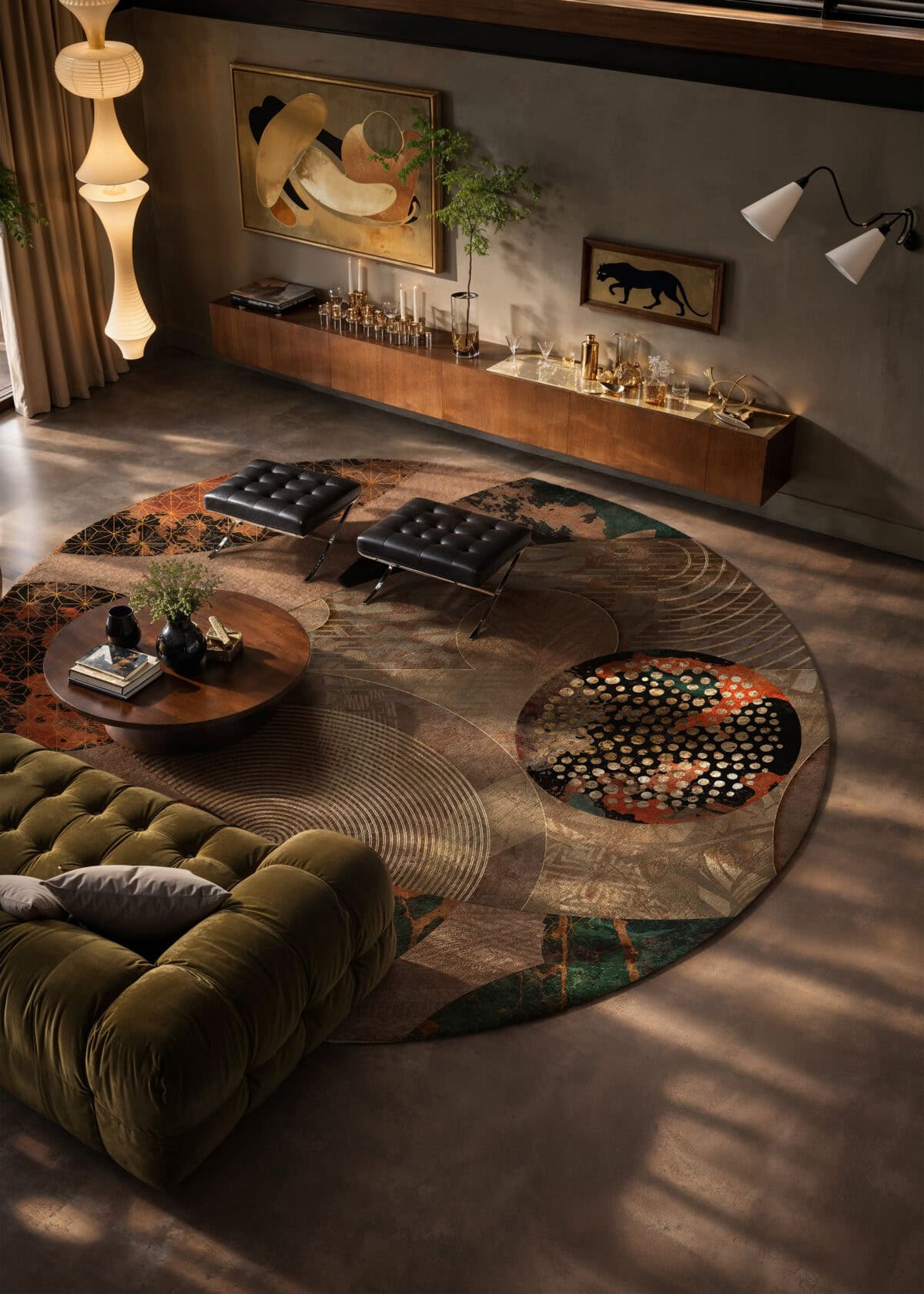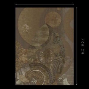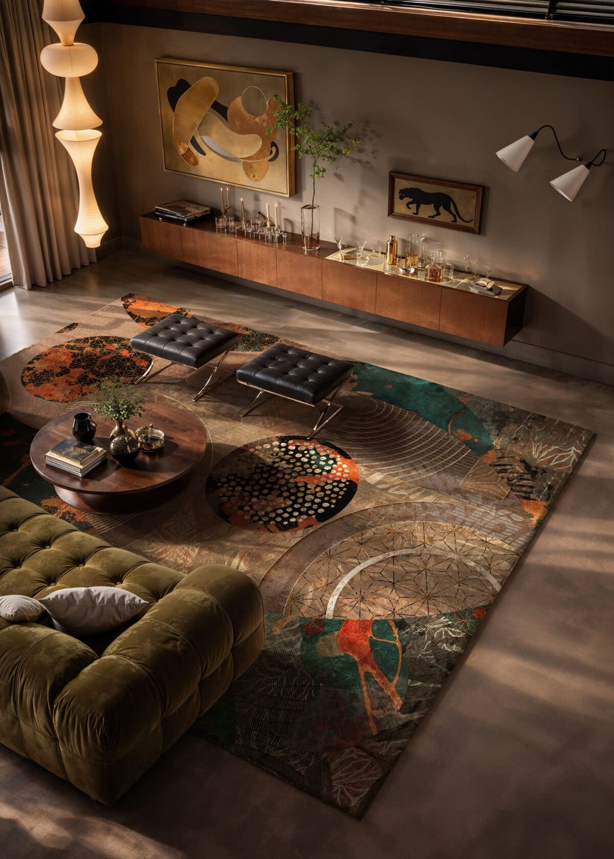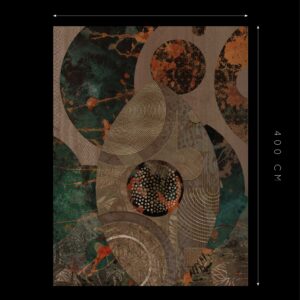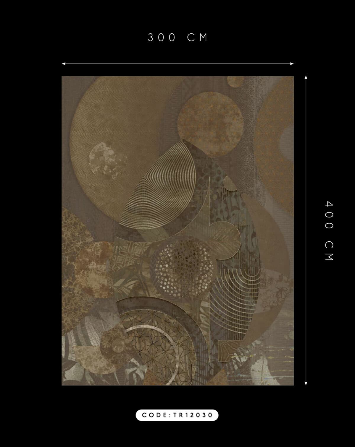 The Requiem is a bespoke rug for commercial projects that orchestrates oxidised copper, verdigris teal, warm sandstone and intricate geometric linework into a composition of quiet grandeur. Overlapping circular forms are filled with fine radiating lines, mosaic textures and organic splatter patterns that evoke patinated metalwork discovered in an ancient observatory. The first colourway (TR12029 / TR12031) balances warm golds and rich teal against earthy browns; the second (TR12030 / TR12032) shifts the emphasis to deeper bronze and muted metallics with cooler green accents. Available as a 400×300 cm rectangular or 350 cm round custom contract rug, The Requiem is a luxury rug for private residences and hospitality interiors that carries the gravitas of a museum-quality art piece. Architects and interior designers specify this contract grade area rug for hotel public spaces, executive lounges and heritage-influenced residential projects where a hospitality rug must balance richness of detail with the grounding warmth of earthen tones.