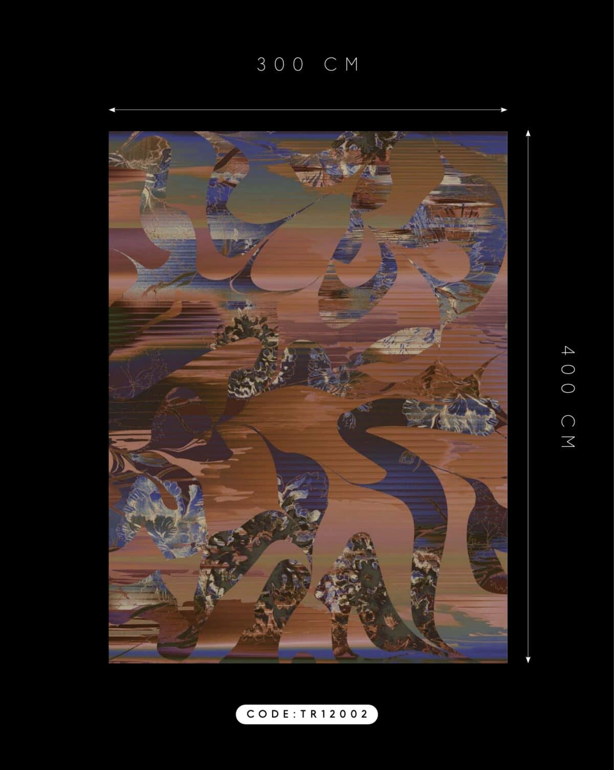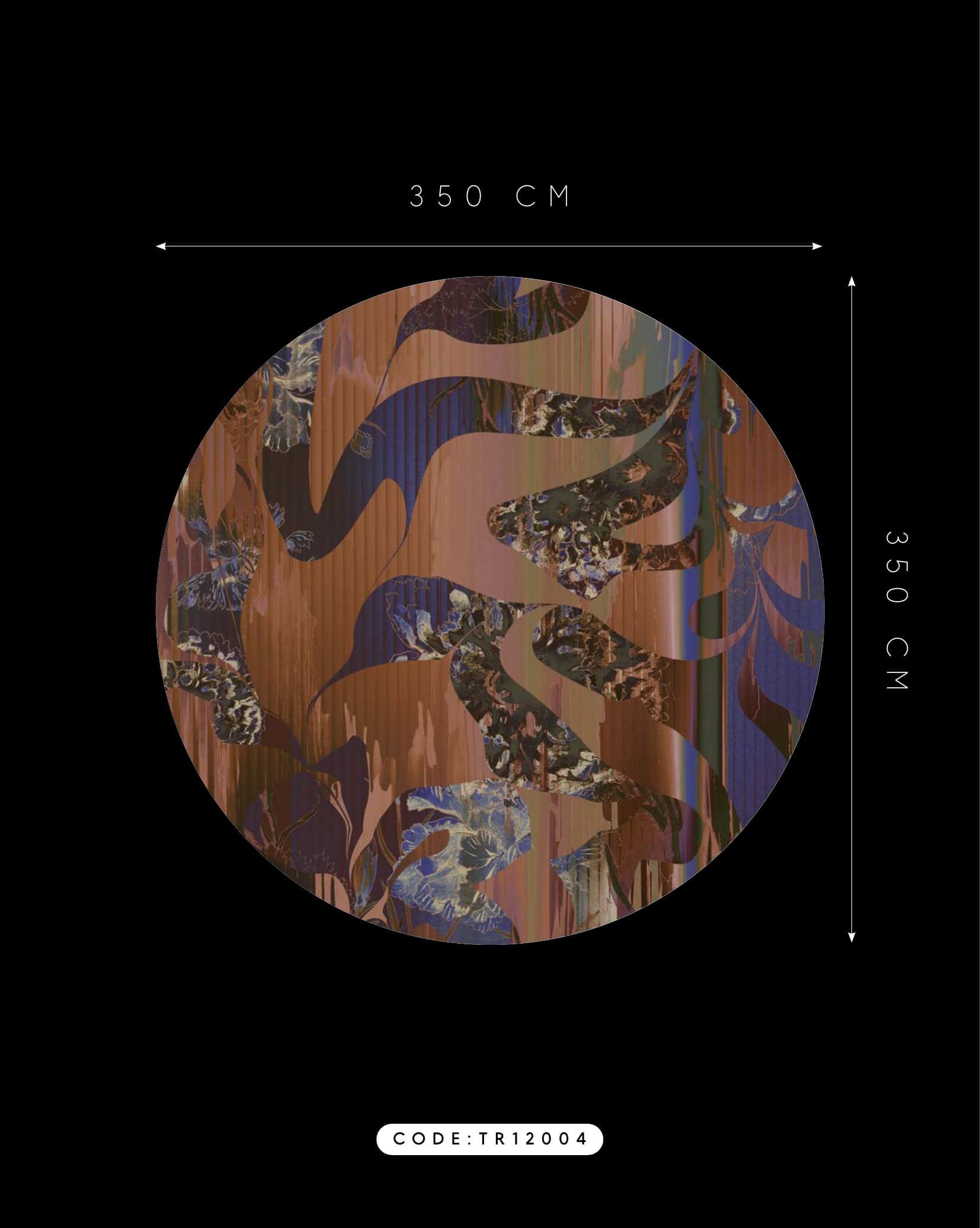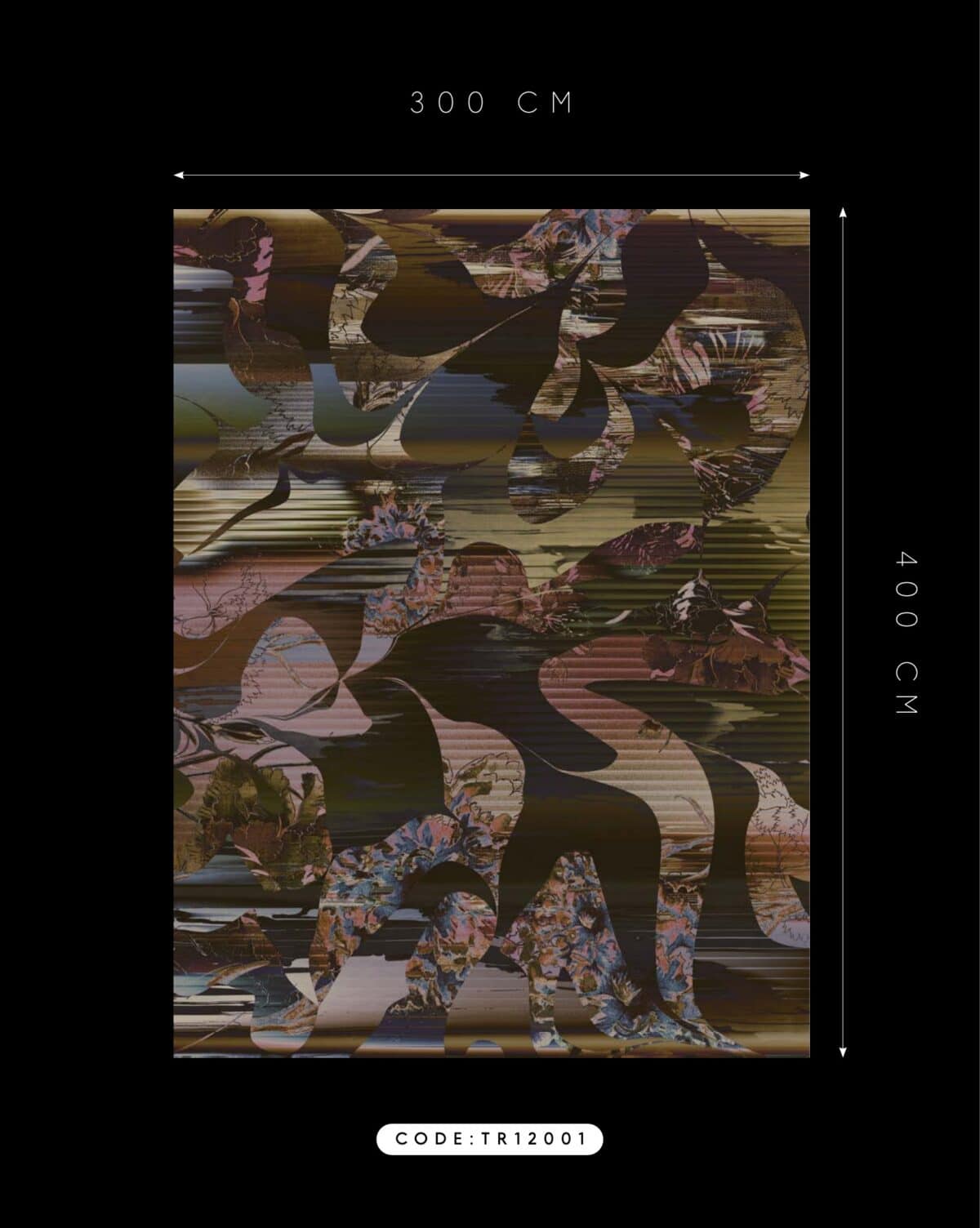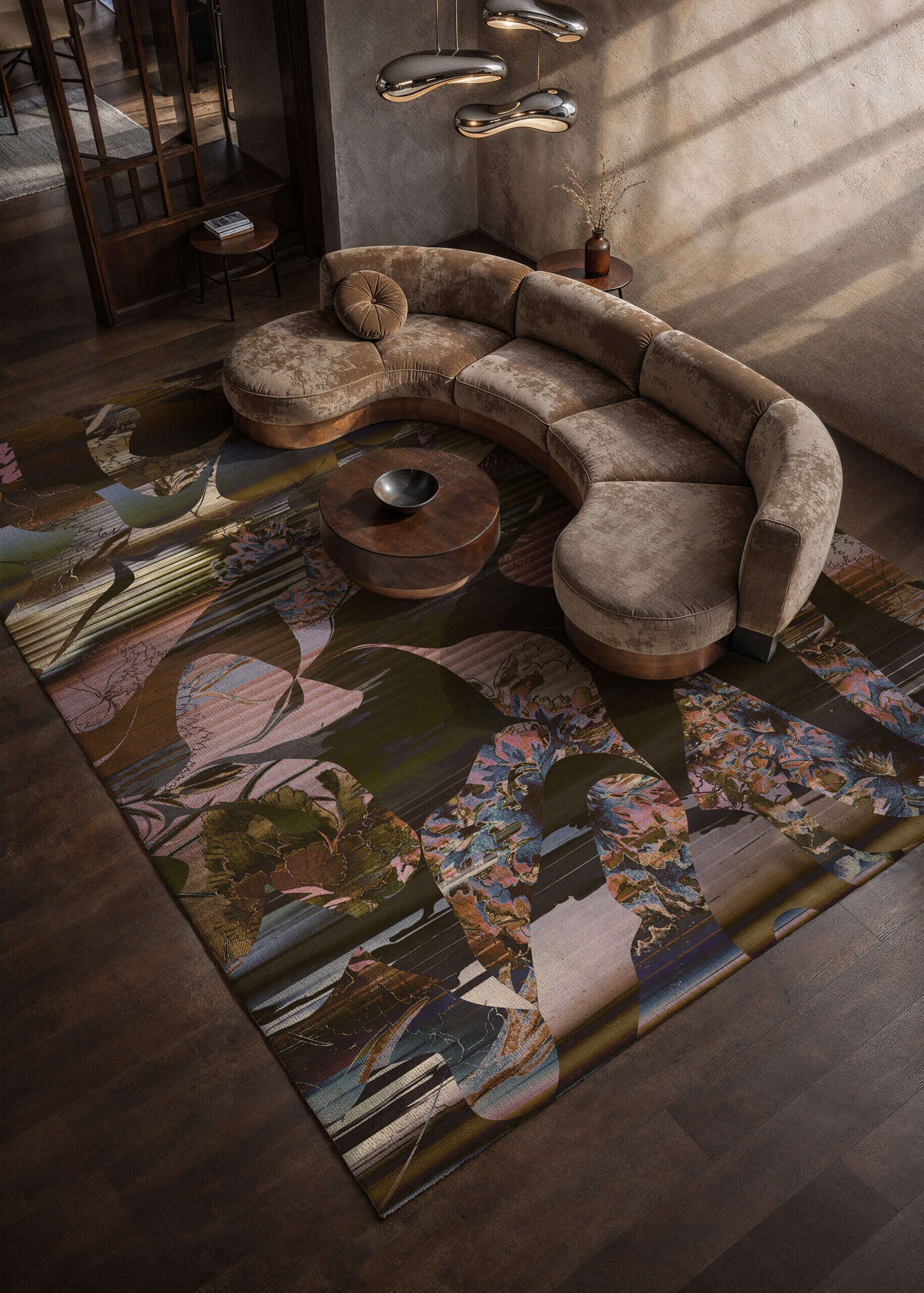 Tokyo Sky is a statement rug for hotel lobbies and luxury residential interiors that layers fragmented botanical silhouettes over a luminous, vertically ribbed ground. Dark organic forms drift across the surface like wind-scattered leaves caught between stained glass and digital collage, revealing bursts of periwinkle blue, dusty rose and gilded olive beneath. The design exists in two distinct colourways: the first (TR12001 / TR12003) moves through deep olive-gold and smoky bronze tones suited to moody, richly furnished hospitality spaces; the second (TR12002 / TR12004) shifts into violet, burnt copper and ultramarine, offering a cooler palette with equal intensity. Available as a 400×300 cm rectangular custom contract rug or a 350 cm round format, Tokyo Sky is a bespoke rug for commercial projects that anchors a room with the confidence of a large-scale art installation. Printed on Tuskara’s Soft Home or Project Essential base, this hospitality rug delivers the visual depth of hand-knotted craftsmanship at contract-grade durability. Ideal for designers specifying a luxury rug for private residences, boutique hotel reception areas or fine dining environments where the floor becomes the focal point of the interior scheme.