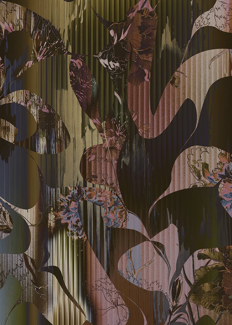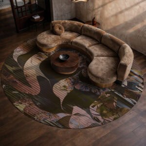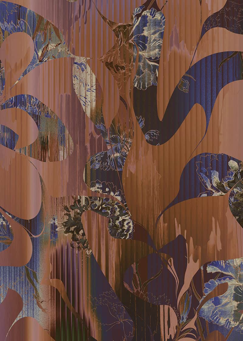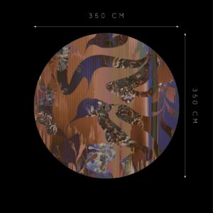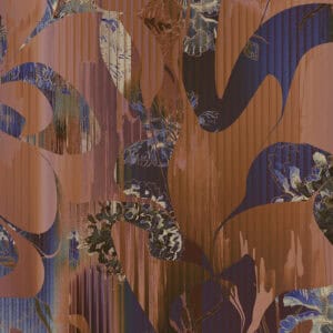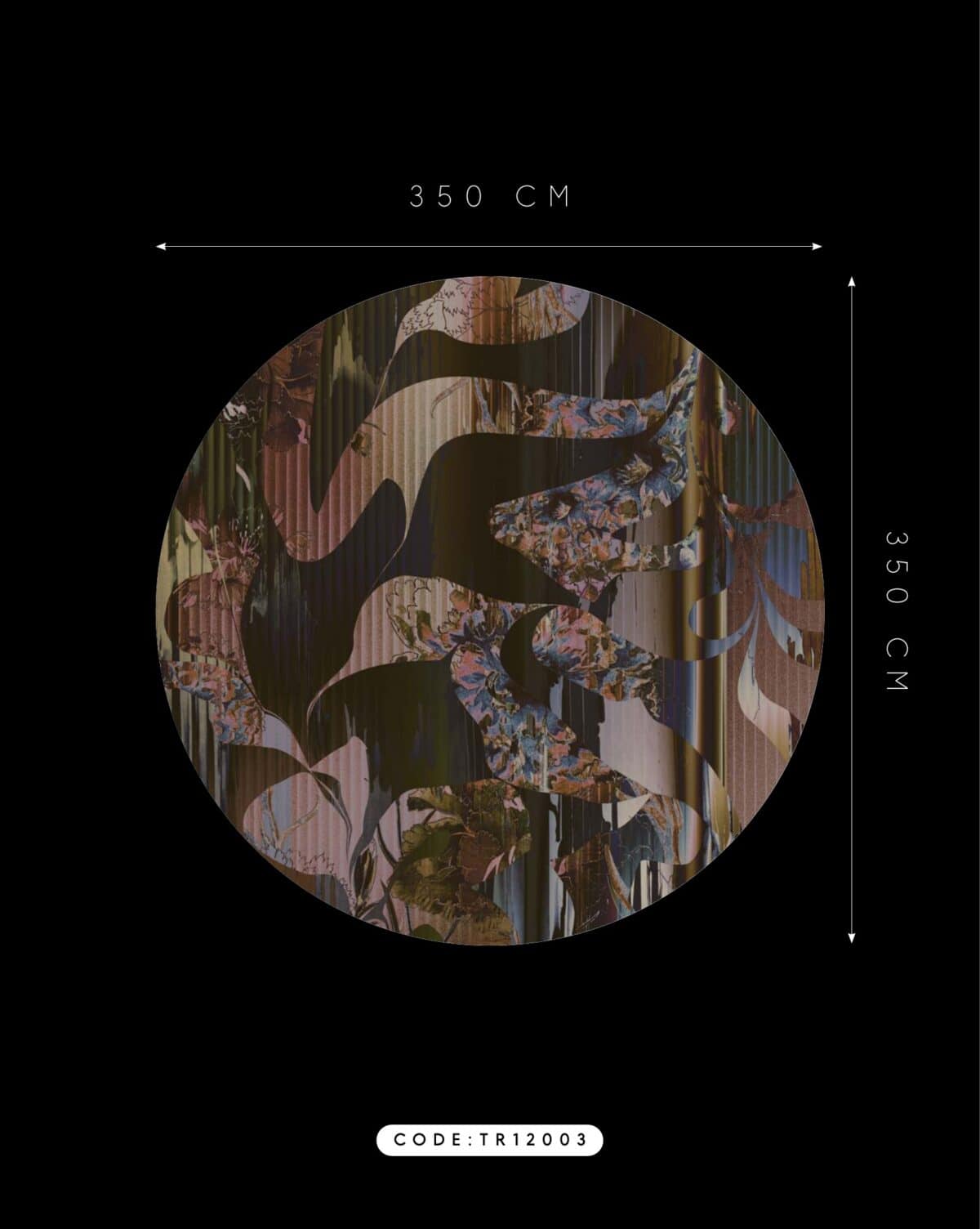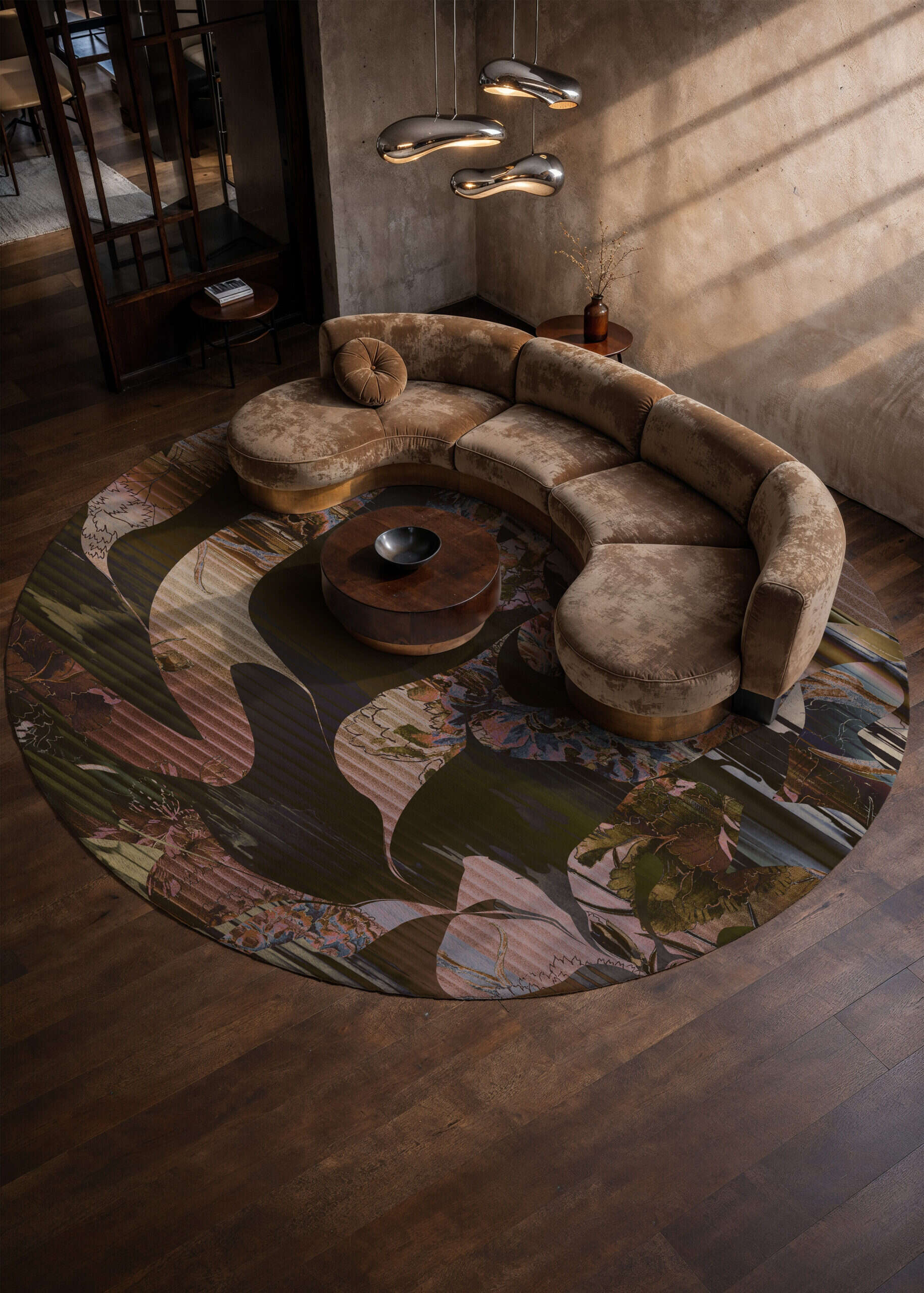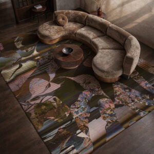 Tokyo Sky is a statement rug for hotel lobbies and luxury residential interiors that layers fragmented botanical silhouettes over a luminous, vertically ribbed ground. Dark organic forms drift across the surface like wind-scattered leaves caught between stained glass and digital collage, revealing bursts of periwinkle blue, dusty rose and gilded olive beneath. The design exists in two distinct colourways: the first (TR12001 / TR12003) moves through deep olive-gold and smoky bronze tones suited to moody, richly furnished hospitality spaces; the second (TR12002 / TR12004) shifts into violet, burnt copper and ultramarine, offering a cooler palette with equal intensity. Available as a 400×300 cm rectangular custom contract rug or a 350 cm round format, Tokyo Sky is a bespoke rug for commercial projects that anchors a room with the confidence of a large-scale art installation. Printed on Tuskara’s Soft Home or Project Essential base, this hospitality rug delivers the visual depth of hand-knotted craftsmanship at contract-grade durability. Ideal for designers specifying a luxury rug for private residences, boutique hotel reception areas or fine dining environments where the floor becomes the focal point of the interior scheme.