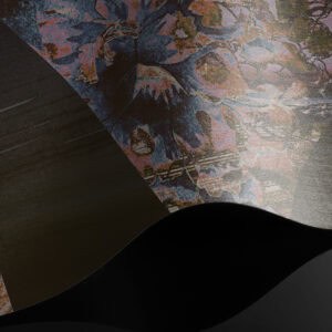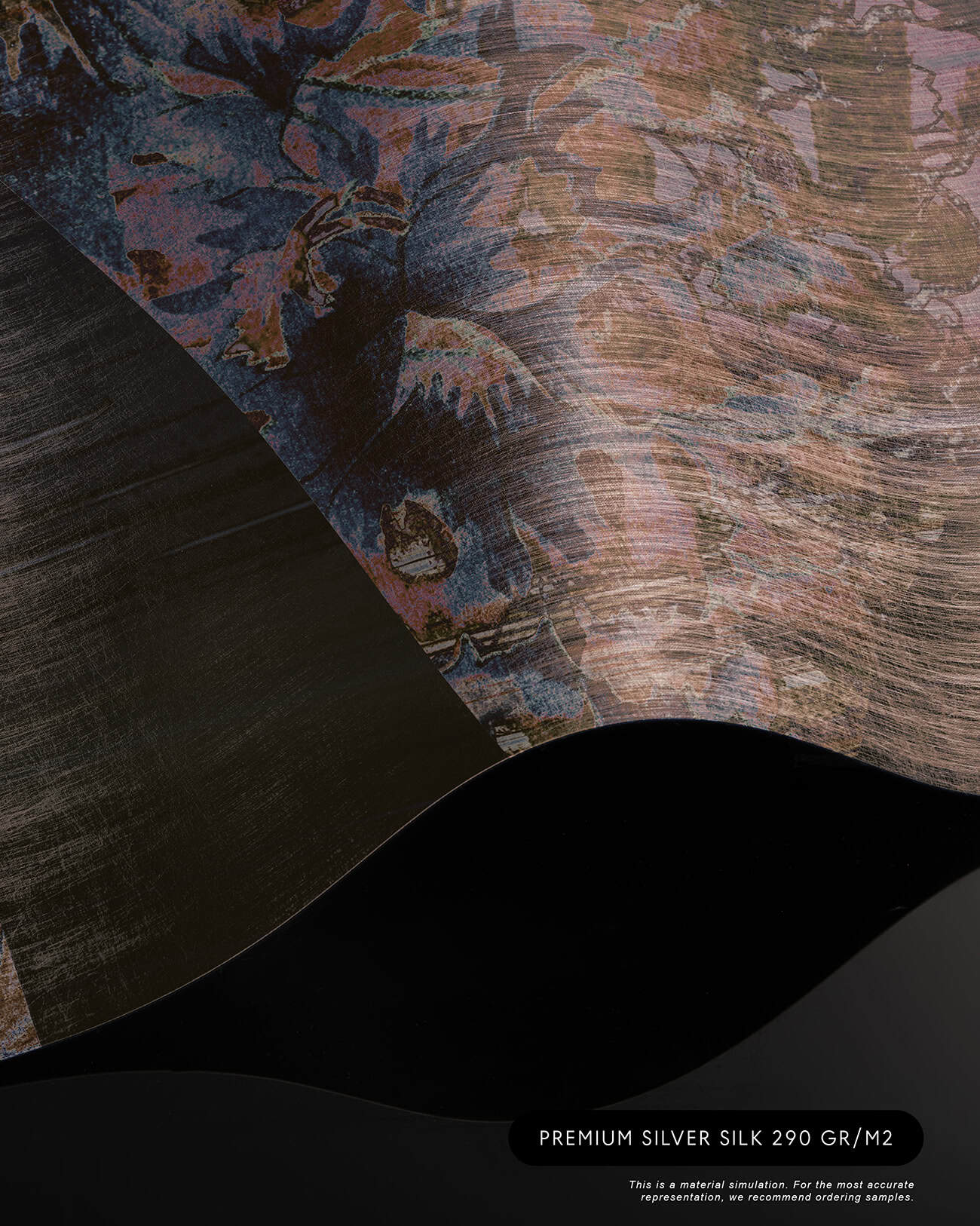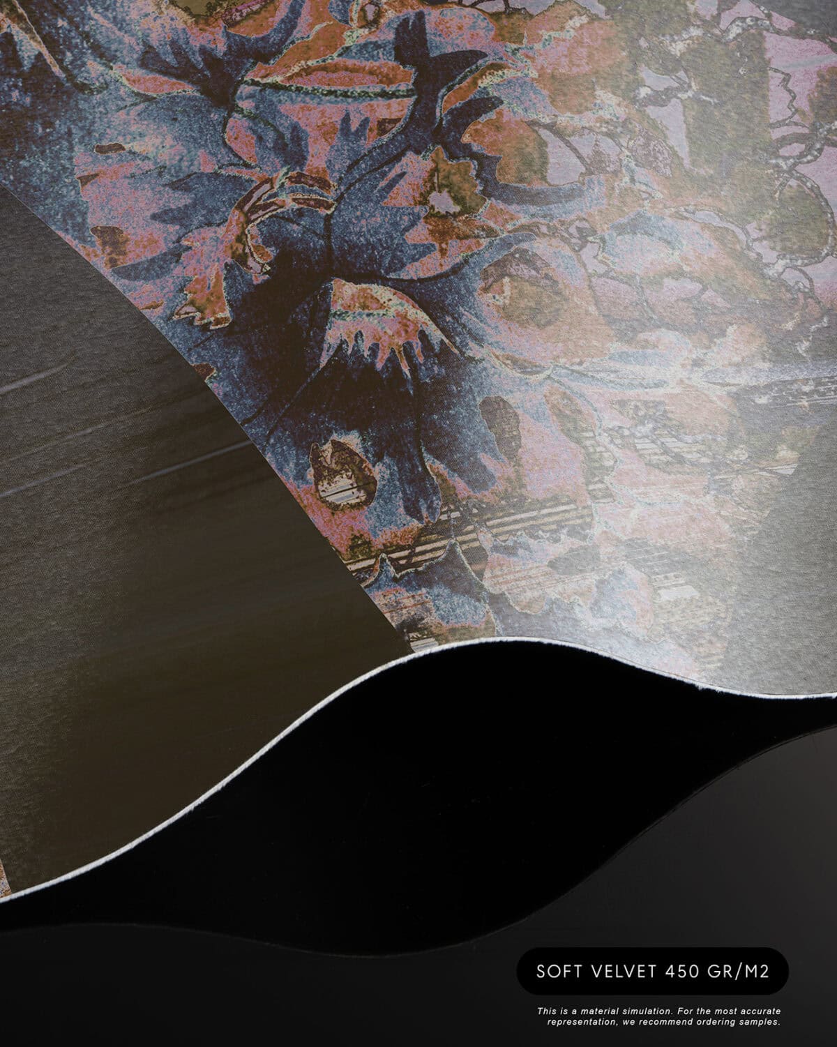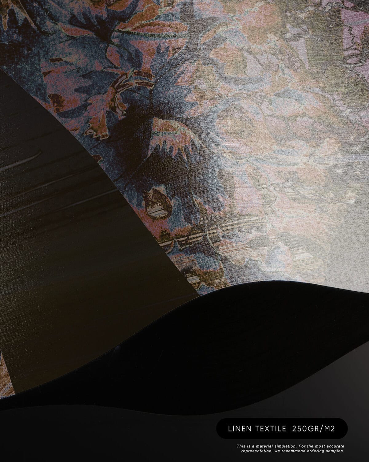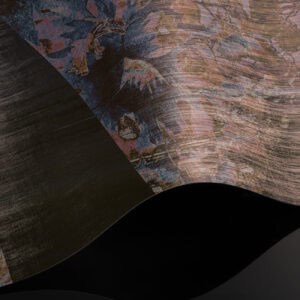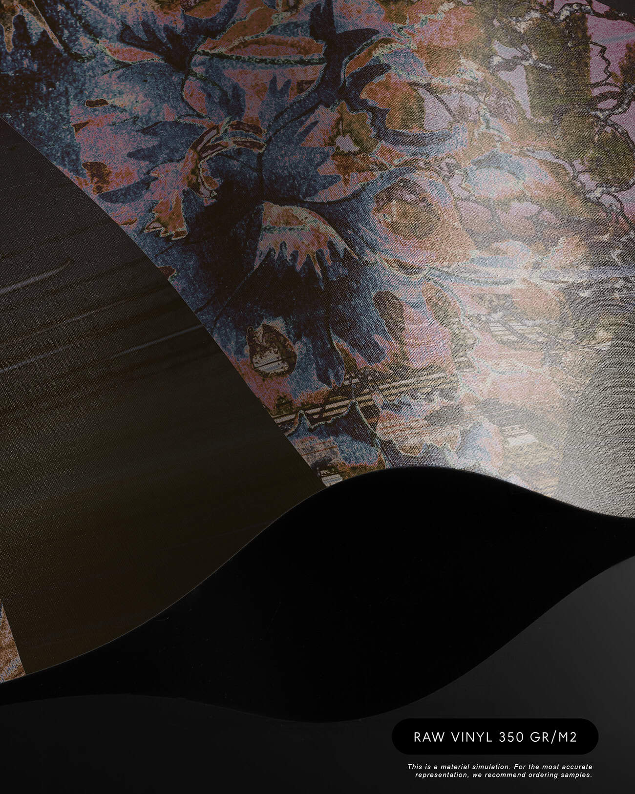 Tokyo Sky is a custom mural for hotel lobbies and creative commercial spaces that captures the vibrant energy of a neon-lit garden at twilight. Oversized abstract leaf silhouettes drift across a corrugated, metallic surface, their interiors alive with fragments of pressed flowers in dusty pink, cobalt blue and copper. The vertical ribbing evokes rain-streaked glass or corrugated metal screens, lending the design an urban, almost industrial edge. This luxury wallcovering for interior designers is made for bold interiors, cocktail bars, creative agency lobbies and modern living rooms where atmosphere and personality are paramount. Produced in extra-wide panoramic format, Tokyo Sky meets hospitality wallcovering specifications while transforming walls into living canvases of colour and texture.