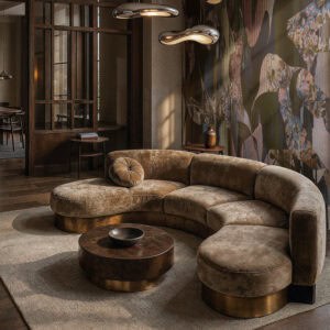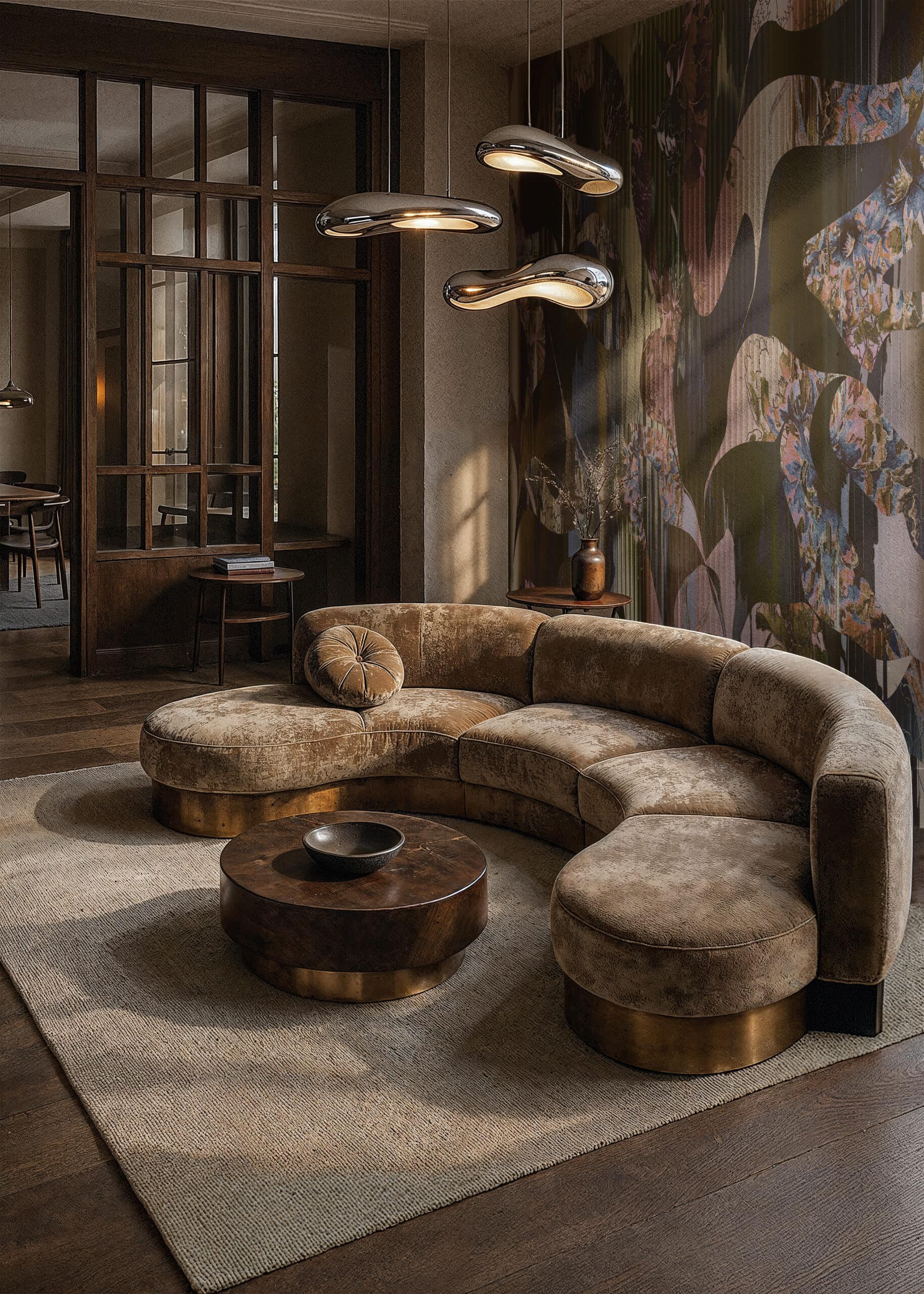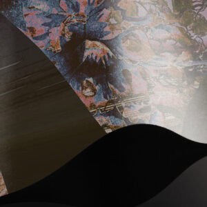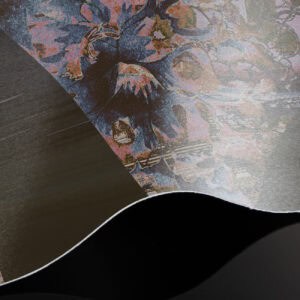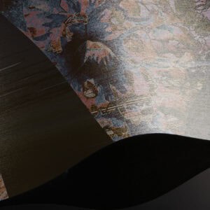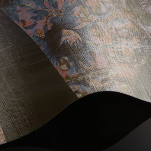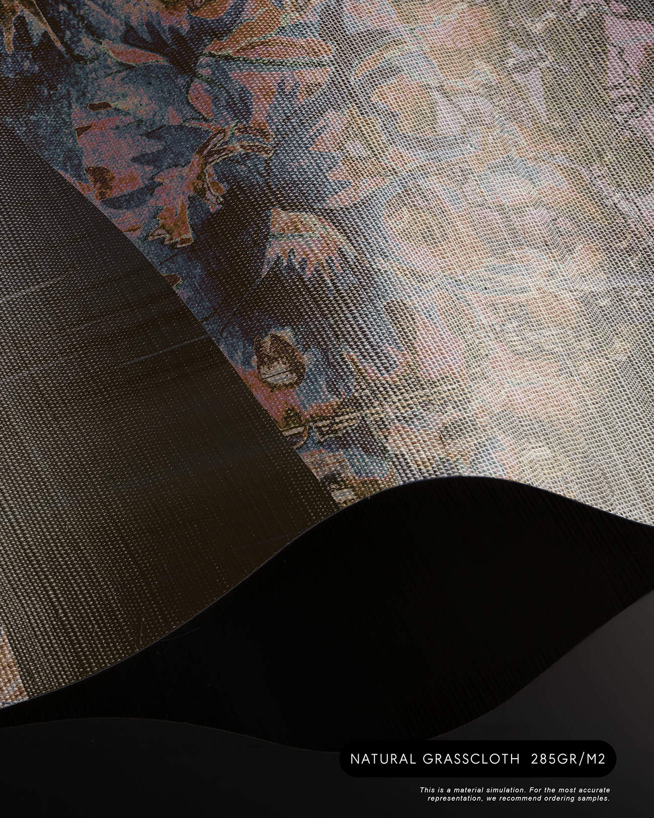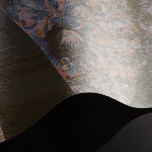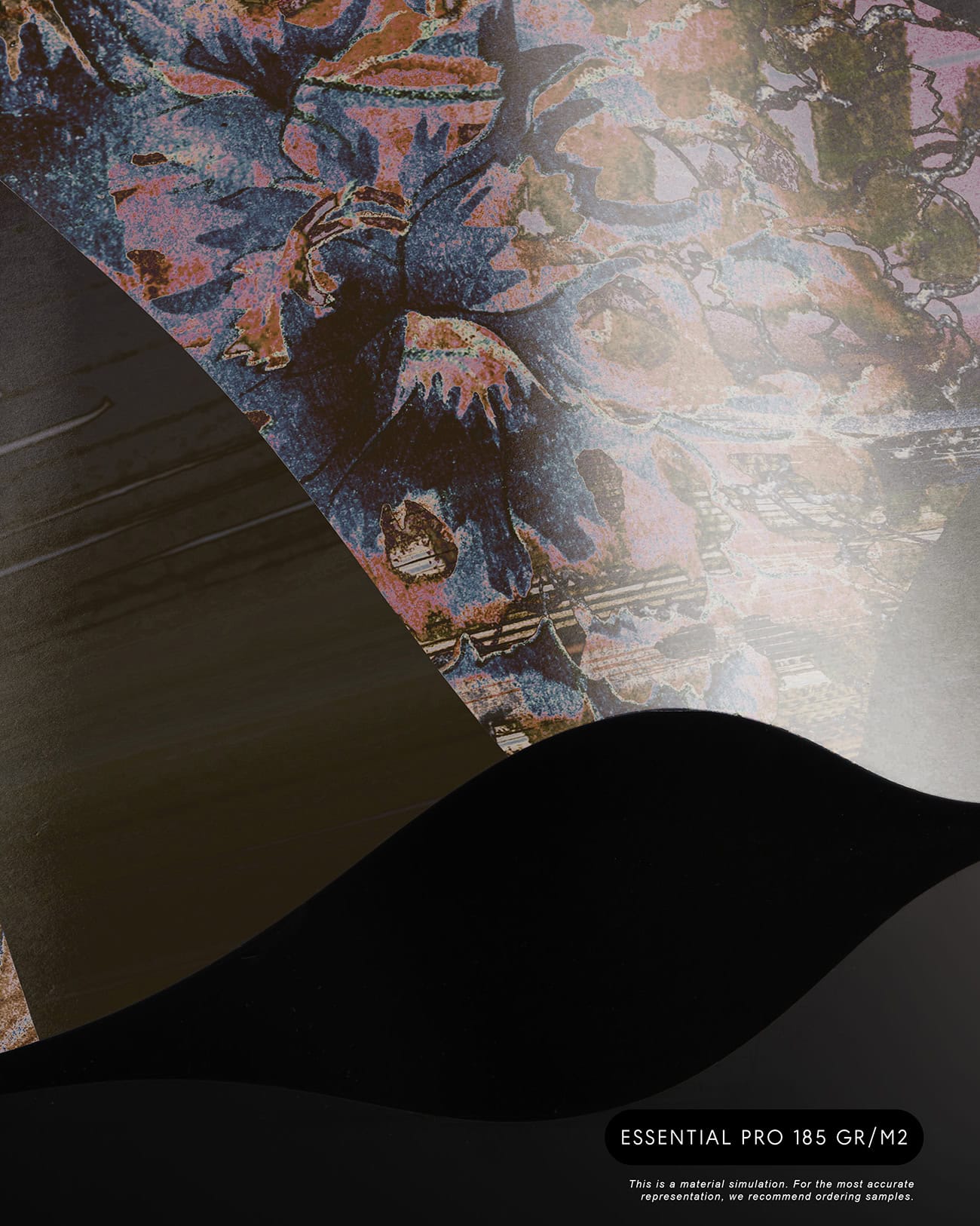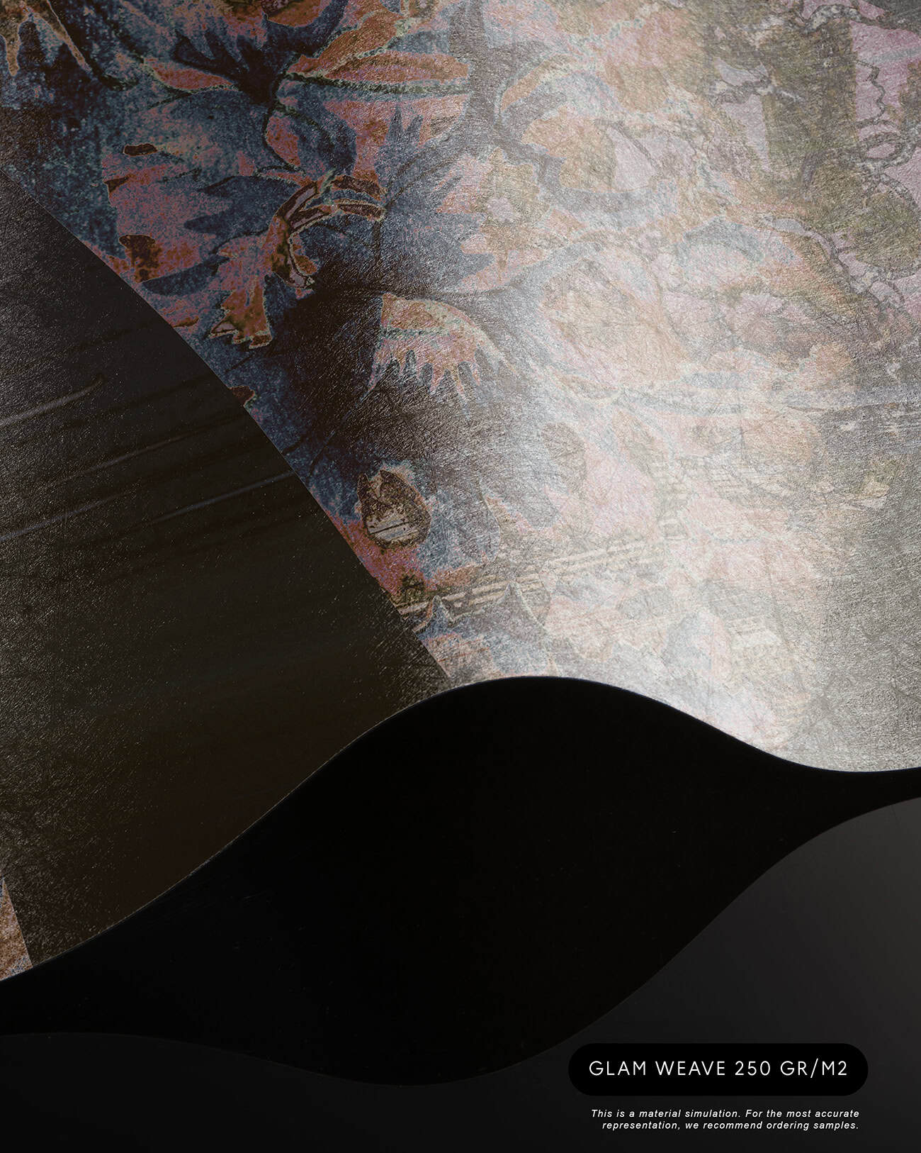 Tokyo Sky is a custom mural for hotel lobbies and creative commercial spaces that captures the vibrant energy of a neon-lit garden at twilight. Oversized abstract leaf silhouettes drift across a corrugated, metallic surface, their interiors alive with fragments of pressed flowers in dusty pink, cobalt blue and copper. The vertical ribbing evokes rain-streaked glass or corrugated metal screens, lending the design an urban, almost industrial edge. This luxury wallcovering for interior designers is made for bold interiors, cocktail bars, creative agency lobbies and modern living rooms where atmosphere and personality are paramount. Produced in extra-wide panoramic format, Tokyo Sky meets hospitality wallcovering specifications while transforming walls into living canvases of colour and texture.