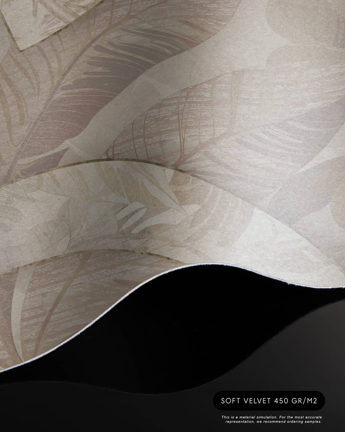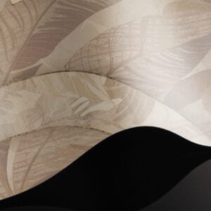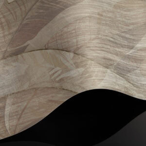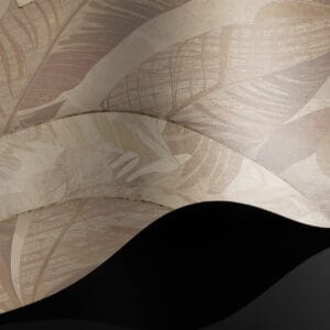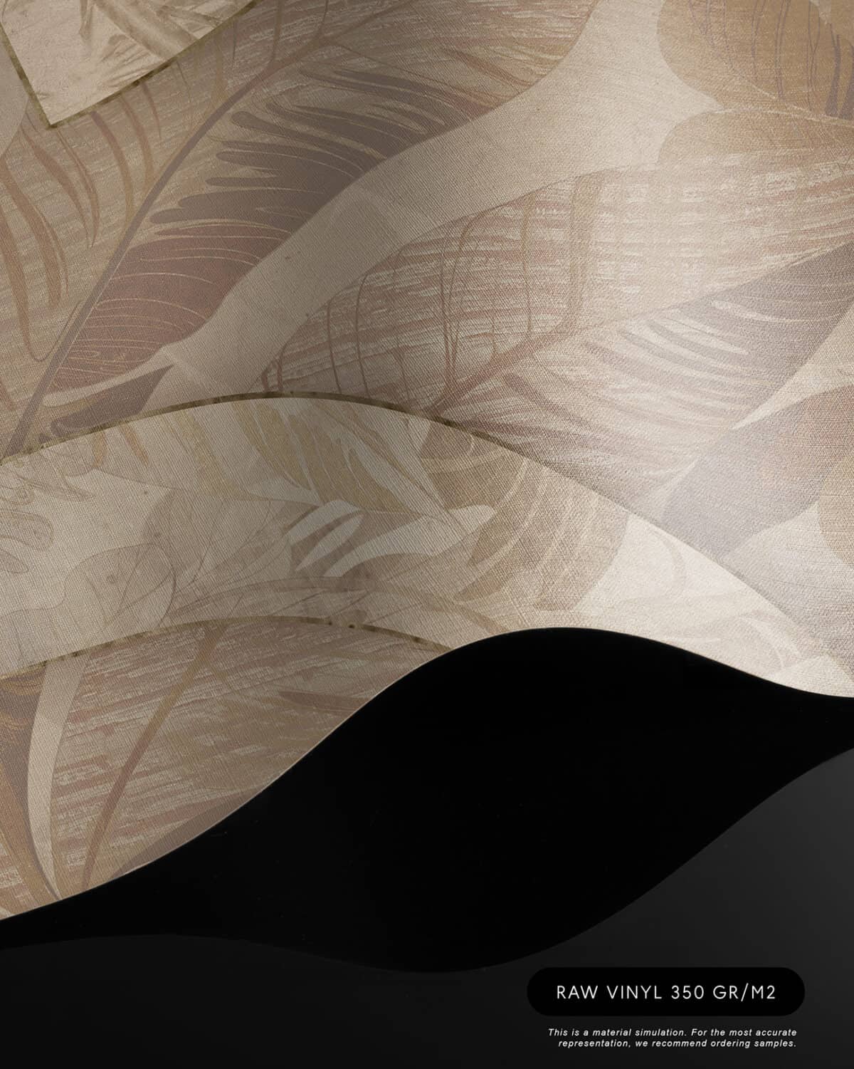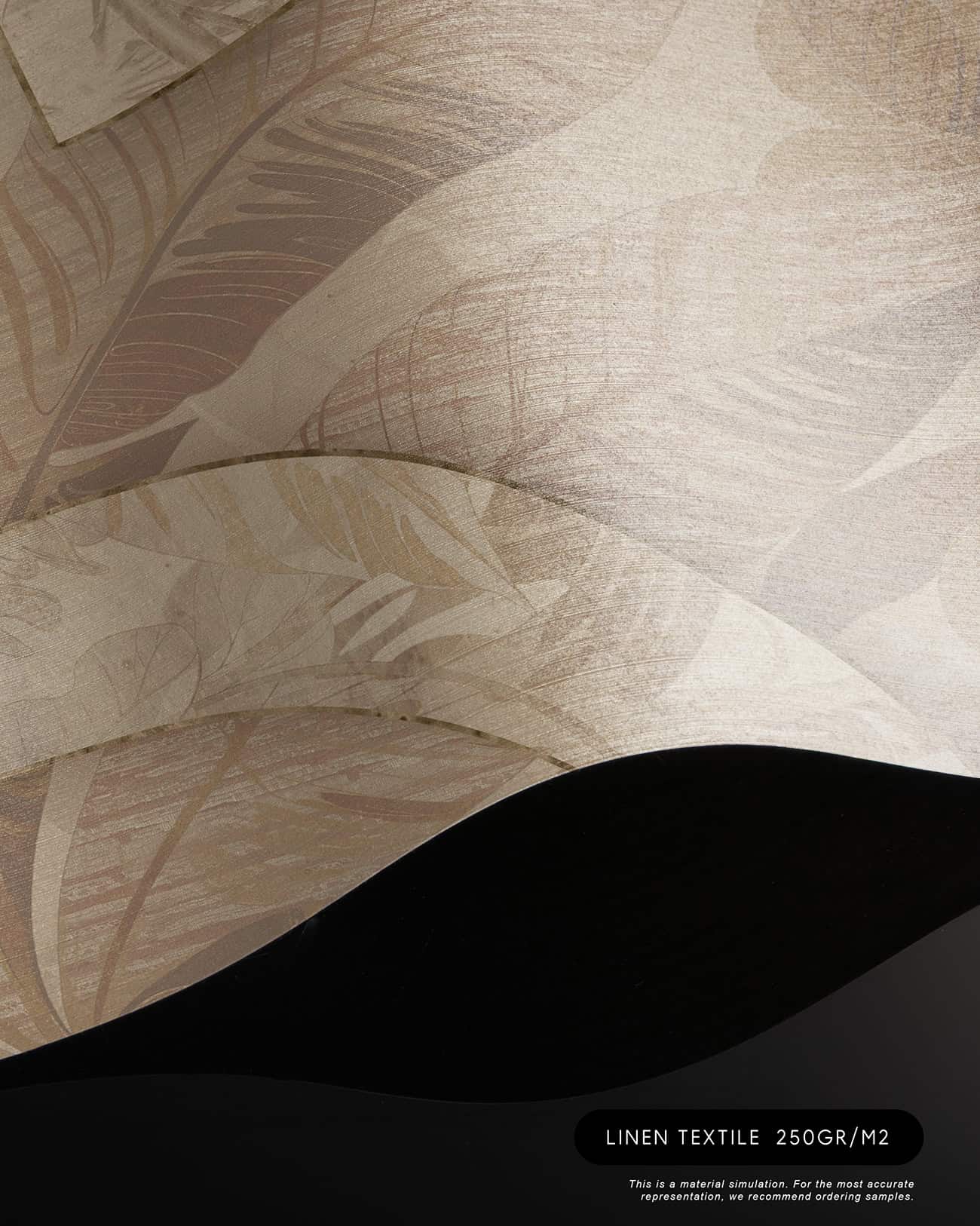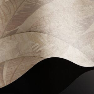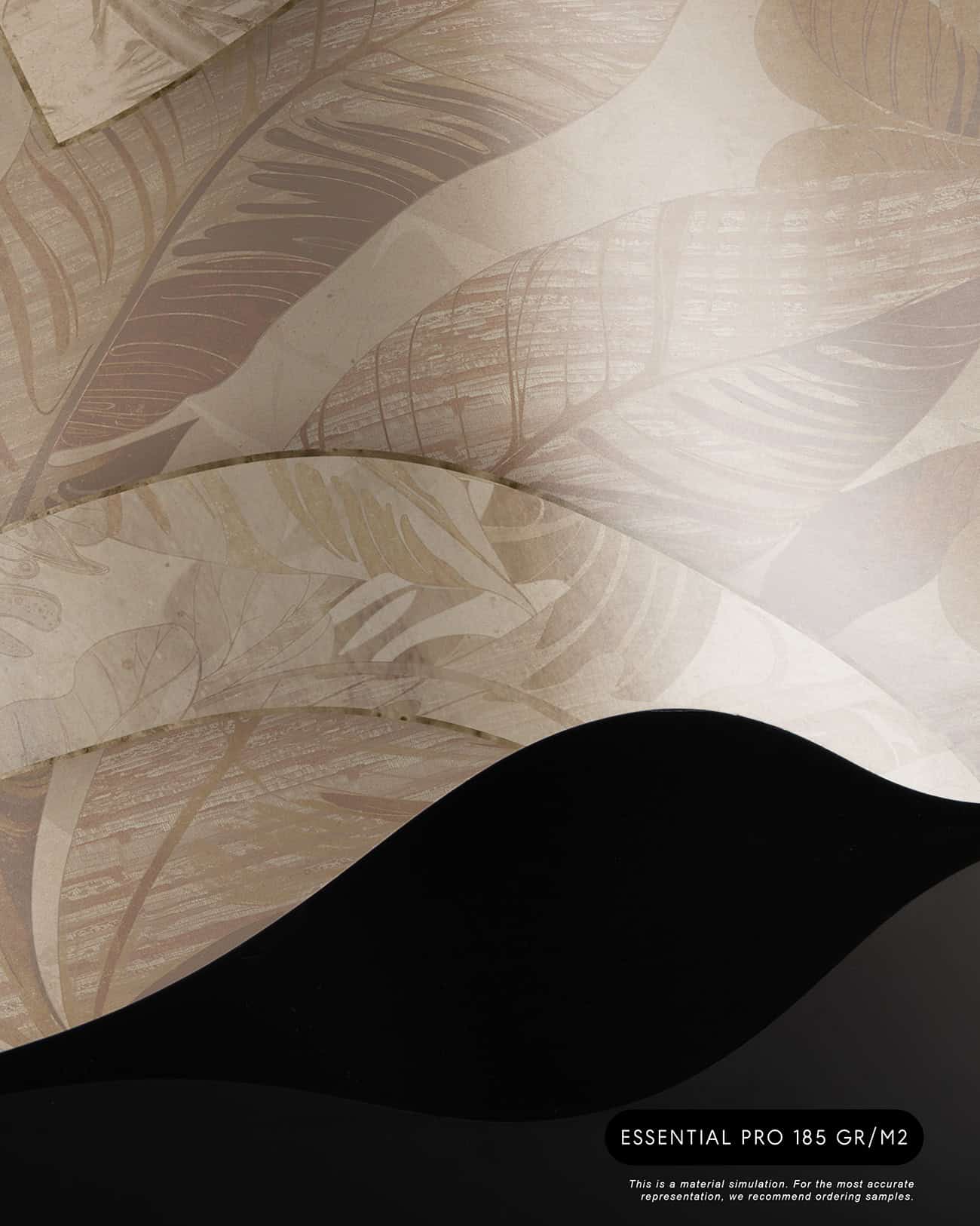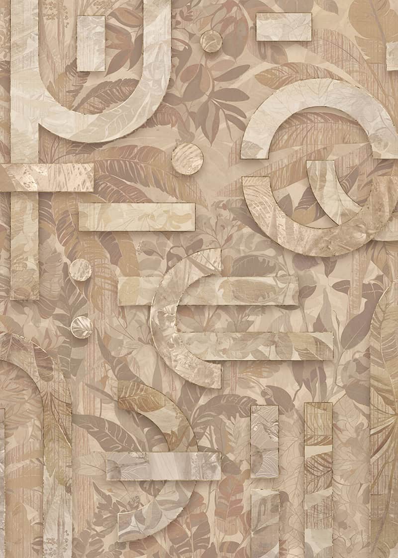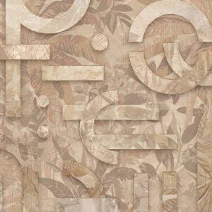 Yoka is a sculptural architectural wallcovering that brings the tactile beauty of carved stone to a flat surface. Raised geometric forms, arcs, cylinders, rectangles and hemispheres, appear to emerge from the wall in warm sandstone, cream, honey and soft taupe tones. Botanical leaf imprints are embedded into the stone-like texture, blending organic and architectural elements with quiet sophistication. This bespoke mural for residential projects is crafted for spaces that call for understated luxury: spa lobbies, luxury show homes and refined commercial interiors. Its muted, earthy palette and relief-like depth make it a distinctive high-end interior finish wallpaper that architects and interior designers can specify with confidence for both hospitality and private villa installations.