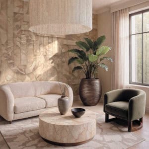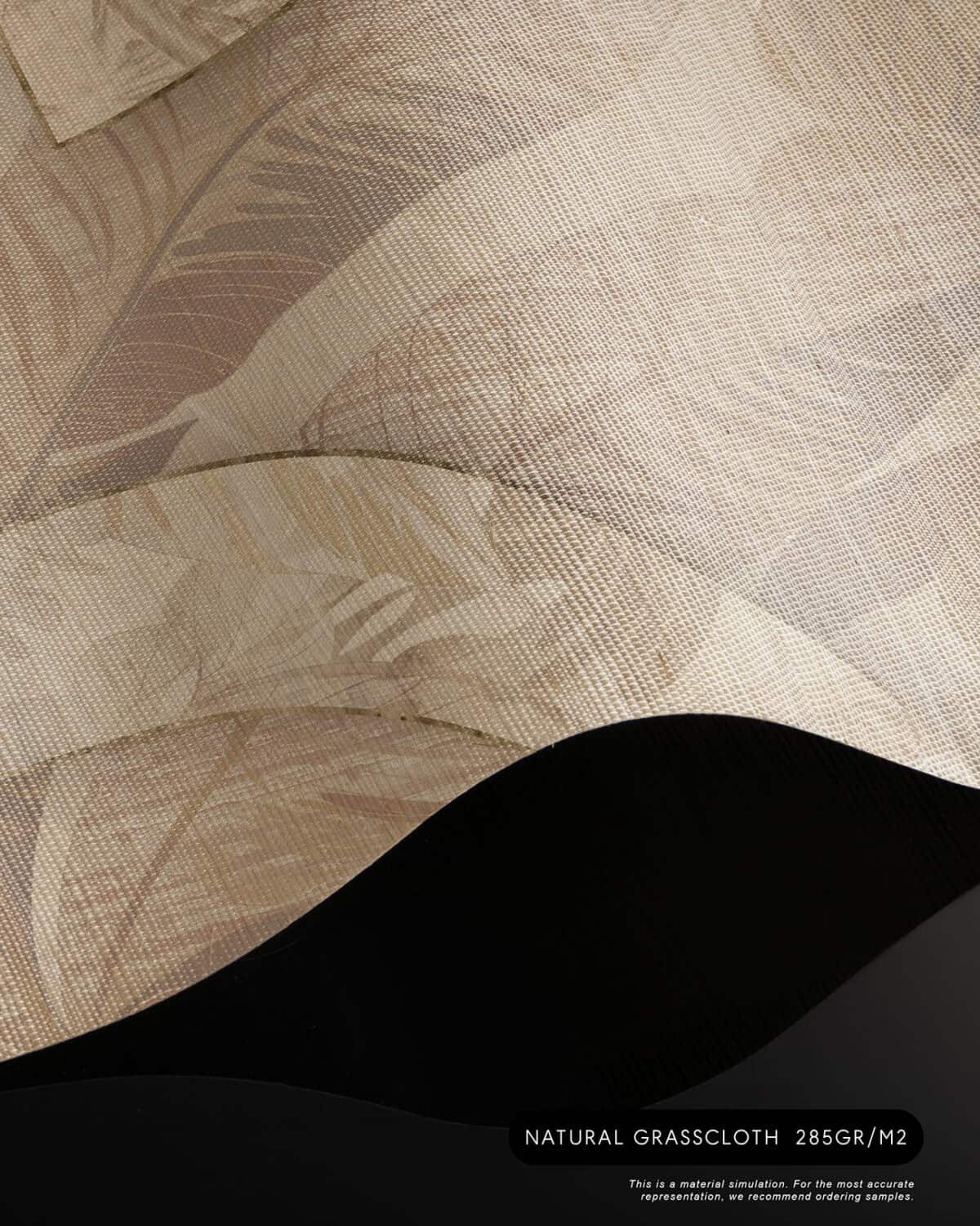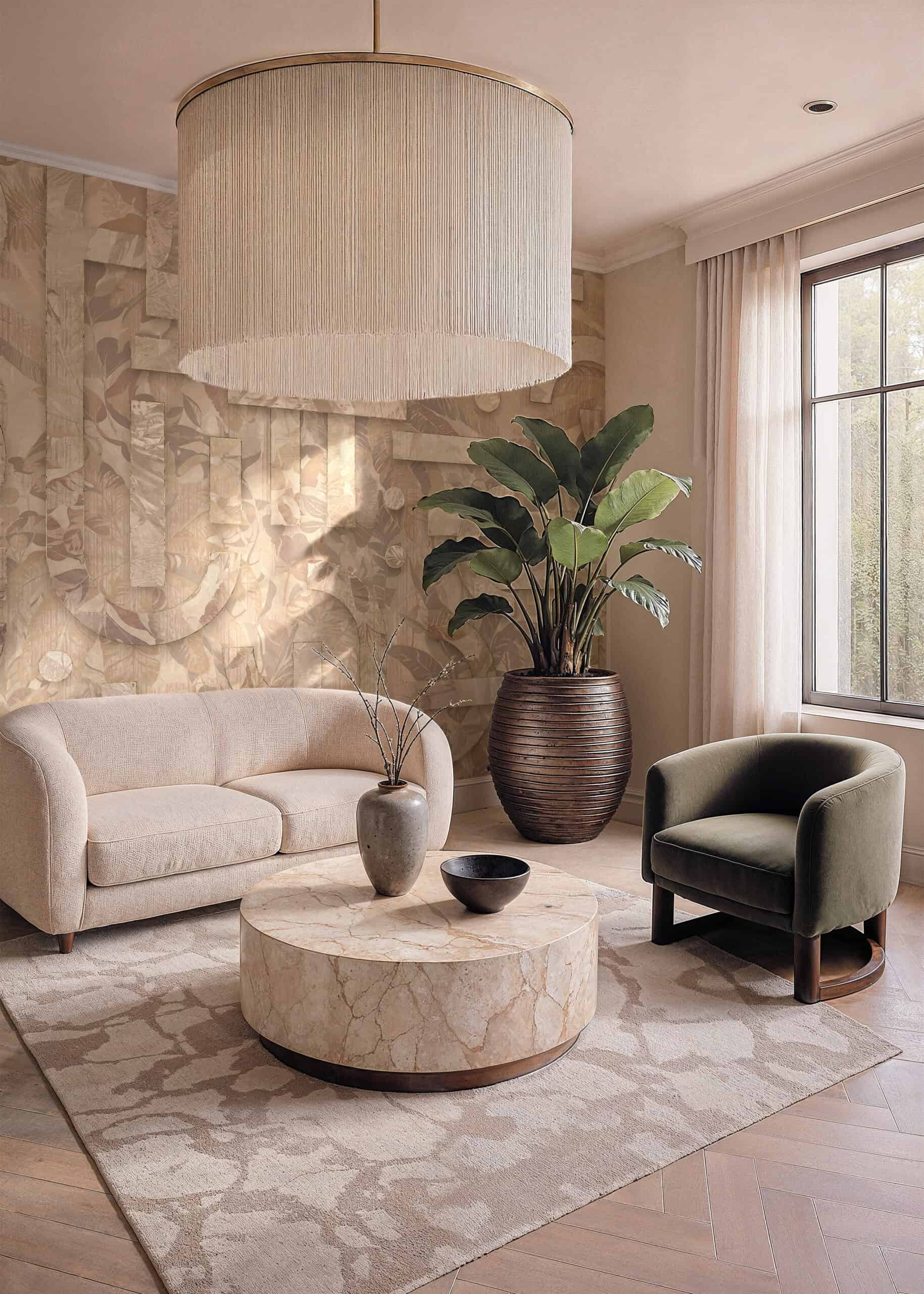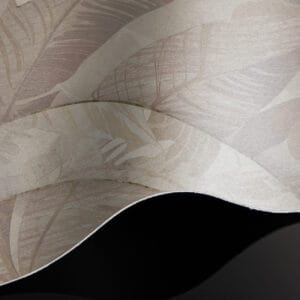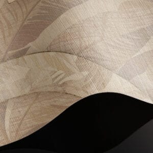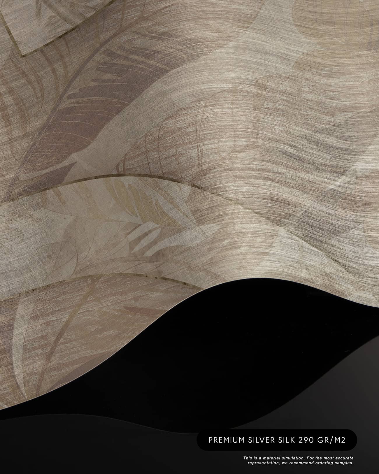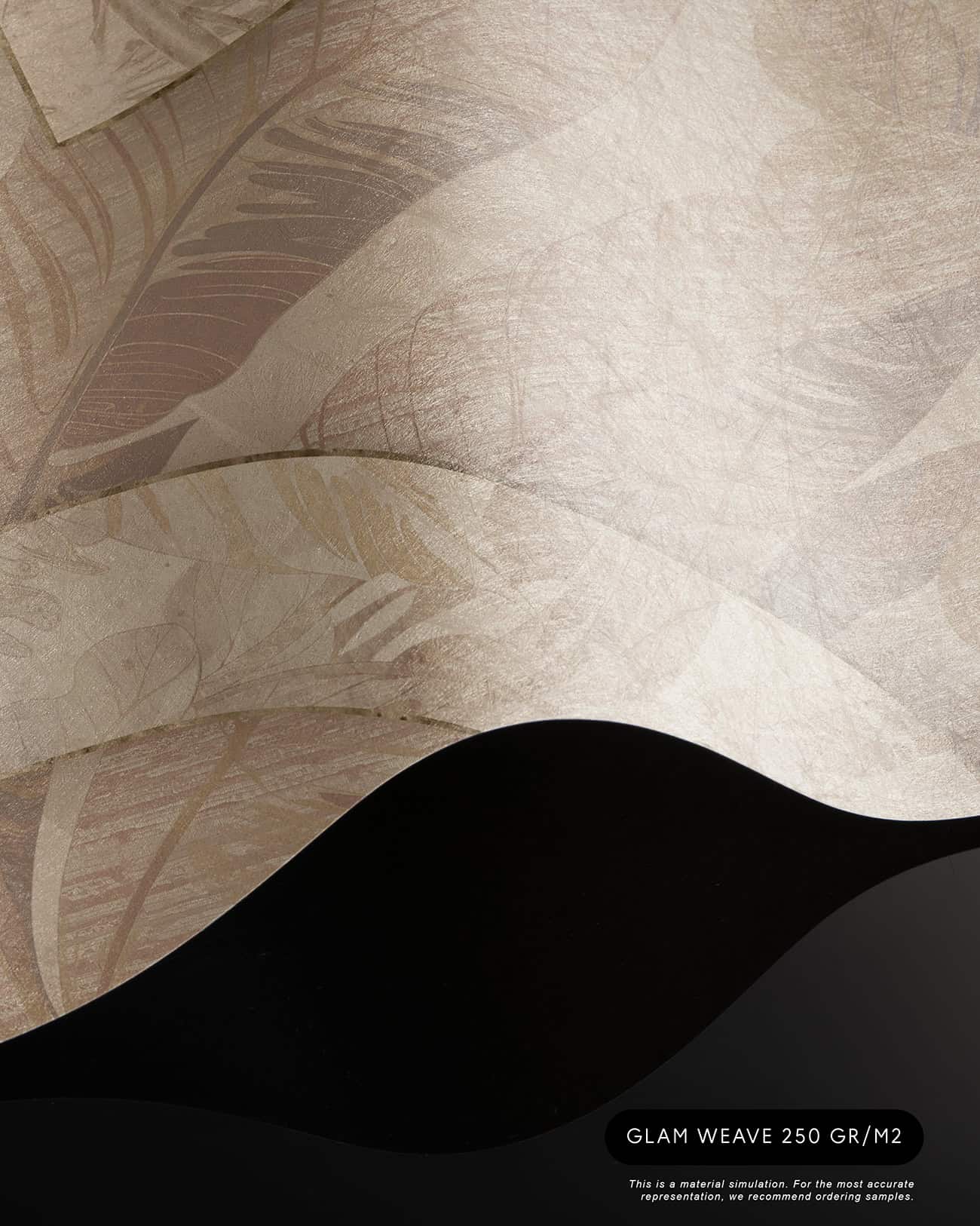 Yoka is a sculptural architectural wallcovering that brings the tactile beauty of carved stone to a flat surface. Raised geometric forms, arcs, cylinders, rectangles and hemispheres, appear to emerge from the wall in warm sandstone, cream, honey and soft taupe tones. Botanical leaf imprints are embedded into the stone-like texture, blending organic and architectural elements with quiet sophistication. This bespoke mural for residential projects is crafted for spaces that call for understated luxury: spa lobbies, luxury show homes and refined commercial interiors. Its muted, earthy palette and relief-like depth make it a distinctive high-end interior finish wallpaper that architects and interior designers can specify with confidence for both hospitality and private villa installations.
